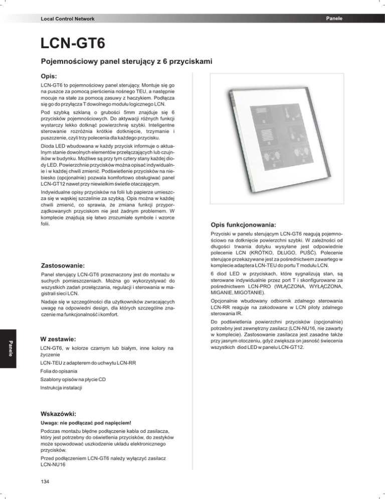 LCN-GT6 Pojemnoœciowy panel steruj¹cy z 6 przyciskami Opis: LCN-GT6 to pojemnoœciowy panel steruj¹cy. Montuje siê go na puszce za pomoc¹ pierœcienia noœnego TEU, a nastêpnie mocuje na sta³e za pomoc¹ zasuwy z haczykiem. Pod³¹cza siê go do przy³¹cza T dowolnego modu³u logicznego LCN. Pod szybk¹ szklan¹ o gruboœci 5mm znajduje siê 6 przycisków pojemnoœciowych. Do aktywacji ró¿nych funkcji wystarczy lekko dotkn¹æ powierzchniê szybki. Inteligentne sterowanie rozró¿nia krótkie dotkniêcie, trzymanie i puszczenie, czyli trzy polecenia dla ka¿dego przycisku. Dioda LED wbudowana w ka¿dy przycisk informuje o aktualnym stanie dowolnych elementów prze³¹czaj¹cych lub czujników w budynku. Mo¿liwe s¹ przy tym cztery stany ka¿dej diody LED. Powierzchnie przycisków mo¿na opisaæ indywidualnie i w ka¿dej chwili zmieniæ. Podœwietlenie przycisków na niebiesko (opcjonalnie) pozwala komfortowo obs³ugiwaæ panel LCN-GT12 nawet przy niewielkim œwietle otaczaj¹cym. Indywidualne opisy przycisków na folii lub papierze umieszcza siê w w¹skiej szczelinie za szybk¹. Opis mo¿na w ka¿dej chwili zmieniæ, co sprawia, ¿e zmiana funkcji przyporz¹dkowanych przyciskom nie jest ¿adnym problemem. W komplecie znajduj¹ siê ³atwo zrozumia³e symbole i wzorce folii. Opis funkcjonowania: Zastosowanie: Przyciski w panelu steruj¹cym LCN-GT6 reaguj¹ pojemnoœciowo na dotkniêcie powierzchni szybki. W zale¿noœci od d³ugoœci trwania dotyku wysy³ane jest odpowiednie polecenie LCN (KRÓTKO, D£UGO, PUŒÆ). Polecenie steruj¹ce przekazywane jest za poœrednictwem zawartego w komplecie adaptera LCN-TEU do portu T modu³u LCN. Panel steruj¹cy LCN-GT6 przeznaczony jest do monta¿u w suchych pomieszczeniach. Mo¿na go wykorzystywaæ do wszystkich zadañ prze³¹czania, regulacji i sterowania w magistrali sieci LCN. 6 diod LED w przyciskach, które sygnalizuj¹ stan, s¹ sterowane indywidualnie przez port T i skonfigurowane za poœrednictwem LCN-PRO (W£¥CZONA, WY£¥CZONA, MIGANIE, MIGOTANIE). Nadaje siê w szczególnoœci dla u¿ytkowników zwracaj¹cych uwagê na odpowiedni design, dla których szczególne znaczenie ma funkcjonalnoœæ i komfort. Opcjonalnie wbudowany odbiornik zdalnego sterowania LCN-RR reaguje na zakodowane w LCN piloty zdalnego sterowania IR. W zestawie: LCN-GT6, w kolorze czarnym lub bia³ym, inne kolory na ¿yczenie LCN-TEU z adapterem do uchwytu LCN-RR Folia do opisania Szablony opisów na p³ycie CD Instrukcja instalacji Wskazówki: Uwaga: nie pod³¹czaæ pod napiêciem! Podczas monta¿u b³êdne pod³¹czenie kabla od zasilacza, który jest potrzebny do oœwietlenia przycisków, do zestyków mo¿e spowodowaæ uszkodzenie uk³adu elektronicznego przycisków. Przed pod³¹czeniem LCN-GT6 nale¿y wy³¹czyæ zasilacz LCN-NU16 Do podœwietlenia powierzchni przycisków (opcjonalnie) potrzebny jest zewnêtrzny zasilacz (LCN-NU16, nie zawarty w komplecie). Zastosowanie zasilacza jest zasadne tak¿e przy jasnym otoczeniu, gdy¿ zwiêksza on jasnoœæ œwiecenia wszystkich diod LED w panelu LCN-GT12. LCN-GT6 Pojemnoœciowy panel steruj¹cy z 6 przyciskami Dane techniczne Wymiary: Wymiary z ramk¹: Przyciski: Funkcje: Lampki: Krótko / D£UGO / PUŒÆ Typ: 6 LED do wyœwietlania meldunków statusowych LCN Funkcje: W³ / WY£ / MIGAJ / MIGOTAJ Zasilanie: poprzez modu³ LCN; podœwietlenie t³a (opcjonalnie) poprzez zewn. zasilacz LCN-NU16 11mm 90mm 90mm 6 pojemnoœciowych powierzchni ze status. LED 90mm Typ: 90 mm x 90 mm x 10 mm (Sz x D x W) Dane ogólne: Temperatura pracy: -10°C do +40°C Warunki otoczenia: max. 80% wzgl. wilgotnoœci nie ulega obroszeniu Instalacja: do stosowania w sta³ej instalacji zgodnie z VDE 632, VDE 637 Stopieñ ochrony: IP 20 Monta¿: Za pomoc¹ LCN-TEU na puszce podtynkowej Schemat po³¹czeñ L N D PE L N D PE LCN-GT6 LCN-UPx LCN-NU16 T + opcjonalny zasilacz -