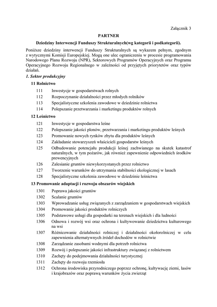 Załącznik 3 PARTNER Dziedziny Interwencji Funduszy Strukturalnych(wg kategorii i podkategorii). Poniższe dziedziny interwencji Funduszy Strukturalnych są wykazem pełnym, zgodnym z wytycznymi Komisji Europejskiej. Mogą one ulec ograniczeniu w procesie programowania Narodowego Planu Rozwoju (NPR), Sektorowych Programów Operacyjnych oraz Programu Operacyjnego Rozwoju Regionalnego w zależności od przyjętych priorytetów oraz typów działań. 1. Sektor produkcyjny 11 Rolnictwo 111 112 113 114 Inwestycje w gospodarstwach rolnych Rozpoczynanie działalności przez młodych rolników Specjalistyczne szkolenia zawodowe w dziedzinie rolnictwa Polepszanie przetwarzania i marketingu produktów rolnych 12 Leśnictwo 121 122 123 124 125 126 127 128 Inwestycje w gospodarstwa leśne Polepszanie jakości plonów, przetwarzania i marketingu produktów leśnych Promowanie nowych rynków zbytu dla produktów leśnych Zakładanie stowarzyszeń właścicieli gospodarstw leśnych Odbudowanie potencjału produkcji leśnej zachwianego na skutek katastrof naturalnych, w tym pożarów, jak również zapewnienie odpowiednich środków prewencyjnych Zalesianie gruntów niewykorzystanych przez rolnictwo Tworzenie warunków do utrzymania stabilności ekologicznej w lasach Specjalistyczne szkolenia zawodowe w dziedzinie leśnictwa 13 Promowanie adaptacji i rozwoju obszarów wiejskich 1301 1302 1303 1304 1305 1306 1307 1308 1309 1310 1311 1312 Poprawa jakości gruntów Scalanie gruntów Wprowadzanie usług związanych z zarządzaniem w gospodarstwach wiejskich Promowanie jakości produktów rolniczych Podstawowe usługi dla gospodarki na terenach wiejskich i dla ludności Odnowa i rozwój wsi oraz ochrona i kultywowanie dziedzictwa kulturowego na wsi Różnicowanie działalności rolniczej i działalności okołorolniczej w celu zapewnienia alternatywnych źródeł dochodów w rolnictwie Zarządzanie zasobami wodnymi dla potrzeb rolnictwa Rozwój i polepszanie jakości infrastruktury związanej z rolnictwem Zachęty do podejmowania działalności turystycznej Zachęty do rozwoju rzemiosła Ochrona środowiska przyrodniczego poprzez ochronę, kultywację ziemi, lasów i krajobrazów oraz poprawą warunków życia zwierząt 1313 1314 Odbudowanie potencjału produkcji rolniczej zachwianej na skutek katastrof naturalnych, w tym pożarów, jak również zapewnienie odpowiednich środków prewencyjnych Montaż finansowy 14 Rybołówstwo 141 142 143 144 145 146 147 148 Przystosowanie rybołówstwa Odnowa i modernizacja floty rybackiej Przetwarzanie, marketing i promocja produktów rybnych Aquacultura Wyposażenie portów rybackich oraz ochrona strefy przybrzeżnej Działania społeczno-ekonomiczne, w tym pomoc w przypadku tymczasowego zaprzestania działalności i inne formy rekompensat finansowych Działania prowadzone przez członków rybnych przedsiębiorstw handlowych, małych rybnych przedsiębiorstw zajmujących się połowami przybrzeżnymi oraz przedsiębiorstw rybnych zajmujących się połowami na akwenach śródlądowych Środki finansowane w ramach innych funduszy strukturalnych (ERDF, ESF) 15 Pomoc dla dużych przedsiębiorstw 151 152 153 154 155 Inwestycje w majątek trwały (budynki i wyposażenie, współfinansowane w ramach pomocy państwa) Technologie przyjazne środowisku, technologie zapewniające czystość i energooszczędne Usługi doradztwa biznesowego (umiędzynarodowienie działalności, zarządzanie eksportowe i środowiskowe, zakup technologii) Usługi dla pracowników przedsiębiorstw (zdrowie i bezpieczeństwo) Montaż finansowy 16 Pomoc dla małych i średnich przedsiębiorstw 161 162 163 164 165 166 167 Inwestycje w majątek trwały (budynki i wyposażenie, współfinansowane w ramach pomocy państwa) Technologie przyjazne środowisku, technologie zapewniające czystość i energooszczędne Usługi doradztwa biznesowego (informacja, planowanie biznesowe, usługi konsultingowe, marketing, projekty, umiędzynarodowienie działalności, zarządzanie eksportowe i środowiskowe, zakup technologii) Usługi dla przedsiębiorców (parki, inkubatory przedsiębiorczości, stymulacja rozwoju usług, promocja, powiązania, konferencje, targi handlowe) Montaż finansowy Usługi dla pracowników (zdrowie, bezpieczeństwo, usługi kulturalne) Szkolenia zawodowe dla małych i średnich przedsiębiorstw oraz dla sektora rzemieślniczego 17 Turystyka 171 172 173 174 Inwestycje materialne (centra informacji, baza noclegowa, zaplecze gastronomiczne, punkty usługowe) Inwestycje niematerialne (rozwój i świadczenie usług turystycznych, działalność sportowa, kulturalna, wypoczynek oraz dziedzictwo kulturowe) Usługi dla przemysłu turystycznego (obejmujące działalność promującą, powiązania, konferencje i targi handlowe) Specjalistyczne szkolenia zawodowe w dziedzinie turystyki 18 Badania, rozwój technologiczny i działania innowacyjne (B+R) 181 182 183 184 Projekty badawcze prowadzone przez szkoły wyższe i instytucje badawcze Innowacyjność i transfer technologii, ustanawianie wzajemnych powiązań i nawiązywanie współpracy pomiędzy przedsiębiorstwami i/lub instytutami badawczymi Infrastruktura badawczo-rozwojowa Szkolenia personelu badawczego 2. Zasoby ludzkie 21 22 23 24 25 Polityka rynku pracy /aktywne formy przeciwdziałania bezrobociu/ Czynnik społeczny /przeciwdziałanie wykluczeniu społecznemu/ Rozwój kształcenia i szkolenia zawodowego (ustawiczne kształcenie zawodowe) Promocja potencjału adaptacyjnego przedsiębiorstw i ich pracowników (doskonalenie kadr, rozwój przedsiębiorczości, innowacyjność, nowe technologie, pozyskiwania i przekazywania informacji) Działania na rzecz kobiet na rynku pracy 3. Infrastruktura podstawowa 31 Infrastruktura transportowa 311 312 313 314 315 316 317 318 319 Koleje Drogi Autostrady Lotniska Porty Drogi morskie i drogi wodne śródlądowe Transport miejski Transport multimodalny Nowoczesny system transportu 32 Infrastruktura telekomuni