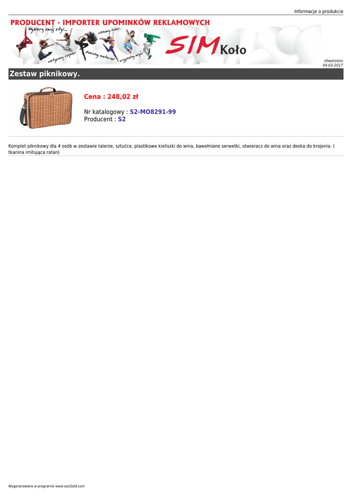 Informacje o produkcie Utworzono 04-03-2017 Zestaw piknikowy. Cena : 248,02 zł Nr katalogowy : S2-MO8291-99 Producent : S2 Komplet piknikowy dla 4 osób w zestawie talerze, sztućce, plastikowe kieliszki do wina, bawełniane serwetki, otwieracz do wina oraz deska do krojenia. ( tkanina imitująca ratan) Wygenerowano w programie www.oscGold.com