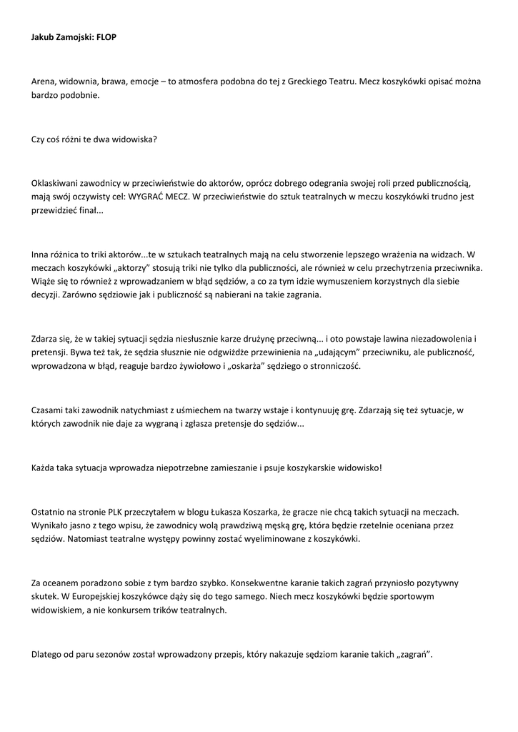 Jakub Zamojski: FLOP Arena, widownia, brawa, emocje – to atmosfera podobna do tej z Greckiego Teatru. Mecz koszykówki opisad można bardzo podobnie. Czy coś różni te dwa widowiska? Oklaskiwani zawodnicy w przeciwieostwie do aktorów, oprócz dobrego odegrania swojej roli przed publicznością, mają swój oczywisty cel: WYGRAD MECZ. W przeciwieostwie do sztuk teatralnych w meczu koszykówki trudno jest przewidzied finał... Inna różnica to triki aktorów...te w sztukach teatralnych mają na celu stworzenie lepszego wrażenia na widzach. W meczach koszykówki „aktorzy” stosują triki nie tylko dla publiczności, ale również w celu przechytrzenia przeciwnika. Wiąże się to również z wprowadzaniem w błąd sędziów, a co za tym idzie wymuszeniem korzystnych dla siebie decyzji. Zarówno sędziowie jak i publicznośd są nabierani na takie zagrania. Zdarza się, że w takiej sytuacji sędzia niesłusznie karze drużynę przeciwną... i oto powstaje lawina niezadowolenia i pretensji. Bywa też tak, że sędzia słusznie nie odgwiżdże przewinienia na „udającym” przeciwniku, ale publicznośd, wprowadzona w błąd, reaguje bardzo żywiołowo i „oskarża” sędziego o stronniczośd. Czasami taki zawodnik natychmiast z uśmiechem na twarzy wstaje i kontynuuję grę. Zdarzają się też sytuacje, w których zawodnik nie daje za wygraną i zgłasza pretensje do sędziów... Każda taka sytuacja wprowadza niepotrzebne zamieszanie i psuje koszykarskie widowisko! Ostatnio na stronie PLK przeczytałem w blogu Łukasza Koszarka, że gracze nie chcą takich sytuacji na meczach. Wynikało jasno z tego wpisu, że zawodnicy wolą prawdziwą męską grę, która będzie rzetelnie oceniana przez sędziów. Natomiast teatralne występy powinny zostad wyeliminowane z koszykówki. Za oceanem poradzono sobie z tym bardzo szybko. Konsekwentne karanie takich zagrao przyniosło pozytywny skutek. W Europejskiej koszykówce dąży się do tego samego. Niech mecz koszykówki będzie sportowym widowiskiem, a nie konkursem trików teatralnych. Dlatego od paru sezonów został wprowadzony przepis, który nakazuje sędziom karanie takich „zagrao”. Przewinienia techniczne orzekane są nieczęsto. Zwykle ostrzeżenie przynosi skutek. Zdarzają się niestety zawodnicy, którzy po otrzymaniu jasnego sygnału od sędziego kontynuują teatralne popisy….. nie pozostawiają wtedy wyboru, wówczas taka akcja zostaje ukarana przewinieniem technicznym. Wielu trenerów uczy swoich zawodników takich zagrao. Nie zdarza się to tylko w koszykówce. Takie zachowania przyszły z piłki nożnej, gdzie jednemu sędziemu z dużej odległości bardzo trudno ocenid co jest udawanym upadkiem, a co faulem. Może dlatego od pewnego czasu w takich sytuacjach zawodnicy „oglądają żółte kartoniki”. Kiedyś na wykładzie pewnego trenera z koszykarskiej NCAA zadałem pytanie, czy szkoli swoich zawodników w temacie „nabierania sędziów”… Początkowo zaprzeczył, ale kiedy sala nie dała wiary przyznał, że poświęcają na to czasami całe treningi. Sędziowie również szkolą się w ocenie takich sytuacji. Dwa lata temu na klinice przedsezonowej sędziów Euroligii poświecono kilka godzin na pokazanie sędziom w jaki sposób zawodnicy próbują udawad faule. Pokazano również, w jaki sposób odróżnid popchniętego zawodnika od tego, który wywraca się sam. Z różnych ujęd kamer można obserwowad zawodników chcących pokazad, że zostali uderzeni w brzuch, a wywracają się w taki sposób, że najpierw do tyłu „leci” im głowa. Podobnie można przeanalizowad ruch zawodnika, który jeszcze przed nastąpieniem jakiegokolwiek kontaktu staje na piętach i przy minimalnym dotknięciu wywraca się jak po zderzeniu z „pędzącym strusiem”. Zdarza się nawet, że takie sytuacje mają miejsce zupełnie bez żadnego kontaktu, czy ruchu ze strony przeciwnika...ale sam efekt w postaci wywracającego się w spektakularny sposób zawodnika może sprawid wrażenie poważnego faula. Wszyscy jesteśmy nabierani.... Zgodnie z tym co napisałem wcześniej trzeba pamiętad, że obie strony poświęcają dużo czasu szkoleniowego na te sytuacje. Zarówno sędziowie uczą się rozróżniad prawdziwe faule od teatralnych zagrao, jak i zawodnicy szlifują „umiejętności teatralne” w celu wymuszenia korzystnej decyzji sędziowskiej. Byd może dlatego czasami uda się nabrad sędziego, a czasami sędzia orzeka przewinienie techniczne. Wszystkim jednak zależy na tym, aby takich sytuacji było jak najmniej… bo wszyscy kochamy koszykówkę i chcemy oglądad zagrania koszykarskie a nie pseudo teatralne… Źródło: www.polskikosz.pl