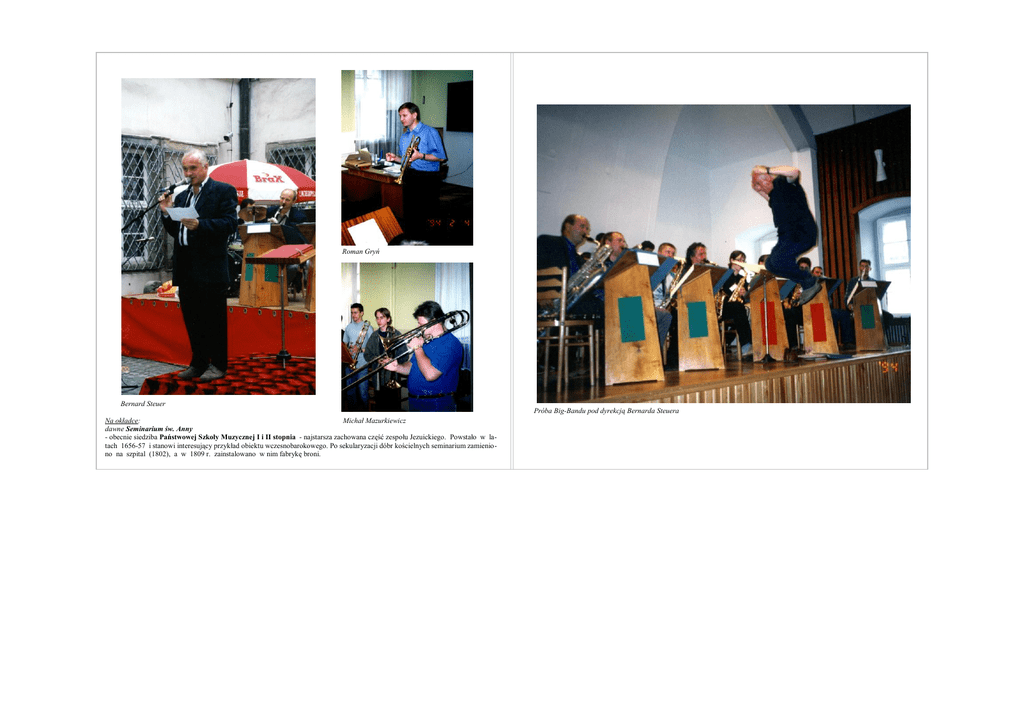 Roman Gryń Bernard Steuer Na okładce: Michał Mazurkiewicz dawne Seminarium św. Anny - obecnie siedziba Państwowej Szkoły Muzycznej I i II stopnia - najstarsza zachowana część zespołu Jezuickiego. Powstało w latach 1656-57 i stanowi interesujący przykład obiektu wczesnobarokowego. Po sekularyzacji dóbr kościelnych seminarium zamieniono na szpital (1802), a w 1809 r. zainstalowano w nim fabrykę broni. Próba Big-Bandu pod dyrekcją Bernarda Steuera