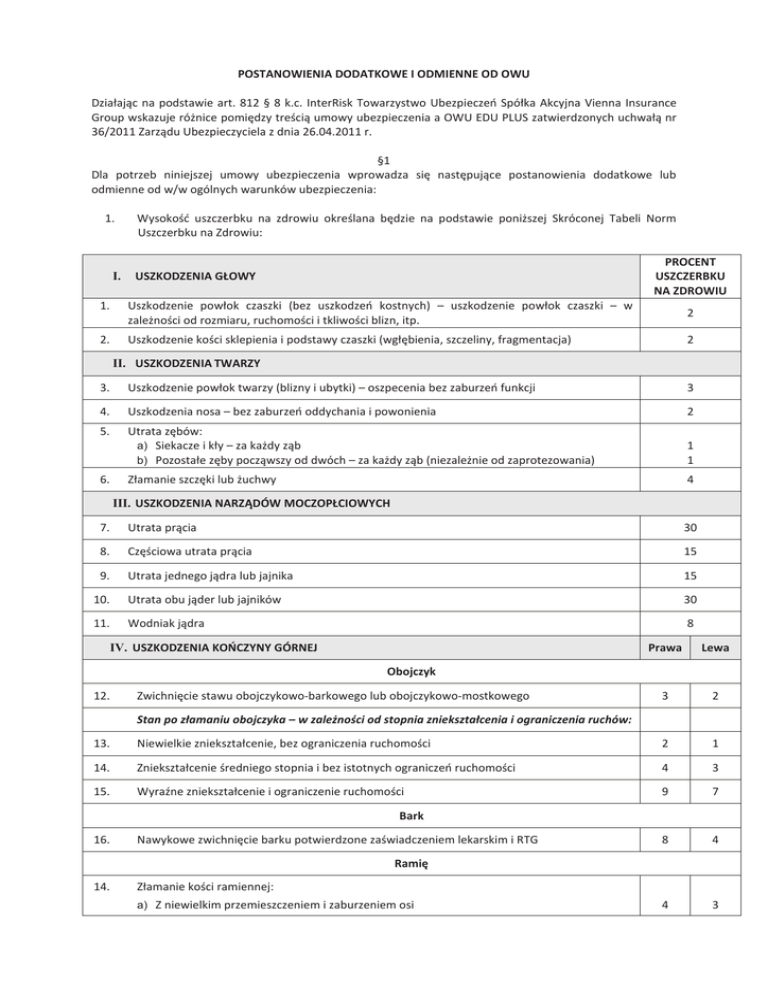 ! 5 +:,/&%% ; . )%/ 0 ) . . 1 2 3 * $ 67 8- 9' * 4 1 /:.&(./&%% . 0% , %. < 7 ! * ; ! " I. " 3 = < #$ & ' ! "'" &( ! " & ! % %. > ? @ @ / . /. > II. ! " " ? / &"% +. > (. ?@ A + @ B. / < a) * b) 9 :. A % % @ @ > ? ; ( III. ! " " &") * '" $' %'+ ". ). +& # %B C. %B %&. +& %%. 7 ) IV. ! " " ,'"% % #*& - . / %/. ; %+. D D + / = / % %(. ; ( + %B. 7 C " ) ( ( + E ( %:. = 235 & %(. ; a) ; 0 < b) ; %/ ) c) ; /( /& / / % % a) F + / b) ; %& ) / / ) ) %B. %:. 9 1 %". ; < / %). 0 ; < a) ; b) ; > A .? 2 3 %C. 6 > ?< a) 6 + / b) 6 ) : c) 6 %B %/ a) / % b) B ( c) ) " 45 0 / /&. 7 A < /%. ; > ?< a) ; % % b) ; + / c) ; ) : a) % % b) ( + c) %& " a) % % b) / / c) " B d) %& ) //. < 3 / 6 /+. /(. < ; > ?< ; % % b) ; + / ; B + a) % % b) / / c) : ( ) : a) /B. / /:. 111 14 /". /). /C. 6 4< 111 14 ; 7 / 4 > ?< a) ; % % b) ; + / B + ; V. ! " " ,'"% % . ! +&. ; < a) ; b) ; c) - / ( %& : : +%. /B > + .? +/. 6 > .?< a) = z nawracaj cymi wysi kami kolana, objawami tarcia w stawie, z zanikami mi do 2 cm, z ubytkiem zakresu ruchomo ci do 30°, b) G z objawami znacznej niewydolno ci stawu zanikami mi kolana w pozycji czynno ciowo korzystnej, c) Du e zmiany z objawami znacznej niewydolno ci kolana, tarcia w stawie i objawami tak niestabilno ci stawu kolanowego, e wymaga stosowania stabilizatora na stałe lub kul B ni uda ni do 4 cm i zesztywnienie %& znacznej /& / ++. ; < a) ; b) ; c) ; ( + : %/ : /& A +(. 1 > ? / +B. $ 3 +:. 6 ( 73 > .?< a) = b) ; c) 9 A / ) . +". /& ; < a) H b) ; @ + @ ) +). +C. < a) H b) ; / @ ; ) < a) ; 1 4 b) ; 11 111 c) ; / 14 + ) 3 (&. @> (%. ; (/. ; ? % + 11D4 > ? % (+. B ((. 11D4 (B. 4 % @ (:. /. @ 11D14 ( @ / 7 * ; F8;918#;I#18'$ ! 3 = ; 1 2 3 *.$. 4 = A 1 5 +. 0/ . +/? J0/ . +/? 3/ < @ < . "&&& %B&&&9'= . %: &&&9'= KL (. 0) . (? J0) . (? < 3/ 3/ /08 2 . "&&& C&&& %B&&&9'= . %:&&&9'= %M > ?. 7 D C&&& .C& B. 0) %/ . B? J0) . B? KL < 3/ @ < . "&&& C&&& %B&&&9'= . %:&&&9'= %M > ?. 7 .- :& %/ KL :. 0%+ .% J0%+ 7 < .% A C&M .L ". 0%+ . / J0%+ . / 7 %. G /. G < < - 0) 8- 9' * A @$ 0C ! .% 8- A G 9' * ). 0%: - , %&&M .L . %& . B? J0%: . %& . B? < A < C&M ! F8;918#;I#18' ? D %BM D A ? D A C. $ 7 %&M L 67 .