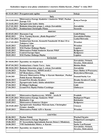 Kalendarz imprez oraz plany szkoleniowe i startowe Klubu Karate „Nidan” w roku 2013 styczeń 01-31.01.2013 Przygotowanie ogólne Sekcje luty Mistrzostwa Europy Kadetów i Juniorów WKF, Puchar Europy U21 22-24.02.2013 Zgrupowanie kadry klubu 25,27.02.2013 Badania lekarskie grupa 1, sekcja Zawadzkie 23-24.2.2013 Seminarium Christophe Pinna 10-12.02.2012 Konya/Turcja ? Zawadzkie Szczecin marzec 02-03.03.2013 Harasuto Cup 09.03.2013 19-ty Turniej Karate „Rada Regentów” 16-17.03.2013 World Cup Seminarium Karate, Kenneth Funakoshi 10 dan i Eva 15-17.03.2013 Tulejova 3 dan 16.03.2013 Funakoshi Cup 30.03.2013 XXI Puchar Dolnego Śląska 23.03.2013 Mistrzostwa Polski Seniorów Karate WKF 24.03.2013 Central Europe Open 30.03.2013 XXI Puchar Dolnego Śląska Łódź/Polska Zawadzkie/Polska Lasko/Słowenia Wrocław Wrocław Legnica Bydgoszcz Bydgoszcz Legnica kwiecień 01-10.04.2013 Egzaminy na stopnie kyu 05-07.04.2013 08-10.04.2013 13.04.2013 13.04.2013 21.04.203 20.04.2013 20.04.2013 27.04.2013 27.04.2013 Seminarium z Santo Torre - kata Badania lekarskie grupa 2, sekcja Zawadzkie Puchar Mazowsza, MMM strefa C GP Bratysławy, CEKL Otwarte Mistrzostwa Wlkp. w Karate Shotokan , Puchar Polski Karate Shotokan Grand Prix Hradec Kralove Zgrupowanie kadry klubu młodzików II Olimp Challenge Grand Prix Śląska Polsko-Czeskiego Zawadzkie, Ozimek, Strzelce, Dobrodzień Bielsko Biała Zawadzkie Stare Babice k/Warszawy Bratysława/Słowacja Poznań/Suchy Las Hradec Kralove/Czechy Zawadzkie Łódź Głubczyce maj Mistrzostwa Opolszczyzny, MMM – strefa D Mistrzostwa Europy Seniorów WKF Bełchatów Cup Mistrzostwa Pomorza i Kujaw Zgrupowanie Jonathan Motram-kata, Christopher 18-19.05.2013 Gruner -kumite 25.05.2013 Mistrzostwa Polski AZS w Karate 04.05.2013 09-12.05.2013 11.05.2013 18.05.2013 Prudnik Budapeszt/Węgry Bełchatów Bydgoszcz Cieszyn Wrocław czerwiec 01.06.2013 07-09.06.2013 15.06.2013 16.06.2013 Puchar Polski Mistrzostwa Europy Regionów IV Szczecińska Spartakiada Karate Dzieci i Młodzieży VIII Sucholeskie Mistrz. w Karate 03-15.06.2013 Egzaminy na stopnie kyu Warka/Chynów Podgorica/Czarnogóra Szczecin Suchy Las/Poznań Zawadzkie, Ozimek, Strzelce, Dobrodzień lipiec 12-15.07.2013 Uniwersyteckie Mistrzostwa Europy WKF Budapeszt/Węgry sierpień 24.08.2013 Otwarte Zgrupowanie, Grado Open 26-27.08.2013 Zgrupowanie kadry Lignano Sabiadoro/Włochy ? wrzesień 07-08.09.2013 07.09.2013 14-15.09.2013 14.09.2013 21-22.09.2013 27-28.09.2013 28-29.09.2013 Karate 1 – WKF Szkolenie trenerskie Budapeszt Open Bansai Cup Karate 1 – WKF Mistrzostwa Świata Shotokan GP Pilzna Istanbuł – Turcja Szczecin Budapeszt/Węgry Berlin/Niemcy Frankfurt/Niemcy Liverpool/W.Brtania Pilzno/Czechy 05.10.2013 05.10.2013 05.10.2013 12.10.2013 14-10-2012 19.10.2013 21-10-2012 26-27.10.2013 Mazovia Cup Zgrupowanie kadry klubu Mistrzostwa Ziemi Legnickiej Grand Prix Bielska-Białej Mistrzostwa Polski w Karate Shotokan Champion Cup Word Cup Mistrzostwa Polski Juniorów i Juniorów Młodszych i U21 październik Chynów Zawadzkie ? Legnica Bielsko-Biała Bielsko-Biała Łódź Ateny/Grecja Bielsko-Biała listopad Puchar Gór Opawskich Mistrzostwa Świata Kadetów, Juniorów i Puchar Świata 07-10.11.2013 U21 16.11.2013 Grand Prix Łodzi 16-17.11.2013 Seminarium Olivia Seba 09.11.2013 Mistrzostwa Polski w Karate Shotokan 22-24.11.2013 Mistrzostwa Europy w Karate Shotokan 23.11.2013 Cuprum Cup 24.11.2013 Akademickie Mistrz. Wielkopolski 30.11.2013 Bushido Cup 30.11.2013 K1-Premier Legue 0311.2013 Prudnik Guadalajara/Hiszpania Łódź Wrocław Bełchatów Porto/Portugalia Legnica Poznań Bydgoszcz Salzburg/Austria grudzień 02-06.12.2013 Egzaminy na stopnie kyu 01.12.2013 07.12.2013 07.12.2013 08.12.2013 14.12.2013 15.12.2013 Mikołajkowy Klubowy Turniej Karate Otwarte Mistrzostwa Łodzi Turniej Mikołajkowy w Karate Dzieci i Młodzieży Szkolenie Trenerskie Akademicki Puchar Polski Swarzędzkie Mistrzostwa o Puchar Burmistrza Zawadzkie, Ozimek, Strzelce, Dobrodzień Zawadzkie Łódź Szczecin Łódź Swarzędz Swarzędz Priorytety: 1. Mistrzostwa Polski Juniorów i Juniorów Młodszych i U21, Bielsko Biała 26-27.10.2013 Kandydaci junior młodszy r. Kandydaci junior r. 97-95: 98-99: 1. Grzebiński Adam r.98 Ledwig Natalia r.96 2. Talaga Rafał r. 99 Zajdel Ewa r. 96 3. Kalinowska Agata r. 98 Kanoza Michalina r. 97 4. Zajdel Elżbieta r. 98 Wybraniec Zuzanna r. 95 5. Kłys Adam r. 98 Guzy Sonia r. 95 6. Kalinowski Adam r. 1999 Bator Artur r. 97 7. Grejner Wiktoria r. 1999 8. Krawiec Aleksandra r. 1999 9. Kandora Karol r. 1999 Kandydaci U21 r. 95-94-93: 1. 2. 3. 4. 5. 6. 7. 8. Szarek Pataryk r. 94 Szponder Natalia r. 94 Sworeń Dariusz r.93 Stolarczyk Paweł r.95 Trepka Karolina r. 95 Grejner Weronika r. 95 9. 2. Mistrzostwa Polski Karate Shotokan, Bełachatów 09.11.2013 (kadet 16-17 lat, junior 18-20 lat, senior 21 i starsi). Kandydaci kadet 16-17 lat: 1. Wybraniec Zuzanna r. 95 2. Ledwig Natalia r.96 3. Zajdel Ewa r. 96 4. Kanoza Michalina r. 97 5. Bator Artur r. 97 6. Detko Błażej r. 97 7. 8. 9. Kandydaci junior i senior : 1. 2. 3. 4. 5. 6. 7. 8. 9. Sworeń Dariusz Barański Bartłomiej Zadrożny Marcin Stolarczyk Paweł r.95 Trepka Karolina r. 95 Grejner Weronika r. 95 Szarek Pataryk r. 94 Szponder Natalia r. 94 Guzy Sonia r. 95 3. Międzywojewódzkie Mistrzostwa Młodzików, 04.05.2013 Prudnik (młodzik r. 2000-2001). Międzywojewódzkie Mistrzostwa Młodzików, 1. Mraz Robert r. 2000 2. Grzeczkowicz Daria r. 2000 3. Apolinarska Aleksandra r. 2000 4. Studziński Patryk, r.2001 5. Cytacka Kamila r.2001 6. Łapot Mateusz r. 2001 7. 8. 4. Mistrzostwa Polski Karate WKF Seniorów, Bydgoszcz 23.03.2013 Mistrzostwa Polski Karate WKF Seniorów, 1. Trepka Karolina r. 95 2. Szponder Natalia r. 94 3. Guzy Sonia r. 95 4. Sworeń Dariusz 5. Barański Bartłomiej 6. Zadrożny Marcin