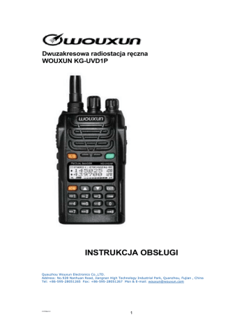 Dwuzakresowa radiostacja ręczna WOUXUN KG-UVD1P INSTRUKCJA OBSŁUGI Quauzhou Wouxun Electronics Co.,LTD. Address: No.928 Nanhuan Road, Jiangnan High Technology Industrial Park, Quanzhou, Fujian , China Tel: +86-595-28051265 Fax: +86-595-28051267 Msn & E-mail: [email protected] [email protected] 1 INFORMACJE WSTĘPNE: dziękuje za zakup radiotelefonu Wouxun KG-UVD1P Radiotelefon TG-UVD1P (nazywany dalej radiostacją), oferuje nowoczesną technologię, wielofunkcyjność, stabilną pracę oraz łatwą obsługę. Wierzymy, że będziecie Państwo zadowoleni z wysokiej jakości wykonania oraz cech użytkowych, które pozwolą na zaspokojenie Państwa potrzeb komunikacyjnych. Bezpieczeństwo, Sposób Użytkowania i Informacje Ogólne PRZECZYTAJ WAŻNIE INFORMACJE NA TEMAT BEZPIECZNEJ I WYDAJNEJ PRACY ZANIM ZACZNIESZ KORZYSTAĆ Z PRZENOŚNEJ RADIOTELEFONU TG-UVD1P. Nadawanie i odbiór By nadawać (mówić) należy nacisnąć przycisk Push-To-Talk (PTT), by odbierać należy przycisk PTT puścić. Ręczne użytkowanie radiostacji Z radia należy korzystać w pozycji pionowej, utrzymując jego mikrofon w odległości ok. 5cm od ust, a antenę możliwie najdalej od głowy. Użytkowanie radiostacji przy ciele Radiotelefon TG-UVD1P należy zawsze umieszczać w klipsach, pokrowcach, obudowach lub innych produktach do tego przeznaczonych. Korzystanie z innych niezaakceptowanych przez producenta akcesoriów może spowodować przekroczenie standardów EN odnośnie emisji promieniowania RF. Baterie i Anteny • Należy korzystać tylko z anteny zawartej w zestawie oraz z zatwierdzonych i dostarczonych przez anten zastępczych. • Stosowanie niezatwierdzonych anten, modyfikacji czy dodatków może doprowadzić do uszkodzenia radia lub naruszenia norm EN. • Należy korzystać tylko z baterii zawartej w zestawie oraz z zatwierdzonych i dostarczonych przez baterii zastępczych. • Stosowanie niezatwierdzonych baterii może doprowadzić do uszkodzenia radia lub naruszenia norm EN. Zatwierdzone akcesoria By zapoznać się z listą zatwierdzonych akcesoriów przejdź do strony z akcesoriami w tej instrukcji, bądź też odwiedź stronę internetową producenta, która zawiera listę zatwierdzonych akcesoriów: www.wouxun.comm Informacje dla użytkownika Radiotelefon można programować przez komputer, przy pomocy odpowiedniego oprogramowania i kabla. Wszelkie programowanie i dokonywanie modyfikacji istniejącego programu musi być wykonywane przez wyspecjalizowanego technika lub autoryzowany serwis. Niektóre z funkcji mogą być zaprogramowane niezgodnie z aktualnym prawodawstwem dotyczącym pasm częstotliwości PMR - 446. Do [email protected] 2 odpowiedzialności użytkownika należy dostosowanie programowanych wartości do obowiązujących regulacji prawnych. Wszelkie modyfikacje czy to wewnętrznych ustawień, czy zewnętrznej struktury i programowanie niezgodne z prawem powodują automatyczną utratę prawa do używania produktu. Zachowanie prawidłowych wartości zgodnych z CE PMR umożliwia pracę bez rejestracji i opłat. W pozostałych przypadkach radiotelefon wymaga pozwolenia radiowego na używanie. OSTRZEŻENIE: Istotne jest, by użytkownik zdawał sobie sprawę i rozumiał niebezpieczeństwa związane z korzystaniem z jakiegokolwiek nadajnika. Dotyczy to zwłaszcza pracy w środowiskach o podwyższonym ryzyku wybuchu (np. w obecności gazów, dymu, oparów, itp.). Należy wyłączyć radio w pobliżu paliw, czy stacji benzynowych. Jeśli pragnęliby Państwo by w urządzeniu dokonano modyfikacji lub usprawnień proszę skontaktować się z producentem [email protected] 3 UWAGA: Urządzenie to zostało przetestowane i uzyskało zgodność z dyrektywą R&TTE. Limity zostały wprowadzone, by zapewnić optymalną ochronę przeciwko szkodliwemu wpływowi urządzenia na domowy osprzęt elektroniczny. Urządzenie to generuje, wykorzystuje i potrafi emitować energię promieniowania w zakresie częstotliwości radiowych i jeśli nie jest zainstalowane i użytkowane w sposób prawidłowy może spowodować zakłócenia w pracy innego sprzętu radiokomunikacyjnego. Mimo tego, nie sposób zagwarantować, że takie zakłócenia w określonych przypadkach nie nastąpią. Jeśli taka sytuacja będzie miała miejsce i urządzenie to spowoduje zakłócenia w pracy odbiorników radiowych bądź telewizyjnych (co może być zdeterminowane przez włączenie/wyłączenie urządzenia), zachęca się użytkownika do eliminacji tychże zakłóceń poprzez jedną z następujących czynności: • Zmienić ustawienie lub położenie anteny odbiorczej. • Zwiększyć odległość pomiędzy radiem a innym sprzętem elektronicznym. • Podłączyć sprzęt do sieci zasilania innej od sieci zasilającej radiostację(?). • Skonsultować się ze sprzedawcą lub wykwalifikowanych technikiem sprzętu RTV Wyłącz radiostację podczas tankowania lub postoju na stacji benzynowej. Nie modyfikuj konstrukcji radiostacji bez pozwolenia. Nie wystawiaj radiostacji na dłuższe działanie promieni słonecznych. Nie kładź radiostacji w pobliżu źródła ciepła, ani na niestabilnych powierzchniach. Nie przechowuj radiostacji w pomieszczeniach o dużej wilgotności, zakurzeniu, zapyleniu. Bezpieczeństwo: Istotne jest, by użytkownik zdawał sobie sprawę i rozumiał niebezpieczeństwa związane z korzystaniem z jakiejkolwiek radiostacji. [email protected] 4 SPIS TREŚCI: Rozpakowanie i sprawdzenie sprzętu……..........................………….7 Dostarczone akcesoria: ........................................................………….7 Opis cech radiostacji............................................................………….7 Początek pracy .....................................................................………….8 Wyświetlacz LCD................................................................………….8 Opis radiostaqi .....................................................................………….9 P