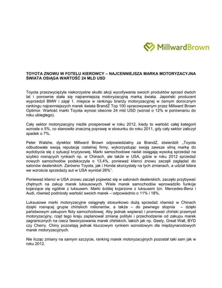 TOYOTA ZNOWU W FOTELU KIEROWCY – NAJCENNIEJSZA MARKA MOTORYZACYJNA ŚWIATA OSIĄGA WARTOŚĆ 24 MLD USD Toyota przezwyciężyła niekorzystne skutki akcji wycofywania swoich produktów sprzed dwóch lat i ponownie stała się najcenniejszą motoryzacyjną marką świata. Japoński producent wyprzedził BMW i zajął 1. miejsce w rankingu branży motoryzacyjnej w ósmym dorocznym rankingu najcenniejszych marek świata BrandZ Top 100 opracowywanym przez Millward Brown Optimor. Wartość marki Toyota wynosi obecnie 24 mld USD (wzrost o 12% w porównaniu do roku ubiegłego). Cały sektor motoryzacyjny nieźle prosperował w roku 2012, kiedy to wartość całej kategorii wzrosła o 5%, co stanowiło znaczną poprawę w stosunku do roku 2011, gdy cały sektor zaliczył spadek o 7%. Peter Walshe, dyrektor Millward Brown odpowiedzialny za BrandZ, stwierdził: „Toyota odbudowała swoją reputację rzetelnej firmy, wykorzystując swoją zawsze silną markę do wydobycia się z sytuacji kryzysowej. Marki samochodowe nadal osiągają wysoką sprzedaż na szybko rosnących rynkach np. w Chinach, ale także w USA, gdzie w roku 2012 sprzedaż nowych samochodów podskoczyła o 13,4%, ponieważ klienci znowu zaczęli zaglądać do salonów dealerskich. Zarówno Toyota, jak i Honda skorzystały na tych zmianach, a udział lidera we wzroście sprzedaży aut w USA wyniósł 26%”. Ponieważ klienci w USA znowu zaczęli pojawiać się w salonach dealerskich, zaczęło przybywać chętnych na zakup marek luksusowych. Wiele marek samochodów wprowadziło funkcje kojarzące się ogólnie z luksusem. Marki ściślej kojarzone z luksusem tzn. Mercedes-Benz i Audi, również podniosły wartość swoich marek – odpowiednio o 11% i 18%. Luksusowe marki motoryzacyjne osiągnęły stosunkowo dużą sprzedaż również w Chinach dzięki rosnącej grupie chińskich milionerów, a także – do pewnego stopnia – dzięki państwowym zakupom floty samochodowej. Aby jednak wspierać i promować chiński przemysł motoryzacyjny, rząd tego kraju zaplanował zmianę polityki i przechodzenie od zakupu marek zagranicznych na rzecz faworyzowania marek chińskich, takich jak np. Geely, Great Wall, BYD czy Cherry. Chiny pozostają jednak kluczowym rynkiem wzrostowym dla międzynarodowych marek motoryzacyjnych. Nie licząc zmiany na samym szczycie, ranking marek motoryzacyjnych pozostał taki sam jak w roku 2012. „Marki muszą nadal zaspokajać rozbudzone w 2012 r. oczekiwania związane z lepszą jakością i elementami luksusu bez względu na kategorię cenową. To pozwoli im na przyciągnięcie młodszych nabywców i „wychowywanie sobie” klientów na przyszłość” – konkluduje Walshe. Pierwsza dziesiątka najcenniejszych marek motoryzacyjnych – 2013 Pozycja w 2013 r. Marka Wartość marki w 2013 r. (mln USD) Zmiana wartości marki Pozycja w 2012 r. 1 Toyota 24 497 +12% 2 2 BMW 24 015 -2% 1 3 Mercedes-Benz 17 952 +11% 3 4 Honda 12 401 -2% 4 5 Nissan 10 186 +3% 5 6 Volkswagen 8 790 +3% 6 7 Ford 7 556 +8% 7 8 Audi 5 545 +18% 8 9 Hyundai 4 000 +11% 9 10 Lexus 3 472 +2% 10 Cały ranking można znaleźć pod adresem: www.millwardbrown.com/brandz Ranking najcenniejszych marek świata BrandZ Top 100 to jedyna na świecie wycena wartości marek, w której uwzględnia się nie tylko rygorystyczną analizę danych finansowych, wyceny rynkowe, raporty analityczne i profile ryzyka, ale również opinie o poszczególnych markach. Raport badawczy (dostępny w Internecie) zawiera ranking oraz analizę najcenniejszych marek dla kluczowych regionów świata oraz dla 13 sektorów rynkowych, w tym technologii i telekomunikacji. Pełny ranking BrandZTM (zawierający dane w rozbiciu na regiony i kategorie) można pobrać tutaj. Rankingi oraz wiele dodatkowych informacji można również uzyskać w postaci bezpłatnej aplikacji (iPhone, iPad i Android) z witryny www.brandz.com/mobile. Kontakt: Paweł Ciacek Client Service Director Tel: +48 (22) 5452 000 Email: [email protected] Kuba Antoszewski PR Manager Tel: +48 (22) 5452 000 Email: [email protected] Informacje o rankingu BrandZ Ranking BrandZ uwzględniający sto najpotężniejszych marek na świecie (BrandZ Top 100 Most Valuable Global Brands), opracowywany na potrzeby grupy WPP przez Millward Brown Optimor, istnieje już piąty rok. Jest to jedyne badanie, które przynosi wskaźniki wartości marek bazujące na wywiadach z ponad milionem konsumentów na całym świecie i uwzględnia zarówno marki z rynku konsumenckiego, jak i z rynku business-to-business. Wskaźniki te są następnie łączone z uzyskanymi w rygorystycznych pod względem metodologicznym badaniach na temat finansowych i ogólnobiznesowych wyników każdej ze spółek (dane z agencji Bloomberg i Datamonitor). Umożliwia to pokazanie wymiernej roli marek w generowaniu przychodów i budowaniu kapitalizacji rynkowej spółek. Postrzeganie marek przez konsumentów ma kluczowe znaczenie dla określenia ich wartości, ponieważ na markę składają się zarówno wyniki biznesowe firmy, jak i jakość produktu, klarowność pozycjonowania i pozycja rynkowa. W rankingu brane są pod uwagę rozbieżności regionalne, gdyż rola marki może się różnić znacząco w poszczególnych krajach, nawet w przypadku marek o zasięgu lokalnym. O firmie Millward Brown Millward Brown to jedna z wiodących na świecie firm badawczych. Jest uznanym ekspertem w badaniach nad skutecznością reklam, komunikacją marketingową, mediami i wartością marek. Dzięki zastosowaniu zintegrowanego pakietu sprawdzonych technik badawczych, zarówno jakościowych, jak i ilościowych, Millward Brown pomaga swoim klientom budować silne marki oraz oferować coraz lepsze usługi. Millward Brown posiada ponad 86 biur w 56 krajach, a także kilka wyspecjalizowanych oddziałów globalnych, takich jak Global Media Practice (globalna komórka zajmująca się skutecznością medialną), Millward Brown Neuroscience Practise (dział specjalizujący się 