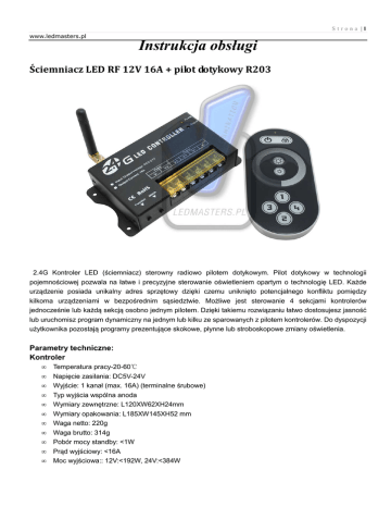 Instrukcja obsługi Ściemniacz LED RF 12V 16A + pilot dotykowy R203