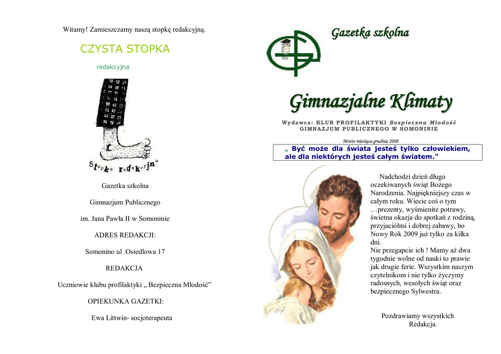 Witamy! Zamieszczamy naszą stopkę redakcyjną. Gazetka szkolna CZYSTA STOPKA redakcyjna Gimnazjalne Klimaty Wy da wc a : KLU B P R OF ILAKT Y KI Bezp ieczn a M ło d oś ć G IMN AZJU M P U BLIC ZN EG O W S O MON IN IE Motto miesiąca grudnia 2008 „ Być może dla świata jesteś tylko człowiekiem, ale dla niektórych jesteś całym światem." Gazetka szkolna Gimnazjum Publicznego im. Jana Pawła II w Somoninie ADRES REDAKCJI: Somonino ul .Osiedlowa 17 REDAKCJA Uczniowie klubu profilaktyki „ Bezpieczna Młodość” Nadchodzi dzień długo oczekiwanych świąt Bożego Narodzenia. Najpiękniejszy czas w całym roku. Wiecie coś o tym …prezenty, wyśmienite potrawy, świetna okazja do spotkań z rodziną, przyjaciółmi i dobrej zabawy, bo Nowy Rok 2009 już tylko za kilka dni. Nie przegapcie ich ! Mamy aż dwa tygodnie wolne od nauki to prawie jak drugie ferie. Wszystkim naszym czytelnikom i nie tylko życzymy radosnych, wesołych świąt oraz bezpiecznego Sylwestra. OPIEKUNKA GAZETKI: Ewa Littwin- socjoterapeuta Pozdrawiamy wszystkich Redakcja. Grudniowy numer zawiera: 1. Kochanemu Ojcu Świętemu…piszę. 2. Wywiad z Panią Wiesławą Radelską 3. Wywiad z Panią Wiolettą Kuberna 4. Bezpieczne „fajerwerkowanie”. 5. Uczniowie zażywają tabakę ? 6. Poczujmy klimat świąt . 7. Wigilia w innych państwach. 8. Za co lubimy naszą szkołę i przyjaciół. 9. Świąteczne porządki w domu. 10. Jestem tolerancyjna. 11. Czas kolędować przyjaciele. Kochanemu Ojcu Świętemu…piszę. Ania Armatowska z kl. III A Przewodnikiem po drogach życia w wierze Byłeś Ty – Janie Pawle II ! Pierwszym Papieżem narodu Polskiego Byłeś Ty – Karolu Wojtyło! Dlatego też nasze gimnazjum wybrało Cię na Przewodnika w nauce i życiu codziennym. Chcemy uczyć się tak, aby być Twoją i narodu chlubą. Ukochałeś Ojcze dzieci i młodzież, tak jak my Ciebie. Starać się będziemy żyć w zgodzie z naturą, bliźnim i Twoją nauką, którą mamy w naszych sercach. Gdy zbłądzimy…Pomóż nam, poprowadź do celu. Wskaż nam właściwe ścieżki życia ! Wiemy, że nie będą one proste i gładkie lecz wyboiste i trudne do przebycia. Z Twoją pomocą będziemy wzrastać na wielką dumę naszego narodu, naszej Polski. Wywiad z Panią Wizytator Wiesławą Radelską . Ucz.- Witamy Panią bardzo gorąco w naszym gimnazjum. Czy zechciałaby Pani udzielić nam wywiadu do gazetki szkolnej „ Gimnazjalne Klimaty” ? W.R.- Bardzo chętnie. Ucz. Jakie były Pani pierwsze wrażenia, gdy przekroczyła Pani progi naszego gimnazjum? W.R.- Zachwyciło mnie Wasze gimnazjum . Nowy przestronny i estetyczny budynek . Trafny dobór kolorów, a przede wszystkim jest przykładem czystości. Podoba mi się, że każdy przedmiot ma swój gabinet. Ucz.- Czym zajmuje się Pani z „ urzędu” ? W.R.- Zawodowo zajmuję się nadzorem pedagogicznym szkół podstawowych i gimnazjalnych. Ucz.- Jakie ma Pani zainteresowania? W.R.- Bardzo lubię czytać książki, uwielbiam sport, biorę udział w maratonach rowerowych, zimą jeżdżę na nartach. Turystyka to również moje hobby,a w wolnych chwilach lubię haftować… Ucz.- Co jest Pani największym sukcesem? W.R. – Moim największym sukcesem jest właściwy wybór zawodu. Kocham to co robię. Jak patrzę na ludzi to cieszę się, że wybrałam zawód nauczyciela, życie rodzinne i otaczam się dużym gronem przyjaciół. Ucz.- Co chciałaby Pani powiedzieć wszystkim uczniom. Do czego zachęcić? W.R.- Ważne jest, abyście się sumiennie przykładali do swoich obowiązków zarówno szkolnych jak i domowych. Okres szkolny jest bardzo ważnym etapem w waszym życiu to właśnie w szkole kształtuje się osobowość młodego człowieka, uczycie się spostrzegać problemy innych ludzi, uczycie się wrażliwości i umiejętności pomagania sobie nawzajem, rozwijacie zainteresowania. Ucz.- Przed czym ostrzegłaby Pani naszych gimnazjalistów ? W.R.- Ostrzegam młodzież przed ryzykownymi zachowaniami : zażywanie narkotyków, palenie papierosów oraz przed agresją skierowaną przeciwko drugiemu człowiekowi. Ucz.- Jakie jest Pani dewiza życiowa, motto życiowe ? W.R.- Zawsze powtarzam „ Nie ma tego złego, co by na dobre nie wyszło”, ponieważ uważam, że do sukcesu dochodzi się poprzez różne doświadczenia, które nie zawsze są przyjemne, ale dają mądrość i uczą. Ucz.- Dziękuję za rozmowę i życzę od całej społeczności szkolnej wielu sukcesów zarówno zawodowych i rodzinnych. Rozmawiała: Sandra Gosz z kl.III D. Wywiad z Panią Wiolettą Kuberna 1. Od jak dawna pracuje Pani w naszej szkole? Odp. W szkole pracuje od trzech lat. 2. Czym się Pani interesuje? Odp. W wolnych chwilach zajmuje się swoim ogródkiem. 3. Co najlepiej lubi Pani robić w czasie wolnym ? Odp. W wolnym czasie lubię czytać książki i chodzić na spacery. 4. Z jakimi problemami spotyka się Pani czasami w naszej szkole ? Odp. Nie widzę problemów podczas mojej pracy w szkole. 5. Co się podoba pani w naszej szkole? Odp. W szkole najbardziej podoba mi się pokój papieski. 6. Proszę wymienić trzy miejsca na Ziem, które chciałaby Pani odwiedzić? Odp. Chciałabym odwiedzić Egipt, Ibizę i Chorwację. 7. Czym według Pani młodzi ludzie powinni kierować się w życiu? Odp. Zasadami wyniesionymi z domu i szkoły oraz sercem. 8. Proszę wymienić dwie Pani zalety? Odp. Poczucie humoru i komunikatywność. Rozmawiała Magdalena Arndt z klasy IIB Bezpieczne „fajerwerkowanie”! Zbliżający się okres noworoczny tradycyjnie jest związany z używaniem różnego rodzaju środków pirotechnicznych. Aby zabawa z fajerwerkami była przyjemnością, muszą być one używane w sposób odpowiedzialny i bezpieczny. 10 rad dla dorosłych ! Jak pokazuje praktyka tzw. wypadki z fajerwerkami najczęściej zdarzają się na fajerwerków nie wolno odpalać z ręki, na balkonie, z okna czy z dachu pokrytego papą. Najlepiej wybrać w tym celu gładką, równą powierzchnię (np.