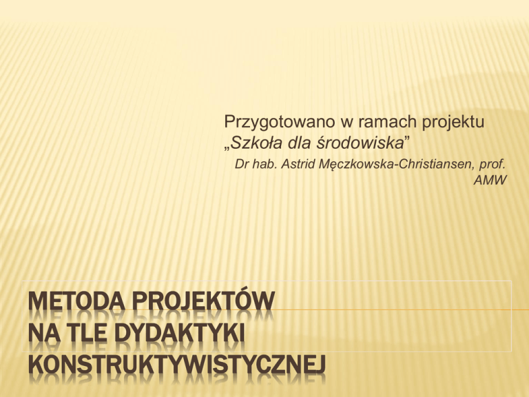 Przygotowano w ramach projektu „Szkoła dla środowiska” Dr hab. Astrid Męczkowska-Christiansen, prof. AMW METODA PROJEKTÓW NA TLE DYDAKTYKI KONSTRUKTYWISTYCZNEJ DYDAKTYKA KONSTRUKTYWISTYCZNA A DYDAKTYKA BEHAWIORALNA („TRADYCYJNA”) Źródła Podstawowe pojęcia: wiedza, kompetencje, rozwój ucznia, uczenie się, nauczanie, metoda kształcenia, ewaluacja procesu dydaktycznego Wiedza Dydaktyka behawioralna Dydaktyka konstruktywistyczna „wiadomości” i „umiejętności”; „produkt” procesu kształcenia Złożona struktura poznawcza; system pojęć odpowiedzialny za rozumienie rzeczywistości; „wiedza jest procesem, nie produktem” (J. Bruner) (Podstawowa rola pamięci) (podstawowa rola pojęć i myślenia pojęciowego) Kompetencj a - „zdolność do efektywnego myśleniadziałania”; złożona struktura obejmująca… Rozwój Rozwój kierowany, akumulacyjna koncepcja rozwoju ucznia Jako rezultat interakcji aktywności umysłu i oddziaływań środowiska; „myślenie rozwija się dzięki myśleniu” Uczenie się „nabywanie”; „uczenie się po śladzie nauczyciela” Aktywne; „w poszukiwaniu śladu” Nauczanie Transmisja wiedzy Tworzenie warunków dla aktywnego Dydaktyka behawioralna Dydaktyka konstruktywistyczna Niezmienny; oparty na taksonomii celów operacyjnych Elastyczny ,gdyż poszukujący; ścisłe ramowe Metoda kształcenia „świadomie i systematycznie stosowany…..” – niezmienny wzorzec postępowania dydaktycznego Zorientowana na stymulowanie aktywności uczącego się podmiotu; aktywna, „elastyczna” Kontrola dydaktyczna Pomiar lub opis wyniku – diagnoza deficytu Opis procedur poznawczych, diagnoza postępu Treść ewaluacji procesu dydaktycznego Wiadomości i umiejętności (jako „produkt”) Procesy i procedury poznawcze ucznia (myślenie i działanie) Podmiot kształcenia Uczeń (jako ten, który jest nauczany”; „pilność” jako Uczeń jako podmiot aktywnego uczenia się; „student”’ Tok kształcenia Planowanie procesu dydaktycznego „Orły nie wchodzą na górę po schodach” (C. Freinet) CZYNNIKI STYMULUJĄCE ROZWÓJ POZNAWCZY aktywność poznawcza, oparta na wykorzystaniu intelektualnej autonomii - z założenia już istniejącej i stale poszerzającej swój zasięg nauczanie poszukujące uczenie się „w poszukiwaniu śladu” oparcie kształcenia na naturalnej motywacji poznawczej podejmowanie przez ucznia odpowiedzialności za własne działania oraz ich konsekwencje „trudność”; wyzwania intelektualne współpraca ; praca w małych grupach PRZESZKODY DLA ROZWOJU niewspółmierna dominacja jednostronnego przekazu treści w nauczaniu (skutki: wyuczona bezradność intelektualna, wyposażenie w scholastyczną wiedzę, nieporadność w nowych sytuacjach, brak kreatywności, konformizm); zewnętrzne motywowanie za pomocą oceny szkolnej, „wymuszanie”; rytualizm nauczania, blokowanie twórczości; scholastyczne metody pracy; powtarzalność. ROLA PROBLEMÓW POZNAWCZYCH W KSZTAŁCENIU jako struktura zadania o niepełnych danych; brak “gotowej” strategii rozwiązania; konieczność twórczego przekształcenia posiadanej wiedzy i umiejetności w celu opracowania strategii rozwiązania. MYŚLENIE PROBLEMOWE Fazy myślenia problemowego (wg J. Deweya): analiza sytuacji problemowej i wykrycie trudności, sformułowanie problemu, formułowanie hipotez, weryfikacj hipotez, Rozwiązanie. Myślenie problemowe może obejmować wielokrotne powracanie do poprzednich faz; myślenie „metodą prób i błędów” Fazy myślenia problemowego (wg Wallasa): Przygotowanie, Inkubacja, Iluminacja. TWÓRCZOŚĆ JAKO CEL KSZTAŁCENIA Czym jest myślenie twórcze ? Myślenie produktywne vs. reproduktywne reproduktywne: korzystanie z algorytmicznych rozwiązań, utarte schematy myślenia, szukanie gotowych wzorców rozwiązania bądź odpowiedzi, produktywne: odkrywcze, nieschematyczne, zmiana punktów widzenia w podejściu do problemu. CECHY MYŚLENIA TWÓRCZEGO Płynność; Giętkość (różnorodność pomysłów); Opracowanie szczegółów (pogłębianie problemów, łączenie odmiennych punktów widzenia i perspektyw); Oryginalność (inwencyjność lub innowacyjność). STYMULACJA MYŚLENIA TWÓRCZEGO CZYNNIKI Rola kontekstu kulturowego; Edukacja konstruktywistyczna: „ świat jako pytanie”; Ksztacenie sfery emocjonalnej; Pozawerbalne sposoby myślenia; Znaczenie wiedzy proceduralnej zdobywanej w toku doświadczeń własnych. POJĘCIA I ICH ZNACZENIE DLA MYŚLENIA Ludzkie myślenie jest realizowane przez procesy kognitywne, opierające się na systemach pojęć o różnym stopniu konkretności/ abstrakcyjności, łączone w umyśle w mniej lub bardziej świadomy sposób. Pojęcie to podstawowa stuktura poznawcza, obejmujca ogólne cechy rzeczy, zjawisk lub sytuacji oraz relacji między nimi. Pojęć się nie „nabywa”, pojęcia się kształtują na drodze aktywnego myślenia. Kształtowanie pojęć jako proces nabywania i operowania informacjami METODA PROJEKTÓW Twórca: William H. Kilpatrick (The Project Method; 1918). Metoda projektu jako „ogólna zasada kształcenia”; Samodzielna praca uczniów jako podstawowa zasada procesu kształcenia; Rola nauczyciela jako organizatora warunków dla uczenia się: samodzielnego zdobywania wiedzy oraz sprawdzania swoich osiągnięć (wiedzy i umiejętności) w sytuacjach praktycznych; Zainteresowanie jako punkt wyjścia dla procesu uczenia się; METODA PROJEKTÓW – PODSTAWOWE ZASADY Zasada konstruowania wiedzy w umyśle ucznia: nabywanie wiedzy powinno zachodzić dzięki samodzielnemu rozumowaniu i rozwiązywaniu problemów, redukcja pamięciowego przyswajania informacji; Uczniowie pracują nad problemami, które ich interesują; rola naturalnej motywacji poznawczej („zaciekawienia”); Wprowadzanie „teorii” następuje w miarę pojawiających się potrzeb i wynika z realizowanych przez uczniów działań. KLASYFIKACJA PROJEKTÓW indywidualne / grupowe / zbiorowe (kl