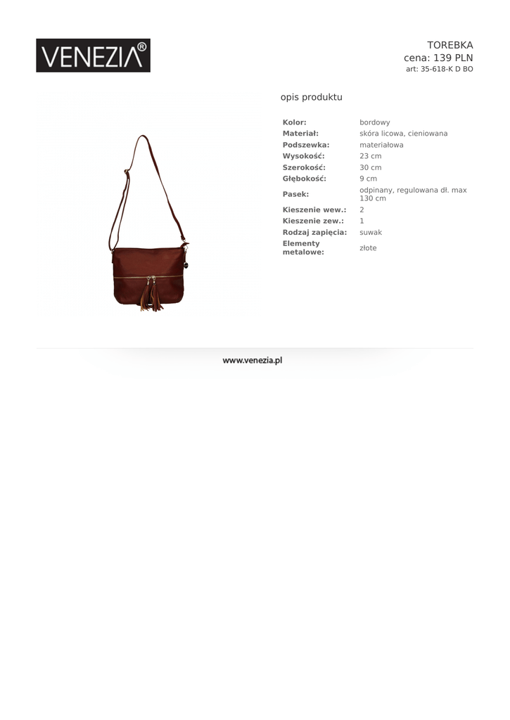 TOREBKA cena: 139 PLN art: 35-618-K D BO opis produktu Kolor: bordowy Materiał: skóra licowa, cieniowana Podszewka: materiałowa Wysokość: 23 cm Szerokość: 30 cm Głębokość: 9 cm Pasek: odpinany, regulowana dł. max 130 cm Kieszenie wew.: 2 Kieszenie zew.: 1 Rodzaj zapięcia: suwak Elementy metalowe: złote