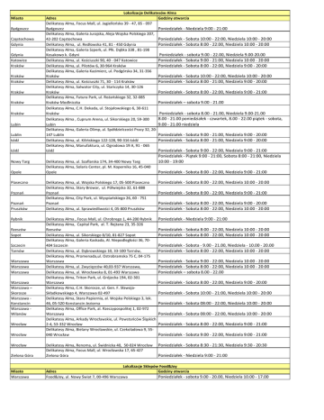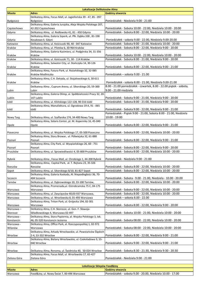 Miasto Bydgoszcz Częstochowa Gdynia Gdynia Katowice Kraków Kraków Kraków Kraków Kraków Kraków Lubin Lublin Łódź Łódź Nowy Targ Opole Lokalizacje Delikatesów Alma Adres Godziny otwarcia Delikatesy Alma, Focus Mall, ul. Jagiellońska 39 - 47, 85 - 097 Bydgoszcz Poniedziałek - Niedziela 9:00 - 21:00 Delikatesy Alma, Galeria Jurajska, Aleja Wojska Polskiego 207, 42-202 Częstochowa Poniedziałek - Sobota 10:00 - 22:00, Niedziela 10:00 - 20:00 Delikatesy Alma, ul. Redłowska 41, 81 - 450 Gdynia Poniedziałek - Sobota 8:00 - 22:00, Niedziela 10:00 - 20:00 Delikatesy Alma, Galeria Szperk, ul. Płk. Dąbka 338 , 81-198 Kosakowo k. Gdyni Poniedziałek - sobota 9.00 - 22.00, Niedziela 9.00-20.00 Delikatesy Alma, ul. Kościuszki 90, 40 - 047 Katowice Poniedziałek - Sobota 9:00 - 21:00, Niedziela 10:00 - 20:00 Delikatesy Alma, ul. Pilotów 6, 30-964 Kraków Poniedziałek - Sobota 8:00 - 22:00, Niedziela 9:00 - 20:00 Delikatesy Alma, Galeria Kazimierz, ul. Podgórska 34, 31-356 Kraków Poniedziałek - Sobota 10:00 - 22:00, Niedziela 10:00 - 20:00 Delikatesy Alma, ul. Kościuszki 71, 30 - 114 Kraków Poniedziałek - Sobota 8:00 - 21:00, Niedziela 9:00 - 20:00 Delikatesy Alma, Salwator City, ul. Stańczyka 14, 30-126 Kraków Poniedziałek - Sobota 8:00 - 22:00, Niedziela 9:00 - 21:00 Delikatesy Alma, Futura Park, ul. Rożańskiego 32, 32-085 Kraków Modlniczka Poniedziałek – sobota 9.00 - 21.00 Delikatesy Alma, C.H. Dekada, ul. Stojałowskiego 6, 30-611 Kraków Poniedziałek - sobota 8.00 - 21.00, Niedziela 9.00-21.00 8.00 - 21.00 poniedziałek - czwartek, 8.00 - 22.00 piątek - sobota, Delikatesy Alma , Cuprum Arena, ul. Sikorskiego 20, 59-300 Lubin 9.00 - 21.00 niedziela Delikatesy Alma, Galeria Olimp, al. Spółdzielczości Pracy 32, 20147 Lublin Poniedziałek - Sobota 9:00 - 21:00, Niedziela 9:00 - 20:00 Delikatesy Alma, ul. Kilińskiego 122-128, 90-316 Łódź Poniedziałek - Sobota 8:00 - 21:00, Niedziela 9:00 - 20:00 Delikatesy Alma, Manufaktura, ul. Ogrodowa 19 A, 91 - 065 Łódź Poniedziałek - Sobota 9:00 - 22:00, Niedziela 9:00 - 21:00 Delikatesy Alma, ul. Szaflarska 174, 34-400 Nowy Targ Delikatesy Alma, Solaris Center, pl. M. Kopernika 16, 45-040 Opole Poniedziałek - Piątek 9:00 - 21:00, Sobota 8:00 - 21:00, Niedziela 10:00 - 19:00 Poniedziałek - Sobota 8:00 - 22:00, Niedziela 9:00 - 21:00 Delikatesy Alma, ul. Wojska Polskiego 17, 05-500 Piaseczno Delikatesy Alma, Stary Browar, ul. Półwiejska 32, 61-888 Poznań Delikatesy Alma, City Park, ul. Wyspiańskiego 26, 60 - 751 Poznań Delikatesy Alma, ul. Sprawiedliwości 4, 05-800 Pruszków Poniedziałek - Sobota 8:00 - 22:00, Niedziela 10:00 - 20:00 Delikatesy Alma , Focus Mall, ul. Chrobrego 1, 44-200 Rybnik Delikatesy Alma, Capital Park, al. T. Rejtana 23, 35-326 Rzeszów Delikatesy Alma, ul. Sikorskiego 8/10, 81-827 Sopot Delikatesy Alma, Galeria Kaskada, Al. Niepodległości 36, 70404 Szczecin Delikatesy Alma, ul. Dąbrowskiego 10, 33-100 Tarnów, Delikatesy Alma, Promenada,ul. Ostrobramska 75 C, 04-175 Warszawa Delikatesy Alma, ul. Zwycięzców 40,03-937 Warszawa, Delikatesy Alma, ul. Wrocławska 8, 01-493 Warszawa Delikatesy Alma, Triton Park, ul. Grójecka 194, 02-301 Warszawa Delikatesy Alma, C.H. Skorosze, ul. Gen. F. SławojaSkładkowskiego 4, Warszawa 02-497 Delikatesy Alma, Stara Papiernia, al. Wojska Polskiego 3, lok. 46, 05-520 Konstancin Jeziorna Delikatesy Alma, Office Park, al. Rzeczypospolitej 1, 02-972 Warszawa Delikatesy Alma, Arkady Wrocławskie, ul. Powstańców Śląskich 2-4, 53-332 Wrocław Delikatesy Alma, Bielany Wrocławskie, ul. Czekoladowa 9, 55040 Wrocław Poniedziałek - Niedziela 9:00 - 21:00 Poniedziałek - Sobota 8:30 - 21:30, Niedziela 9:30 - 20:30 Zielona Góra Delikatesy Alma, Renoma, ul. Świdnicka 40, 50-024 Wrocław Delikatesy Alma, Focus Mall, ul. Wrocławska 17, 65-427 Zielona Góra Miasto Warszawa Lokalizacje Sklepów Food&Joy Adres Godziny otwarcia Food&Joy, ul. Nowy Świat 7, 00-496 Warszawa Poniedziałek - sobota 9.00 - 20.00, Niedziela 10.00 - 17.00 Piaseczno Poznań Poznań Pruszków Rybnik Rzeszów Sopot Szczecin Tarnów Warszawa Warszawa Warszawa Warszawa Warszawa – Skorosze Warszawa Konstancin Warszawa Wilanów Wrocław Wrocław Wrocław Poniedziałek - Sobota 8:00 - 22:00, Niedziela 9:00 - 21:00 Poniedziałek - Sobota 8:00 - 22:00, Niedziela 9:00 - 20:00 Poniedziałek - Sobota 8:00 - 22:00, Niedziela 10:00 - 20:00 Poniedziałek - Sobota 8:00 - 22:00, Niedziela 10:00 - 20:00 Poniedziałek - Sobota 8:00 - 22:00, Niedziela 10:00 - 20:00 Poniedziałek - Sobota - 9.00 - 21.00, Niedziela - 10.00 - 20.00 Poniedziałek - Sobota 8:00 - 22:00, Niedziela 10:00 - 20:00 Poniedziałek - Sobota 9:00 - 22:00, Niedziela 10:00 - 20:00 Poniedziałek - Sobota 8:00 - 22:00, Niedziela 10:00 - 20:00 Poniedziałek – sobota 8.00 - 22.00 Poniedziałek - Sobota 8:00 - 22:00, Niedziela 9:00 - 20:00 Poniedziałek - Sobota 10:00 - 21:00, Niedziela 10:00 - 20:00 Poniedziałek - Sobota 08:00 - 22:00, Niedziela 10:00 - 20:00 Poniedziałek - Sobota 08:00 - 22:00, Niedziela 10:00 - 20:00 Poniedziałek - Sobota 8:00 - 22:00, Niedziela 9:00 - 21:00 Poniedziałek - Sobota 9:00 - 22:00, Niedziela 9:00 - 21:00 Poniedziałek - Niedziela 9:00 - 21:00