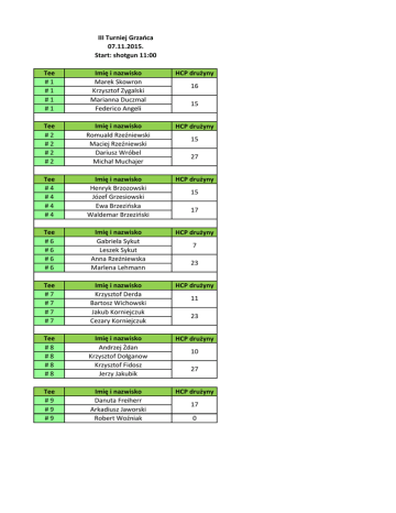 III Turniej Grzańca 07.11.2015. Start: shotgun 11:00 Tee #1 #1 #1 #1 Imię i nazwisko Marek Skowron Krzysztof Zygalski Marianna Duczmal Federico Angeli HCP drużyny Tee #2 #2 #2 #2 Imię i nazwisko Romuald Rzeźniewski Maciej Rzeźniewski Dariusz Wróbel Michał Muchajer HCP drużyny Tee #4 #4 #4 #4 Imię i nazwisko Henryk Brzozowski Józef Grzesiowski Ewa Brzezińska Waldemar Brzeziński HCP drużyny Tee #6 #6 #6 #6 Imię i nazwisko Gabriela Sykut Leszek Sykut Anna Rzeźniewska Marlena Lehmann HCP drużyny Tee #7 #7 #7 #7 Imię i nazwisko Krzysztof Derda Bartosz Wichowski Jakub Korniejczuk Cezary Korniejczuk HCP drużyny Tee #8 #8 #8 #8 Imię i nazwisko Andrzej Żdan Krzysztof Dołganow Krzysztof Fidosz Jerzy Jakubik HCP drużyny Tee #9 #9 #9 Imię i nazwisko Danuta Freiherr Arkadiusz Jaworski Robert Woźniak HCP drużyny 16 15 15 27 15 17 7 23 11 23 10 27 17 0