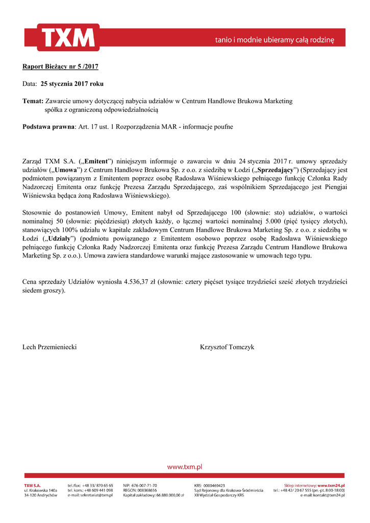 Raport Bieżący nr 5 /2017 Data: 25 stycznia 2017 roku Temat: Zawarcie umowy dotyczącej nabycia udziałów w Centrum Handlowe Brukowa Marketing spółka z ograniczoną odpowiedzialnością Podstawa prawna: Art. 17 ust. 1 Rozporządzenia MAR - informacje poufne Zarząd TXM S.A. („Emitent”) niniejszym informuje o zawarciu w dniu 24 stycznia 2017 r. umowy sprzedaży udziałów („Umowa”) z Centrum Handlowe Brukowa Sp. z o.o. z siedzibą w Łodzi („Sprzedający”) (Sprzedający jest podmiotem powiązanym z Emitentem poprzez osobę Radosława Wiśniewskiego pełniącego funkcję Członka Rady Nadzorczej Emitenta oraz funkcję Prezesa Zarządu Sprzedającego, zaś wspólnikiem Sprzedającego jest Piengjai Wiśniewska będąca żoną Radosława Wiśniewskiego). Stosownie do postanowień Umowy, Emitent nabył od Sprzedającego 100 (słownie: sto) udziałów, o wartości nominalnej 50 (słownie: pięćdziesiąt) złotych każdy, o łącznej wartości nominalnej 5.000 (pięć tysięcy złotych), stanowiących 100% udziału w kapitale zakładowym Centrum Handlowe Brukowa Marketing Sp. z o.o. z siedzibą w Łodzi („Udziały”) (podmiotu powiązanego z Emitentem osobowo poprzez osobę Radosława Wiśniewskiego pełniącego funkcję Członka Rady Nadzorczej Emitenta oraz funkcję Prezesa Zarządu Centrum Handlowe Brukowa Marketing Sp. z o.o.). Umowa zawiera standardowe warunki mające zastosowanie w umowach tego typu. Cena sprzedaży Udziałów wyniosła 4.536,37 zł (słownie: cztery pięćset tysiące trzydzieści sześć złotych trzydzieści siedem groszy). Lech Przemieniecki Krzysztof Tomczyk