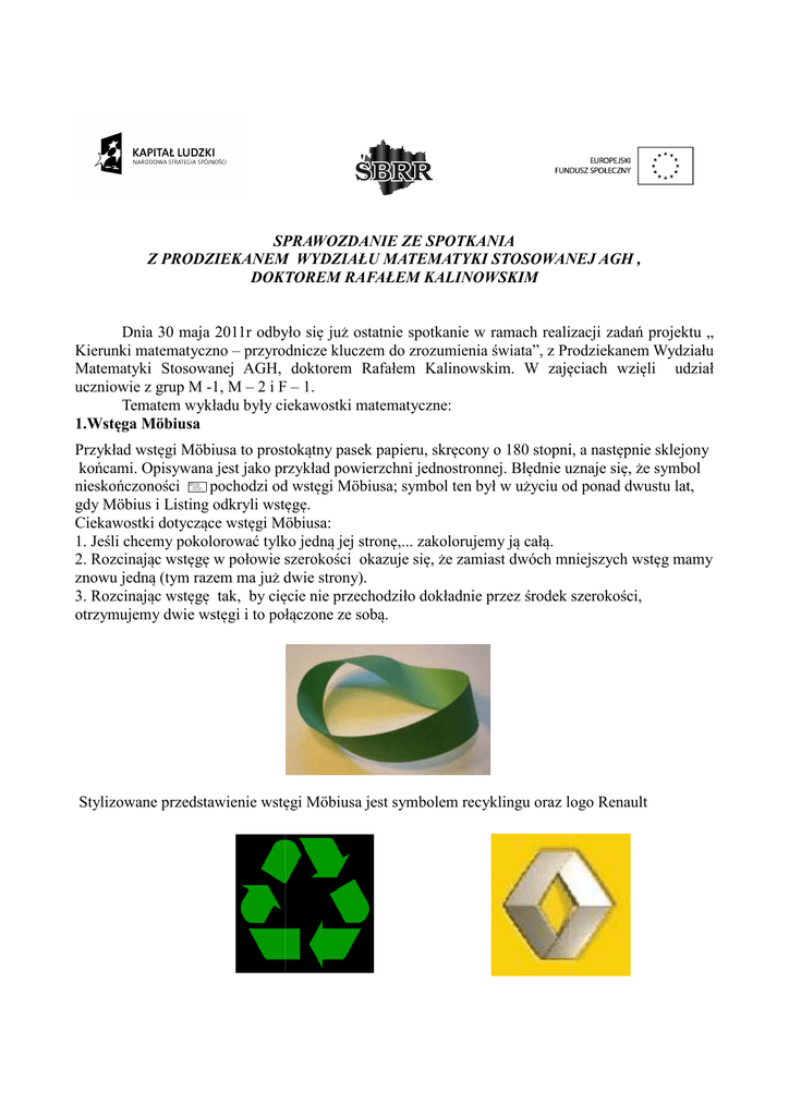 SPRAWOZDANIE ZE SPOTKANIA Z PRODZIEKANEM WYDZIAŁU MATEMATYKI STOSOWANEJ AGH , DOKTOREM RAFAŁEM KALINOWSKIM Dnia 30 maja 2011r odbyło sięę jużż ostatnie spotkanie w ramach realizacji zadańń projektu „ Kierunki matematyczno – przyrodnicze kluczem do zrozumienia świata”, ś z Prodziekanem Wydziału Matematyki Stosowanej AGH, doktorem Rafałem Kalinowskim. W zajęciach zaję wzięli ę udział uczniowie z grup M -1, M – 2 i F – 1. Tematem wykładu były ciekawostki matematyczne: 1.Wstęga Möbiusa Przykład wstęgi ęęgi Möbiusa to prostokątny prostokąą pasek papieru, skręcony ęcony ę o 180 stopni, a następnie nastęę sklejony końcami. ńńcami. Opisywana jest jako przykład powierzchni jednostronnej. Błędnie Błęędnie uznaje się, sięę żże symbol nieskończoności pochodzi od wstęgi wstę Möbiusa; symbol ten był w użyciu życiu od ponad dwustu lat, gdy Möbius i Listing odkryli wstęgę. wstę ę Ciekawostki dotyczące ą wstęgi ęgi Möbiusa: 1. Jeśli ś chcemy pokolorowaćć tylko jedną jej stronę,... ę zakolorujemy jąą całą. ą 2. Rozcinając ą wstęgę ę ę w połowie szerokości szerokoś okazuje się, ę żże zamiast dwóch óch mniejszych wstęg wstę mamy znowu jednąą (tym razem ma jużż dwie strony). 3. Rozcinając ą wstęgę ę ę tak, by cięcie ę nie przechodziło dokładnie przez środek ś szerokośś szerokości, otrzymujemy dwie wstęgi ęgi i to połączone połą ze sobą. ą Nie można wyświetlić połączonego obrazu. Plik m … Stylizowane przedstawienie wstęgi wstę Möbiusa jest est symbolem recyklingu oraz logo Renault 2. Złoty podział w matematyce i sztuce Zasada złotego podziału polega ona na takim podziale odcinka , w którym część mniejsza b do części ęś większej ę a ma sięę tak, jak część większa ę a do całości ś a + b. Złota liczba ߮ czyli Równość ść powyższą ż ą sprowadza się do równania kwadratowego Ma ono dwa rozwiązania rozwią rzeczywiste jedno z nich jest dodatnie: Czasem tym samym terminem określa okreś sięę liczbęę odwrotną: Związek ązek złotej liczby z liczbami Fibonacciego Kolejne przybliżenia żżenia liczby złotej można możż otrzymaćć obliczając ą ilorazy sąsiednich ąsiednich ą liczb Fibonacciego co daje kolejno: Artystą, ą, który niezwykle często czę odwoływał sięę w swych pracach do boskiej proporcji był Leonardo da Vinci.. Rysunek przedstawiający przedstawiają Homo Vitruvius czyli człowieka witruwiańskiego witruwiań znamy wszyscy. Jest to ilustracja do fragmentu traktatu O architekturze ksiąg ąg dziesięcioro dziesię Witruwiusza, a poświęconego ś ęconego proporcjom ludzkiego ludzkieg ciała. Gdy nanieśmy śmy na niego kilkanaście kilkanaś linii oczom naszym ukaże ż sięę złoty podział .Zasada złotego podziału odcinka była przejawem estetyki klas. W średniowieczu i okresie odrodzenia matematycy byli zafascynowani liczbą , a proporcję, ę z której się ją wyprowadza, prowadza, nazwano "boską proporcją". ą INNE PRZYKŁADY : ● zasada złotego łotego podziału znana od starożytności, starożż ś znalazła zastosowanie w architekturze antycznej, ści, romańskiej ńskiej oraz w sztuce renesansu i klasycyzmu; ● okna w budowlach w stylu renesansowym ( szerokość szeroko do wysokości ści była w stosunku 5:8 ); ● renesansowe pałace włoskie ● także ż inne śświątynie, ątynie, np. Parthenon na Akropolu. Wystąpienie ąąpienie wykładowcy jak zwykle zakończyły zakoń ńczyły gromkie brawa. Było to jużż ostatnie spotkanie z doktorem Rafałem Kalinowskim w ramach realizacji zadań projektu. Opracowanie Ewa Dębicka.
