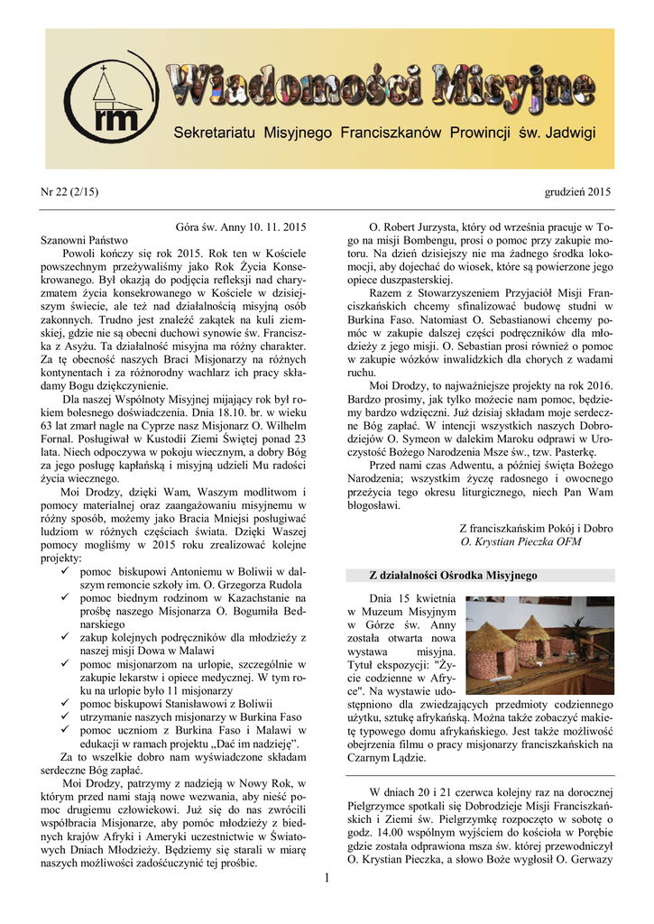Nr 22 (2/15) grudzień 2015 Góra św. Anny 10. 11. 2015 Szanowni Państwo Powoli kończy się rok 2015. Rok ten w Kościele powszechnym przeżywaliśmy jako Rok Życia Konsekrowanego. Był okazją do podjęcia refleksji nad charyzmatem życia konsekrowanego w Kościele w dzisiejszym świecie, ale też nad działalnością misyjną osób zakonnych. Trudno jest znaleźć zakątek na kuli ziemskiej, gdzie nie są obecni duchowi synowie św. Franciszka z Asyżu. Ta działalność misyjna ma różny charakter. Za tę obecność naszych Braci Misjonarzy na różnych kontynentach i za różnorodny wachlarz ich pracy składamy Bogu dziękczynienie. Dla naszej Wspólnoty Misyjnej mijający rok był rokiem bolesnego doświadczenia. Dnia 18.10. br. w wieku 63 lat zmarł nagle na Cyprze nasz Misjonarz O. Wilhelm Fornal. Posługiwał w Kustodii Ziemi Świętej ponad 23 lata. Niech odpoczywa w pokoju wiecznym, a dobry Bóg za jego posługę kapłańską i misyjną udzieli Mu radości życia wiecznego. Moi Drodzy, dzięki Wam, Waszym modlitwom i pomocy materialnej oraz zaangażowaniu misyjnemu w różny sposób, możemy jako Bracia Mniejsi posługiwać ludziom w różnych częściach świata. Dzięki Waszej pomocy mogliśmy w 2015 roku zrealizować kolejne projekty: pomoc biskupowi Antoniemu w Boliwii w dalszym remoncie szkoły im. O. Grzegorza Rudola pomoc biednym rodzinom w Kazachstanie na prośbę naszego Misjonarza O. Bogumiła Bednarskiego zakup kolejnych podręczników dla młodzieży z naszej misji Dowa w Malawi pomoc misjonarzom na urlopie, szczególnie w zakupie lekarstw i opiece medycznej. W tym roku na urlopie było 11 misjonarzy pomoc biskupowi Stanisławowi z Boliwii utrzymanie naszych misjonarzy w Burkina Faso pomoc uczniom z Burkina Faso i Malawi w edukacji w ramach projektu „Dać im nadzieję”. Za to wszelkie dobro nam wyświadczone składam serdeczne Bóg zapłać. Moi Drodzy, patrzymy z nadzieją w Nowy Rok, w którym przed nami stają nowe wezwania, aby nieść pomoc drugiemu człowiekowi. Już się do nas zwrócili współbracia Misjonarze, aby pomóc młodzieży z biednych krajów Afryki i Ameryki uczestnictwie w Światowych Dniach Młodzieży. Będziemy się starali w miarę naszych możliwości zadośćuczynić tej prośbie. O. Robert Jurzysta, który od września pracuje w Togo na misji Bombengu, prosi o pomoc przy zakupie motoru. Na dzień dzisiejszy nie ma żadnego środka lokomocji, aby dojechać do wiosek, które są powierzone jego opiece duszpasterskiej. Razem z Stowarzyszeniem Przyjaciół Misji Franciszkańskich chcemy sfinalizować budowę studni w Burkina Faso. Natomiast O. Sebastianowi chcemy pomóc w zakupie dalszej części podręczników dla młodzieży z jego misji. O. Sebastian prosi również o pomoc w zakupie wózków inwalidzkich dla chorych z wadami ruchu. Moi Drodzy, to najważniejsze projekty na rok 2016. Bardzo prosimy, jak tylko możecie nam pomoc, będziemy bardzo wdzięczni. Już dzisiaj składam moje serdeczne Bóg zapłać. W intencji wszystkich naszych Dobrodziejów O. Symeon w dalekim Maroku odprawi w Uroczystość Bożego Narodzenia Msze św., tzw. Pasterkę. Przed nami czas Adwentu, a później święta Bożego Narodzenia; wszystkim życzę radosnego i owocnego przeżycia tego okresu liturgicznego, niech Pan Wam błogosławi. Z franciszkańskim Pokój i Dobro O. Krystian Pieczka OFM Z działalności Ośrodka Misyjnego Dnia 15 kwietnia w Muzeum Misyjnym w Górze św. Anny została otwarta nowa wystawa misyjna. Tytuł ekspozycji: "Życie codzienne w Afryce". Na wystawie udostępniono dla zwiedzających przedmioty codziennego użytku, sztukę afrykańską. Można także zobaczyć makietę typowego domu afrykańskiego. Jest także możliwość obejrzenia filmu o pracy misjonarzy franciszkańskich na Czarnym Lądzie. W dniach 20 i 21 czerwca kolejny raz na dorocznej Pielgrzymce spotkali się Dobrodzieje Misji Franciszkańskich i Ziemi św. Pielgrzymkę rozpoczęto w sobotę o godz. 14.00 wspólnym wyjściem do kościoła w Porębie gdzie została odprawiona msza św. której przewodniczył O. Krystian Pieczka, a słowo Boże wygłosił O. Gerwazy 1 Podworski z Prowincji Niepokalanego Poczęcia NMP z Kalwarii Zebrzydowskiej. Po Mszy św. pątnicy udali się na Drogę Krzyżową, która została odprawiona na Kalwarii. Wieczorem była okazja, aby podzielić się doświadczeniami pracy na rzecz misji w parafiach oraz zobaczyć film o pracy Franciszkanów w Boliwii. Dnia 22 sierpnia po raz kolejny spotkali sie uczestnicy projektu pomocy w edukacji dzieci i młodzieży z naszej misji w Korsimoro (Burkina Faso). Na spotkaniu był obecny O. Rafał Segieth który tam na miejscu jest odpowiedzialny za realizację projektu. Obecnie pomocą jest objętych 423 uczniów. W dniach 2325 października w Domu Pielgrzyma w Górze św. Anny spotkali się członkowie Róż Różańcowych, których głównym tematem było Boże Miłosierdzie. Podczas rekolekcji ich uczestnicy spotykali się na wspólnej modlitwie, konferencjach oraz spotkaniach braterskich. Niedzielny dzień pielgrzymowania rozpoczął Godzinkami w Kaplicy Domu Pielgrzyma. Przedpołudnie zagospodarowali Misjonarze: O. Paschalis Jędrzejas pracujący w Boliwii i O. Gerwazy pracujący na rzecz Komisariatu Ziemi św. w Krakowie. Zakończenie pielgrzymki miało miejsce podczas Mszy św. o godz. 11.30, w Bazylice św. Anny, której przewodniczył Minister Prowincjalny Prowincji św. Jadwigi O. Alan Tomasz Brzyski. Wiadomości z Misji Dnia 23 i 24 maja bp Antoni Reimann udzielił Sakramentu Bierzmowania 45 osobom w miejscowości La Senda i 84 osobom w San Ramon. 25 lipca, w liturgiczne wspomnienie św. Krzysztofa, patrona kierowców podjęliśmy się realizacji nowego projektu Kierowcy na rzecz misji. Zwracamy się do Państwa, zwłaszcza do kierowców prosząc o pomoc modlitewną i finansową misjonarzom, którzy na różnych kontynentach pracują i prowadzą działalność ewangelizacyjną niosąc ludziom