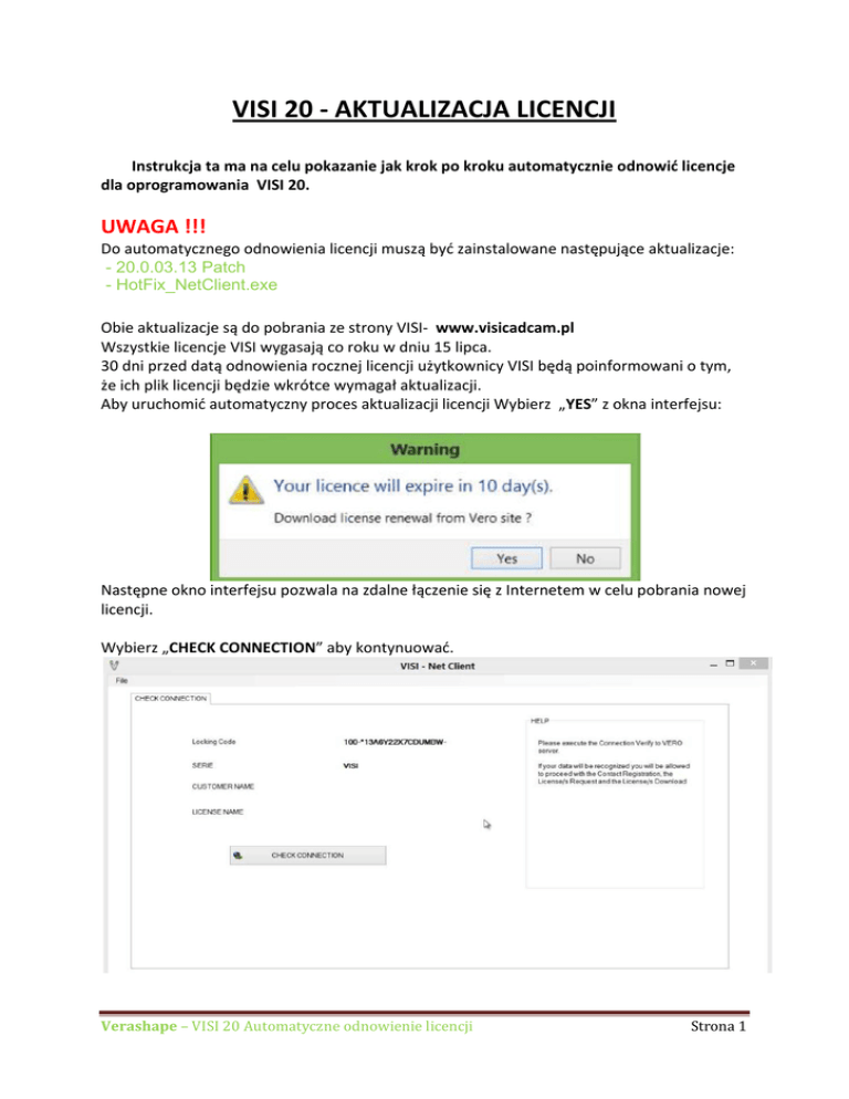 VISI 20 - AKTUALIZACJA LICENCJI Instrukcja ta ma na celu pokazanie jak krok po kroku automatycznie odnowić licencje dla oprogramowania VISI 20. UWAGA !!! Do automatycznego odnowienia licencji muszą być zainstalowane następujące aktualizacje: - 20.0.03.13 Patch - HotFix_NetClient.exe Obie aktualizacje są do pobrania ze strony VISI- www.visicadcam.pl Wszystkie licencje VISI wygasają co roku w dniu 15 lipca. 30 dni przed datą odnowienia rocznej licencji użytkownicy VISI będą poinformowani o tym, że ich plik licencji będzie wkrótce wymagał aktualizacji. Aby uruchomić automatyczny proces aktualizacji licencji Wybierz „YES” z okna interfejsu: Następne okno interfejsu pozwala na zdalne łączenie się z Internetem w celu pobrania nowej licencji. Wybierz „CHECK CONNECTION” aby kontynuować. Verashape–VISI20Automatyczneodnowienielicencji Strona1 Następnie system sprawdza lock kod w bazie danych VERO. Po upewnieniu się że lock został pomyślnie rozpoznany wyświetli się następujący komunikat: Wciśnij „OK” w celu kontynuowania. Istnieją sytuacje, które zatrzymują automatyczne wygenerowanie licencji: - Lock kod nie została rozpoznana - Została wykryta licencja pływająca - Istniejący plik licencji jest licencją próbną - Brak połączenia z Internetem Jeśli z jakiegoś powodu nie jest możliwe automatyczne zaktualizowanie licencji, pojawi się okno z komunikatem proszącym o kontakt z Twoim dealerem lub resellerem VISI. Jeśli lock kod został poprawnie rozpoznany pojawi się „CONTACT REGISTRATION”. Wymagane jest aby wypełnić ten formularz - po jego wypełnieniu wybierz przycisk w dolnej części okna „CONTACT REGISTRATION”. Verashape–VISI20Automatyczneodnowienielicencji Strona2 W następnym oknie zostaniesz poinformowany że Twoje dane rejestracyjne zostały pomyślnie wprowadzone. Wciśnij „OK” w celu kontynuowania W kolejnym kroku program pozwala na wybór licencji dla odpowiedniej wersji VISI. Upewnij się że wersja licencji którą potrzebujesz została zaznaczona przed wybraniem ikonki „LICENSE GENERATION”. Wciśnij „OK” w celu kontynuowania Verashape–VISI20Automatyczneodnowienielicencji Strona3 Następnie wybierz opcję „LICENSE DOWNLOAD” aby rozpocząć pobieranie zaktualizowanej licencji. W kolejnym oknie zostaniesz poinformowany że kody licencji zostały z powodzeniem pobrane do Twojego systemu. Wciśnij „OK” w celu kontynuowania Twój nowy kod licencji został automatycznie pobrany do folderu „VISI20\ SYSTEM” Verashape–VISI20Automatyczneodnowienielicencji Strona4 Kiedy zaktualizowane kody licencji zostały pobrane do systemu, otrzymasz automatycznie wygenerowany e-mail z informacją, że przy następnym otwarciu oprogramowania VISI 20 zaktualizowany kod licencji zostanie zainstalowany. Teraz można zamknąć okno NetClient wybierając przycisk „EXIT”. Twój zaktualizowany kod licencji odnowiony będzie automatycznie podczas następnego uruchomienia VISI 20. Okno statusu licencji zostanie wyświetlone pokazując że Twoja licencja została przedłużona. Po zamknięciu tego okna VISI 20 automatycznie się otworzy. W tym momencie proces aktualizacji kodu licencji zostanie zakończony. UWAGA ! Tylko Licencje dla VISI 20 będą automatycznie aktualizowane. Wszelkie licencje dla wcześniejszych wersji VISI będą musiały być zainstalowane ręcznie za pomocą menedżera licencji. Verashape–VISI20Automatyczneodnowienielicencji Strona5