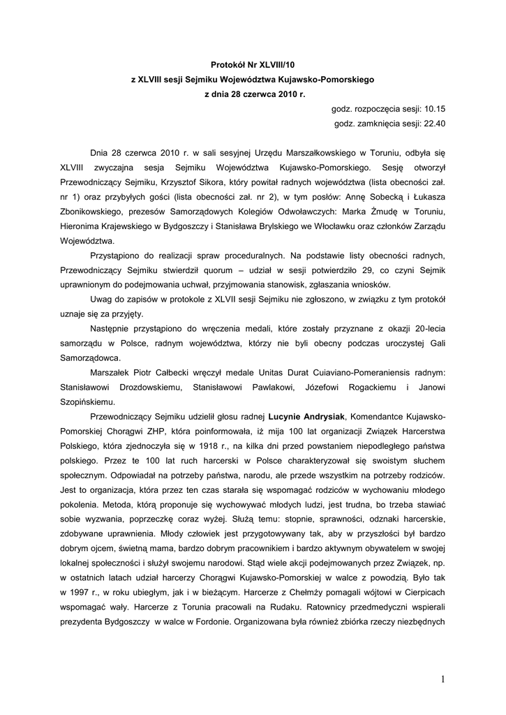 Protokół Nr XLVIII/10 z XLVIII sesji Sejmiku Województwa Kujawsko-Pomorskiego z dnia 28 czerwca 2010 r. godz. rozpoczęcia sesji: 10.15 godz. zamknięcia sesji: 22.40 Dnia 28 czerwca 2010 r. w sali sesyjnej Urzędu Marszałkowskiego w Toruniu, odbyła się XLVIII zwyczajna sesja Sejmiku Województwa Kujawsko-Pomorskiego. Sesję otworzył Przewodniczący Sejmiku, Krzysztof Sikora, który powitał radnych województwa (lista obecności zał. nr 1) oraz przybyłych gości (lista obecności zał. nr 2), w tym posłów: Annę Sobecką i Łukasza Zbonikowskiego, prezesów Samorządowych Kolegiów Odwoławczych: Marka Żmudę w Toruniu, Hieronima Krajewskiego w Bydgoszczy i Stanisława Brylskiego we Włocławku oraz członków Zarządu Województwa. Przystąpiono do realizacji spraw proceduralnych. Na podstawie listy obecności radnych, Przewodniczący Sejmiku stwierdził quorum – udział w sesji potwierdziło 29, co czyni Sejmik uprawnionym do podejmowania uchwał, przyjmowania stanowisk, zgłaszania wniosków. Uwag do zapisów w protokole z XLVII sesji Sejmiku nie zgłoszono, w związku z tym protokół uznaje się za przyjęty. Następnie przystąpiono do wręczenia medali, które zostały przyznane z okazji 20-lecia samorządu w Polsce, radnym województwa, którzy nie byli obecny podczas uroczystej Gali Samorządowca. Marszałek Piotr Całbecki wręczył medale Unitas Durat Cuiaviano-Pomeraniensis radnym: Stanisławowi Drozdowskiemu, Stanisławowi Pawlakowi, Józefowi Rogackiemu i Janowi Szopińskiemu. Przewodniczący Sejmiku udzielił głosu radnej Lucynie Andrysiak, Komendantce KujawskoPomorskiej Chorągwi ZHP, która poinformowała, iż mija 100 lat organizacji Związek Harcerstwa Polskiego, która zjednoczyła się w 1918 r., na kilka dni przed powstaniem niepodległego państwa polskiego. Przez te 100 lat ruch harcerski w Polsce charakteryzował się swoistym słuchem społecznym. Odpowiadał na potrzeby państwa, narodu, ale przede wszystkim na potrzeby rodziców. Jest to organizacja, która przez ten czas starała się wspomagać rodziców w wychowaniu młodego pokolenia. Metoda, którą proponuje się wychowywać młodych ludzi, jest trudna, bo trzeba stawiać sobie wyzwania, poprzeczkę coraz wyżej. Służą temu: stopnie, sprawności, odznaki harcerskie, zdobywane uprawnienia. Młody człowiek jest przygotowywany tak, aby w przyszłości był bardzo dobrym ojcem, świetną mama, bardzo dobrym pracownikiem i bardzo aktywnym obywatelem w swojej lokalnej społeczności i służył swojemu narodowi. Stąd wiele akcji podejmowanych przez Związek, np. w ostatnich latach udział harcerzy Chorągwi Kujawsko-Pomorskiej w walce z powodzią. Było tak w 1997 r., w roku ubiegłym, jak i w bieżącym. Harcerze z Chełmży pomagali wójtowi w Cierpicach wspomagać wały. Harcerze z Torunia pracowali na Rudaku. Ratownicy przedmedyczni wspierali prezydenta Bydgoszczy w walce w Fordonie. Organizowana była również zbiórka rzeczy niezbędnych 1 powodzianom, które przekazane zostały do miejscowości Robczyce. ZHP zajmuje się również „małymi powodzianami” już teraz, przed zakończeniem roku szkolnego, a także w czasie wakacji. Poinformowała, że w ubiegłym miesiącu Narodowy Bank Polski wyemitował kolejną okolicznościową monetę związaną ze stuleciem harcerstwa. Kiedy radni województwa, w roku 2008 na sesji we Włocławku, podejmowali pierwsza uchwałę związaną ze 100-leciem harcerstwa na terenie naszego regionu, nie myślała, że ten wkład radnych województwa i innych regionów będzie taki aktywny w przygotowania do zlotu ZHP, który odbędą się w sierpniu br. w Krakowie, gdzie udział weźmie ponad 8 tys. młodych ludzi. Naszego regionu, w tym wydarzeniu, weźmie udział prawie 500 osób. Następnie na ręce Przewodniczącego Sejmiku i Marszałka przekazała okolicznościowe monety. Przystąpiono do zgłaszania propozycji zmian do przedłożonego porządku obrad (zał. nr 3). Marszałek Piotr Całbecki wniósł o: 1) wprowadzenie pkt: Podjęcie uchwały w sprawie nadania Odznaki Honorowej za Zasługi dla Województwa Kujawsko-Pomorskiego - projekt Komisji Odznaki Honorowej za Zasługi dla Województwa Kujawsko-Pomorskiego, jako jeden z początkowych punktów porządku obrad, 2) wprowadzenie, po obecnym pkt 17, punktów dotyczących ODR w Minikowie: Podjęcie uchwały w sprawie wyrażenia zgody dyrektorowi Kujawsko-Pomorskiego Ośrodka Doradztwa Rolniczego w Minikowie na zawarcie umowy o przyznanie pomocy na operację „Zasady otrzymywania dopłat bezpośrednich a obowiązek spełnienia przez gospodarstwo zasad wzajemnej zgodności, ze szczególnym uwzględnieniem programów zwalczania chorób zakaźnych” w ramach Programu Rozwoju Obszarów Wiejskich na lata 2007-2013 - druk nr 255/10, Podjęcie uchwały w sprawie wyrażenia zgody dyrektorowi Kujawsko-Pomorskiego Ośrodka Doradztwa Rolniczego w Minikowie na zawarcie umowy o dofinansowanie projektu „Nowy zawód – nowa szansa dla rolników i mieszkańców wsi Kujaw i Pomorza” w ramach Programu Operacyjnego Kapitał Ludzki - druk nr 256/10, 3) wprowadzenie, po pkt dotyczących ODR w Minikowie, pkt: Podjęcie uchwały zmieniającej uchwałę w sprawie likwidacji Regionalnego Zespołu Opieki Paliatywnej – Dom Sue Ryder w Bydgoszczy – druk nr 253/10, 4) wprowadzenie, po pkt 33, pkt: Podjęcie uchwały w sprawie zatwierdzenia zmiany Statutu Wojewódzkiej Przychodni Sportowo-Lekarskiej w Bydgoszczy – druk nr 254/10, 5) wprowadzenie, po pkt 45, pkt: Podjęcie uchwały w sprawie powierzenia zarządzania odcinkiem wojewódzkiej drogi publicznej na czas realizacji inwestycji – druk nr 250/10, 6) wprowadzenie, po pkt 46, pkt: Podjęcie uchwały w sprawie wyposażenia Urzędu Marszałkowskiego Województwa Kujawsko-Pomorskiego w majątek polikwidacyjny – druk nr 247/10, 7) wprowadzenie, po obecnym pkt 22, pakietu uchwał dotyczących udzielenia gminom pomocy finansowej z budżetu Województwa Kujawsko-Po