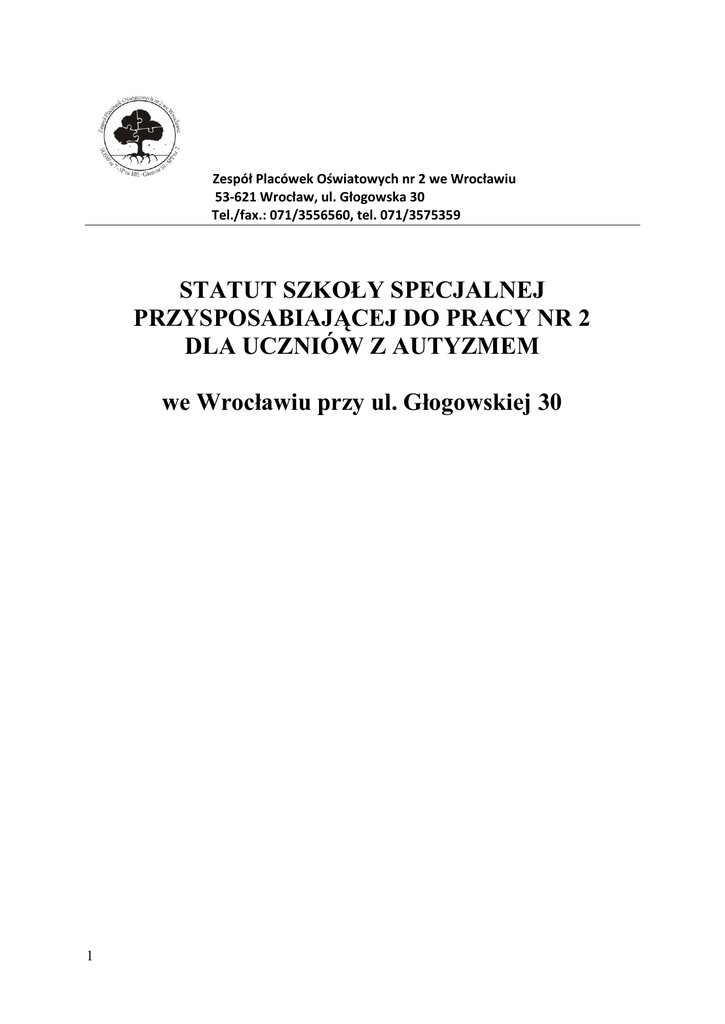 Zespół Placówek Oświatowych nr 2 we Wrocławiu 53-621 Wrocław, ul. Głogowska 30 Tel./fax.: 071/3556560, tel. 071/3575359 STATUT SZKOŁY SPECJALNEJ PRZYSPOSABIAJĄCEJ DO PRACY NR 2 DLA UCZNIÓW Z AUTYZMEM we Wrocławiu przy ul. Głogowskiej 30 1 § 1. Ilekroć w dalszych przepisach jest mowa bez bliższego określenia o: - Szkole - należy przez to rozumieć Szkołę Specjalną Przysposabiającą do Pracy nr 2 dla Uczniów z Autyzmem, - Ustawie - należy przez to rozumieć ustawę z dnia 7 września 1991 r. o systemie oświaty (tj. Dz. U. z 2004 r. Nr 256, poz. 2572 ze zm.), - Statucie – należy przez to rozumieć Statut Szkoły Specjalnej Przysposabiającej do Pracy nr 2, - Uczniu – należy przez to rozumieć ucznia z orzeczonym autyzmem, funkcjonującego na poziomie upośledzenia umysłowego w stopniu umiarkowanym lub znacznym oraz ucznia z autyzmem i niepełnosprawnościami sprzężonymi. § 2. 1. Szkoła nosi nazwę: Szkoła Specjalna Przysposabiająca do Pracy nr 2 dla Uczniów z Autyzmem. 2. Siedzibą Szkoły jest budynek przy ul. Głogowskiej 30 we Wrocławiu. 3. Szkoła wchodzi w skład Zespołu Placówek Oświatowych nr 2. 4. Szkoła prowadzi kształcenie w 3 - letnim cyklu kształcenia dla uczniów z autyzmem i z upośledzeniem umysłowym w stopniu umiarkowanym lub znacznym oraz uczniów z autyzmem i z niepełnosprawnościami sprzężonymi. § 3. 1. Organem prowadzącym Szkołę jest Miasto Wrocław. 2. Organem sprawującym nadzór pedagogiczny nad szkołą jest Dolnośląski Kurator Oświaty. § 4. 1. Szkoła realizuje cele i zadania określone w ustawie koncentrując się na prowadzeniu działalności dydaktycznej, wychowawczej i opiekuńczej. 2. Szkoła przygotowuje ucznia do samodzielnego funkcjonowania, z uwzględnieniem jego potrzeb i możliwości edukacyjnych. 3. Głównym celem pracy dydaktycznej i wychowawczej Szkoły jest przygotowanie uczniów do życia w integracji ze społeczeństwem. Cele i zadania pracy rewalidacyjnej, wychowawczej i dydaktycznej Szkoły wynikają z zasad pedagogiki specjalnej dostosowanych do możliwości, potrzeb i stopnia zaburzeń każdego dziecka indywidualnie. 3. Kształcenie obejmuje: 2 1) kształcenie ogólne umożliwiające utrwalenie i poszerzenie zakresu posiadanej wiedzy i nabywanie nowych umiejętności, 2) przysposobienie do pracy rozumiane jako: kształtowanie właściwych postaw wobec pracy, przyswajanie podstawowej wiedzy o pracy i poznawanie typowych sytuacji związanych z pracą, uczenie wykonywania różnych prac, w tym porządkowych i pomocniczych, oraz opanowanie podstawowych umiejętności i czynności pracy, a także przygotowanie do podjęcia samodzielnej lub wspomaganej pracy na określonym stanowisku na wolnym lub chronionym rynku pracy. 4. Działalność edukacyjna Szkoły opiera się na indywidualnych programach edukacyjnych, opracowanych przez nauczycieli i specjalistów pracujących z uczniem oraz na programach przysposobienia do pracy, o profilach dostosowanych do możliwości psychofizycznych i percepcyjnych uczniów. 5. Szkoła wyrabia u uczniów niezależność życiową i przygotowuje do uczestnictwa w różnych formach życia społecznego. 6. W procesie kształcenia nauczyciele współpracują z rodzicami (prawnymi opiekunami) uczniów, ustalając kierunki oddziaływań wychowawczo-edukacyjnych i konsultując z nimi sposoby rozwiązywania problemów ucznia respektujące wyznawane przez rodzinę wartości. 7. W procesie kształcenia uczniów wyodrębnia się: 1) zajęcia edukacyjne z zakresu funkcjonowania osobistego, społecznego i wychowania fizycznego, 2) zajęcia warsztatowe i praktyczne przysposabiające do pracy, 3) zajęcia rewalidacyjne, 4) zajęcia sportowe, 5) zajęcia kształtujące kreatywność, w szczególności muzyka, plastyka, zajęcia rozwijające zainteresowania, zajęcia kształtujące umiejętność spędzania wolnego czasu, 6) nauczanie religii (etyki), zgodnie z indywidualnym wyborem ucznia lub jego rodziców. 8. Działalność edukacyjna szkoły jest określona przez: 1) indywidualne programy edukacyjne, 2) program wychowawczy szkoły, który opisuje w sposób całościowy wszystkie treści i działania o charakterze wychowawczym i jest realizowany przez wszystkich nauczycieli, 3) program profilaktyki dostosowany do potrzeb rozwojowych uczniów oraz potrzeb danego środowiska, który opisuje w sposób całościowy wszystkie treści i działania szkoły zapobiegające zjawisku przemocy, patologiom życia społecznego oraz wspierające promocję zdrowia i wychowanie do życia w rodzinie, a także inne zagadnienia, ważne dla osoby dorosłej, z zaburzeniami autystycznymi niepełnosprawnej intelektualnie, które wynikają z potrzeb uczniów, 4) program przysposobienia do pracy opracowany dla danego oddziału, który opisuje wszystkie działania szkoły przygotowujące ucznia do wykonywania pracy. 3 9. W celu nabywania praktycznych umiejętności związanych z pracą szkoła zapewnia uczniowi zajęcia przysposobienia do pracy oraz - zgodnie z jego predyspozycjami i zainteresowaniami zajęcia praktyczne w pracowniach szkolnych i poza szkołą. 10. W Szkole tworzy się „Zespoły Nauczycielskie”, których zadaniem w szczególności jest tworzenie indywidualnych programów kształcenia ogólnego i przysposobienia do pracy, uwzględniających korelację programową. 1) W miarę potrzeb tworzy się inne „Zespoły problemowo-zadaniowe”. 2) Pracą Zespołu kieruje przewodniczący powoływany przez dyrektora, na wniosek Zespołu. 2. W Szkole obowiązuje ocena opisowa: 1) z zachowania ucznia, uwzględniająca indywidualne cechy rozwoju emocjonalnego i społecznego, 2) z osiągnięć edukacyjnych i opanowanych umiejętności w zakresie kształcenia ogólnego i przysposobienia do pracy, 3) Ocena poziomu funkcjonowania ucznia odbywa się w oparciu o Profil Psychoedukacyjny dla Młodzieży i Dorosłych (AAPEP) G. Masibow, E. Schopler, B. Schaffer, R. Landrus zawierający następujące skal
