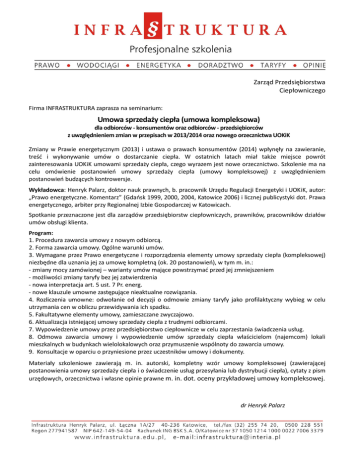 Zarząd Przedsiębiorstwa Ciepłowniczego Firma INFRASTRUKTURA zaprasza na seminarium: Umowa sprzedaży ciepła (umowa kompleksowa) dla odbiorców - konsumentów oraz odbiorców - przedsiębiorców z uwzględnieniem zmian w przepisach w 2013/2014 oraz nowego orzecznictwa UOKiK Zmiany w Prawie energetycznym (2013) i ustawa o prawach konsumentów (2014) wpłynęły na zawieranie, treść i wykonywanie umów o dostarczanie ciepła. W ostatnich latach miał także miejsce powrót zainteresowania UOKiK umowami sprzedaży ciepła, czego wyrazem jest nowe orzecznictwo. Szkolenie ma na celu omówienie postanowień umowy sprzedaży ciepła (umowy kompleksowej) z uwzględnieniem postanowień budzących kontrowersje. Wykładowca: Henryk Palarz, doktor nauk prawnych, b. pracownik Urzędu Regulacji Energetyki i UOKiK, autor: „Prawo energetyczne. Komentarz” (Gdańsk 1999, 2000, 2004, Katowice 2006) i licznej publicystyki dot. Prawa energetycznego, arbiter przy Regionalnej Izbie Gospodarczej w Katowicach. Spotkanie przeznaczone jest dla zarządów przedsiębiorstw ciepłowniczych, prawników, pracowników działów umów obsługi klienta. Program: 1. Procedura zawarcia umowy z nowym odbiorcą. 2. Forma zawarcia umowy. Ogólne warunki umów. 3. Wymagane przez Prawo energetyczne i rozporządzenia elementy umowy sprzedaży ciepła (kompleksowej) niezbędne dla uznania jej za umowę kompletną (ok. 20 postanowień), w tym m. in.: - zmiany mocy zamówionej – warianty umów mające powstrzymać przed jej zmniejszeniem - możliwości zmiany taryfy bez jej zatwierdzenia - nowa interpretacja art. 5 ust. 7 Pr. energ. - nowe klauzule umowne zastępujące nieaktualne rozwiązania. 4. Rozliczenia umowne: odwołanie od decyzji o odmowie zmiany taryfy jako profilaktyczny wybieg w celu utrzymania cen w obliczu przewidywania ich spadku. 5. Fakultatywne elementy umowy, zamieszczane zwyczajowo. 6. Aktualizacja istniejącej umowy sprzedaży ciepła z trudnymi odbiorcami. 7. Wypowiedzenie umowy przez przedsiębiorstwo ciepłownicze w celu zaprzestania świadczenia usług. 8. Odmowa zawarcia umowy i wypowiedzenie umów sprzedaży ciepła właścicielom (najemcom) lokali mieszkalnych w budynkach wielolokalowych oraz przymuszenie wspólnoty do zawarcia umowy. 9. Konsultacje w oparciu o przyniesione przez uczestników umowy i dokumenty. Materiały szkoleniowe zawierają m. in. autorski, kompletny wzór umowy kompleksowej (zawierającej postanowienia umowy sprzedaży ciepła i o świadczenie usług przesyłania lub dystrybucji ciepła), cytaty z pism urzędowych, orzecznictwa i własne opinie prawne m. in. dot. oceny przykładowej umowy kompleksowej. dr Henryk Palarz FORMULARZ ZGŁOSZENIOWY Wypełniony formularz prosimy odesłać na nr faksu: (32) 255 74 20 lub mailem: [email protected] Zgłaszam udział w seminarium: Umowa sprzedaży ciepła (umowa kompleksowa)… Termin i miejsce: (zaznacz właściwe) Białystok, 14 października 2015, Hotel Branicki, ul. Zamenhofa 25, sala parter Olsztyn, 15 października 2015, Hotel Warmiński, ul. Kołobrzeska 1, s. Brzozowa Szkolenie odbędzie się w godzinach od 10.00 do 15.00 / lunch o 13.00. 1. ..................................................................................................................................................... 2. ..................................................................................................................................................... 3. ..................................................................................................................................................... Imię i nazwisko, stanowisko uczestnika Nazwa uczestnika i adres z kodem pocztowym (lub odcisk pieczęci firmowej) Telefon z numerem kierunkowym Fax Warunki uczestnictwa w seminarium: Koszt uczestnictwa 1 osoby wynosi: 380,- zł. + 23 % VAT Cena dla drugiej i kolejnej osoby: 350,- zł. + 23 % VAT Dla gmin i zakładów budżetowych cena nie obejmuje podatku VAT. Cena obejmuje także: materiały szkoleniowe, bufet kawowy, lunch, certyfikat. Pozostałe warunki: ① Przesłanie zgłoszenia: faksem lub pocztą (e-mailem) do 3 dni roboczych przed datą rozpoczęcia seminarium. ② Dokonanie przelewu na konto: Infrastruktura Henryk Palarz, ING Bank Śląski S.A. O/Katowice, ul. Mickiewicza 3, 40951 Katowice, nr 37 1050 1214 1000 0022 7006 3379. ③ Rezygnację przyjmujemy do 3 dni roboczych przed rozpoczęciem seminarium. W wypadku późniejszej rezygnacji Zamawiający będzie obciążony kwotą w wysokości 50% jego wartości i otrzymuje materiały szkoleniowe. Jeżeli Zamawiający nie może uczestniczyć w seminarium może wskazać w zamian inną osobę. ④ W wypadku odwołania seminarium (lub wyczerpania miejsc) w ustalonym terminie organizator zaproponuje inny termin lub zwróci uiszczoną kwotę w całości. ⑤ Niniejsze zgłoszenie upoważnia firmę Infrastruktura Henryk Palarz do wystawienia faktury VAT z tytułu szkolenia bez podpisu odbiorcy. Oświadczam, że jesteśmy płatnikiem VAT o numerze NIP: ............................................................... pieczęć i podpis