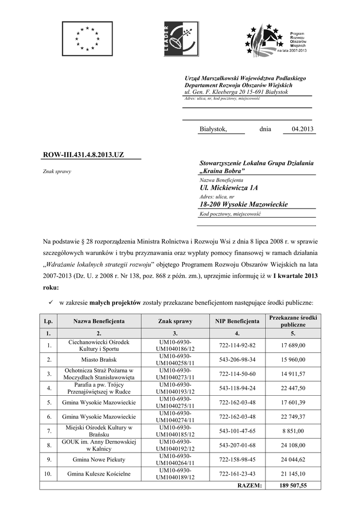 Urząd Marszałkowski Województwa Podlaskiego Departament Rozwoju Obszarów Wiejskich ul. Gen. F. Kleeberga 20 15-691 Białystok Adres: ulica, nr, kod pocztowy, miejscowość Białystok, dnia 04.2013 ROW-III.431.4.8.2013.UZ Stowarzyszenie Lokalna Grupa Działania „Kraina Bobra” Znak sprawy Nazwa Beneficjenta Ul. Mickiewicza 1A Adres: ulica, nr 18-200 Wysokie Mazowieckie Kod pocztowy, miejscowość Na podstawie § 28 rozporządzenia Ministra Rolnictwa i Rozwoju Wsi z dnia 8 lipca 2008 r. w sprawie szczegółowych warunków i trybu przyznawania oraz wypłaty pomocy finansowej w ramach działania „Wdrażanie lokalnych strategii rozwoju” objętego Programem Rozwoju Obszarów Wiejskich na lata 2007-2013 (Dz. U. z 2008 r. Nr 138, poz. 868 z późn. zm.), uprzejmie informuję iż w I kwartale 2013 roku: w zakresie małych projektów zostały przekazane beneficjentom następujące środki publiczne: Lp. Nazwa Beneficjenta Znak sprawy NIP Beneficjenta 1. 2. Ciechanowiecki Ośrodek Kultury i Sportu 3. UM10-6930UM1040186/12 UM10-6930UM1040258/11 UM10-6930UM1040273/11 UM10-6930UM1040193/12 UM10-6930UM1040275/11 UM10-6930UM1040274/11 UM10-6930UM1040185/12 UM10-6930UM1040192/12 UM10-6930UM1040264/11 UM10-6930UM1040189/12 4. Przekazane środki publiczne 5. 722-114-92-82 17 689,00 543-206-98-34 15 960,00 722-114-50-60 14 911,57 543-118-94-24 22 447,50 722-162-03-48 17 601,39 722-162-03-48 22 749,37 543-101-47-65 8 851,00 543-207-01-68 24 108,00 722-158-98-45 24 044,62 722-161-23-43 21 145,10 1. 2. 3. 4. Miasto Brańsk Ochotnicza Straż Pożarna w Moczydłach Stanisławowięta Parafia a pw. Trójcy Przenajświętszej w Rudce 5. Gmina Wysokie Mazowieckie 6. Gmina Wysokie Mazowieckie 7. 8. Miejski Ośrodek Kultury w Brańsku GOUK im. Anny Dernowskiej w Kalnicy 9. Gmina Nowe Piekuty 10. Gmina Kulesze Kościelne RAZEM: 189 507,55 w ramach działania „Odnowa i rozwój wsi” zostały przekazane beneficjentom następujące środki publiczne: Lp. Nazwa Beneficjenta Znak sprawy NIP Beneficjenta 1. 2. 4. 1. Miasto Brańsk 543-206-98-34 277 084,00 2. Gmina Szepietowo 3. UM10-6930UM1030017/12 UM10-6930UM1030022/11 Przekazane środki publiczne 5. 722-156-02-21 192 247,00 RAZEM: 469 331,00