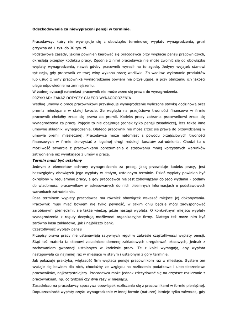 Odszkodowania za niewypłaceni pensji w terminie. Pracodawcy, który nie wywiązuje się z obowiązku terminowej wypłaty wynagrodzenia, grozi grzywna od 1 tys. do 30 tys. zł. Podstawowe zasady, jakimi powinien kierować się pracodawca przy wypłacie pensji pracowniczych, określają przepisy kodeksu pracy. Zgodnie z nimi pracodawca nie może zwolnić się od obowiązku wypłaty wynagrodzenia, nawet gdyby pracownik wyraził na to zgodę. Jedyny wyjątek stanowi sytuacja, gdy pracownik ze swej winy wykona pracę wadliwie. Za wadliwe wykonanie produktów lub usług z winy pracownika wynagrodzenie bowiem nie przysługuje, a przy obniżeniu ich jakości ulega odpowiedniemu zmniejszeniu. W żadnej sytuacji natomiast pracownik nie może zrzec się prawa do wynagrodzenia. PRZYKŁAD: ZAKAZ DOTYCZY CAŁEGO WYNAGRODZENIA Według umowy o pracę pracownikowi przysługuje wynagrodzenie wyliczone stawką godzinową oraz premia miesięczna w stałej kwocie. Ze względu na przejściowe trudności finansowe w firmie pracownik chciałby zrzec się prawa do premii. Kodeks pracy zabrania pracownikowi zrzec się wynagrodzenia za pracę. Pojęcie to nie obejmuje jednak tylko pensji zasadniczej, lecz także inne umowne składniki wynagrodzenia. Dlatego pracownik nie może zrzec się prawa do przewidzianej w umowie premii miesięcznej. Pracodawca może natomiast z powodu przejściowych trudności finansowych w firmie skorzystać z legalnej drogi redukcji kosztów zatrudnienia. Chodzi tu o możliwość zawarcia z pracownikami porozumienia o stosowaniu mniej korzystnych warunków zatrudnienia niż wynikające z umów o pracę. Termin musi być ustalony Jednym z elementów ochrony wynagrodzenia za pracę, jaką przewiduje kodeks pracy, jest bezwzględny obowiązek jego wypłaty w stałym, ustalonym terminie. Dzień wypłaty powinien być określony w regulaminie pracy, a gdy pracodawca nie jest zobowiązany do jego wydania - podany do wiadomości pracowników w adresowanych do nich pisemnych informacjach o podstawowych warunkach zatrudnienia. Poza terminem wypłaty pracodawca ma również obowiązek wskazać miejsce jej dokonywania. Pracownik musi mieć bowiem nie tylko pewność, w jakim dniu będzie mógł zadysponować zarobionymi pieniędzmi, ale także wiedzę, gdzie nastąpi wypłata. O konkretnym miejscu wypłaty wynagrodzenia z reguły decydują możliwości organizacyjne firmy. Dlatego też może nim być zarówno kasa zakładowa, jak i najbliższy bank. Częstotliwość wypłaty pensji Przepisy prawa pracy nie ustanawiają sztywnych reguł w zakresie częstotliwości wypłaty pensji. Stąd też materia ta stanowi zasadniczo domenę zakładowych uregulowań płacowych, jednak z zachowaniem gwarancji ustalonych w kodeksie pracy. Te z kolei wymagają, aby wypłata następowała co najmniej raz w miesiącu w stałym i ustalonym z góry terminie. Jak pokazuje praktyka, większość firm wypłaca pensje pracownikom raz w miesiącu. System ten wydaje się bowiem dla nich, chociażby ze względu na rozliczenia podatkowe i ubezpieczeniowe pracowników, najkorzystniejszy. Pracodawca może jednak zdecydować się na częstsze rozliczanie z pracownikiem, np. co tydzień czy dwa razy w miesiącu. Zasadniczo na pracodawcy spoczywa obowiązek rozliczania się z pracownikami w formie pieniężnej. Dopuszczalność wypłaty części wynagrodzenie w innej formie (naturze) istnieje tylko wówczas, gdy przewidują to ustawowe przepisy prawa pracy lub postanowienia układu zbiorowego pracy. Dla pracownika oznacza to gwarancję wypłaty całej pensji w pieniądzu, jeżeli z wymienionych przepisów nie wynika nic innego. Najpóźniej do 10 dnia miesiąca Wynagrodzenie za pracę powinno być wypłacone niezwłocznie po ustaleniu jego pełnej wysokości, jednakże nie później niż w ciągu pierwszych dziesięciu dni następnego miesiąca kalendarzowego. O tym, kiedy następuje wypłata pensji, decyduje zasadniczo system wynagradzania obowiązujący u danego pracodawcy. Przyjmuje się, że pracodawca wypłacający wynagrodzenie raz w miesiącu może dokonać jego wypłaty w ciągu dziesięciu dni następnego miesiąca kalendarzowego, jeżeli wcześniejsze ustalenie pełnej wysokości wynagrodzenia jest niemożliwe lub utrudnione. W pozostałych przypadkach wypłata wynagrodzenia powinna nastąpić najpóźniej do końca miesiąca. Niekiedy może się zdarzyć, że ustalony termin wypłaty przypadnie w dniu wolnym od pracy. Kodeks pracy nie pozostawia tej kwestii woli pracodawcy, lecz przewiduje konkretne rozwiązanie na taką okoliczność. Jeśli bowiem ustalony dzień wypłaty jest dniem wolnym od pracy, wynagrodzenie powinno być wypłacone w dniu poprzedzającym. Odsetki za opóźnienie Określenie terminu wypłaty wynagrodzenia za pracę rodzi po stronie pracodawcy określone obowiązki, na przykład jeżeli wynagrodzenie zostało wypłacone z terminie późniejszym od ustalonego, pracownik może żądać odsetek za czas odpowiadający okresowi opóźnienia. Konieczność zapłaty odsetek powstaje, choćby pracownik nie poniósł żadnej szkody i choćby opóźnienie było następstwem okoliczności, za które pracodawca nie ponosi odpowiedzialności (np. wierzyciele pracodawcy nie dokonują w terminie zapłaty należności, co spowoduje, że pracodawca nie ma środków finansowych na dokonanie wypłaty wynagrodzeń). Podstawa roszczenia pracownika o zapłatę odsetek od wymaganej, a niewypłaconej należności jest art. 481 k.c. w związku z art. 300 k.p. Odsetki z tytułu opóźnienia w wypłacie wynagrodzenia za pracę przysługują pracownikowi za czas opóźnienia także w części, od której pracodawca odprowadził składki na ubezpieczenie społeczne i zdrowotne oraz zaliczkę na podatek dochodowy od osób fizycznych (uchwała Sądu Najwyższego z 19 września 2002 r., III PZP 18/02, OSNP 2003/9/214). Prawo do odszkodowania Pracownik, któremu pracodawca nie wypłacił wynagrodzenia w terminie, może też dochodz
