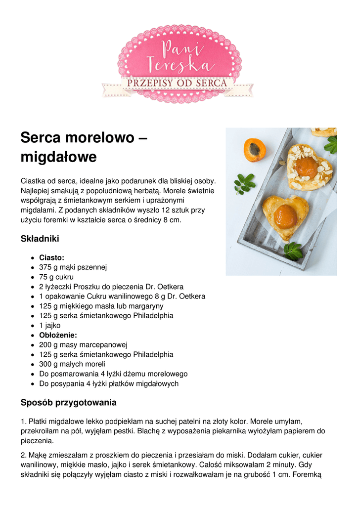 Serca morelowo – migdałowe Ciastka od serca, idealne jako podarunek dla bliskiej osoby. Najlepiej smakują z popołudniową herbatą. Morele świetnie współgrają z śmietankowym serkiem i uprażonymi migdałami. Z podanych składników wyszło 12 sztuk przy użyciu foremki w kształcie serca o średnicy 8 cm. Składniki Ciasto: 375 g mąki pszennej 75 g cukru 2 łyżeczki Proszku do pieczenia Dr. Oetkera 1 opakowanie Cukru wanilinowego 8 g Dr. Oetkera 125 g miękkiego masła lub margaryny 125 g serka śmietankowego Philadelphia 1 jajko Obłożenie: 200 g masy marcepanowej 125 g serka śmietankowego Philadelphia 300 g małych moreli Do posmarowania 4 łyżki dżemu morelowego Do posypania 4 łyżki płatków migdałowych Sposób przygotowania 1. Płatki migdałowe lekko podpiekłam na suchej patelni na złoty kolor. Morele umyłam, przekroiłam na pół, wyjęłam pestki. Blachę z wyposażenia piekarnika wyłożyłam papierem do pieczenia. 2. Mąkę zmieszałam z proszkiem do pieczenia i przesiałam do miski. Dodałam cukier, cukier wanilinowy, miękkie masło, jajko i serek śmietankowy. Całość miksowałam 2 minuty. Gdy składniki się połączyły wyjęłam ciasto z miski i rozwałkowałam je na grubość 1 cm. Foremką wycięłam serca i ułożyłam je na blasze. 3. Masę marcepanową pokroiłam na małe kawałeczki, dodałam do niej serek śmietankowy i zmiksowałam. Tak przygotowaną masą posmarowałam ciastka, zostawiając około 1 cm wolnego brzegu. Na środek każdego serduszka położyłam morelę (środkiem do dołu), a następnie wstawiłam do piekarnika nagrzanego do 180°C i piekłam 25 minut. 4. Dżem morelowy przetarłam przez sito i podgrzałam w rondelku. Moje upieczone ciasteczka posmarowałam jeszcze gorącym dżemem i posypałam płatkami migdałów. 5. Smacznego! :-)