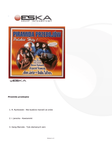 Piramida przebojów 1. R. Rynkowski - Nie budźcie marzeń ze snów 2. I. Jarocka - Kawiarenki 3. Gang Marcela - Tyle złamanych serc Strona 1 z 3 4. Vox - Zabiorę Cię Magdaleno 5. K. Krawczyk - Tylko wybacz mi 6. J. Różycki - Julia 7. A. Jantar, Budka Suflera - Nic nie może wiecznie trwać 8. 2 + 1 - Wielki mały człowiek 9. M. Durecka - Nie znamy siebie 10. Universe - Ile trzeba iść 11. Gnag Marcela - Kto jeśli nie Ty 12. Vox - Szczęśliwej drogi 13. Garden Party - Nie tak miało być 14. K. Krawczyk - Arivederci moja dziewczyno 15. D. Mizgalska - Jesteś moją Lady 16. J. Różycki - Jak łatwo zapomnieć 17. Universe - Proste słowo miłość Strona 2 z 3 Strona 3 z 3