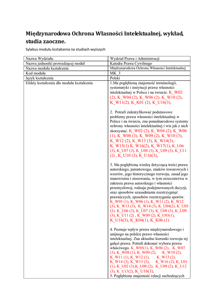 Międzynarodowa Ochrona Własności Intelektualnej, wykład, studia zaoczne. Sylabus modułu kształcenia na studiach wyższych Nazwa Wydziału Nazwa jednostki prowadzącej moduł Nazwa modułu kształcenia Kod modułu Język kształcenia Efekty kształcenia dla modułu kształcenia Wydział Prawa i Administracji Katedra Prawa Cywilnego Międzynarodowa Ochrona Własności Intelektualnej MK_3 Polski 1.Ma pogłębioną znajomość terminologii, systematyki i instytucji prawa własności intelektualnej w Polsce i na świecie. K_W02 (2), K_W04 (2), K_W06 (2), K_W10 (2), K_W11(2), K_K01 (2), K_U16(3), 2. Potrafi zidentyfikować podstawowe problemy prawa własności intelektualnej w Polsce i na świecie, zna ponadnarodowe systemy ochrony własności intelektualnej i wie jak z nich skorzystać. K_W02 (2), K_W04 (2), K_W06 (1), K_W08 (3), K_W09 (2), K_W10 (3), K_W12 (2), K_W13 (3), K_W14(3), K_W15(1) K_W16(2), K_W17(1), K_U06 (3), K_U07 (3), K_U08 (3), K_U09 (3), K_U11 (2) , K_U10 (3), K_U16(3), 3. Ma pogłębioną wiedzę dotyczącą treści prawa autorskiego, patentowego, znaków towarowych i wzorów, jego historycznego rozwoju, zasad jego stanowienia i stosowania, w tym orzecznictwa w zakresie prawa autorskiego i własności przemysłowej, rodzaju podejmowanych decyzji, oraz sposobów uzasadniania rozstrzygnięć prawniczych, sposobów rozstrzygania sporów. K_W05 (1), K_W06 (1), K_W11 (2), K_W12 (3), K_W13 (3), K_W14 (3), K_U04(2), K_U05 (2), K_U06 (3), K_U07 (3), K_U08 (3), K_U09 (3), K_U11 (2) , K_W09 (2), K_U03(1), K_U16(3), K_K04(1), K_K06 (1) 4. Poznaje wpływ prawa międzynarodowego i unijnego na polskie prawo własności intelektualnej. Zna aktualne kierunki rozwoju tej gałęzi prawa. Potrafi dokonać wyboru prawa właściwego. K_W05(1), K_W06 (2), K_W07 (3), K_W08 (1), K_W09 (2), K_W10 (2), K_W11 (1), K_W12 (1), K_W13 (2), K_W14 (3), K_W15 (2), K_W16 (2), K_U01 (1), K_U02 (3),K_U08 (2), K_U09 (2), K_U12 (3), K_U13(2), K_U16(3), 5. Pogłębiona znajomość relacji zachodzących Typ modułu kształcenia (obowiązkowy/fakultatywny) Rok studiów Semestr Imię i nazwisko osoby/osób prowadzących moduł Imię i nazwisko osoby/osób egzaminującej/egzaminujących bądź udzielającej zaliczenia, w przypadku gdy nie jest to osoba prowadząca dany moduł Sposób realizacji Wymagania wstępne i dodatkowe Rodzaj i liczba godzin zajęć dydaktycznych wymagających bezpośredniego udziału nauczyciela akademickiego i studentów, gdy wdanym module przewidziane są takie zajęcia (tzw. godziny kontaktowe) Liczba punktów ECTS przypisana modułowi Bilans punktów ECTS Stosowane metody dydaktyczne Metody sprawdzania i kryteria oceny efektów kształcenia uzyskanych przez studentów Forma i warunki zaliczenia modułu, w tym zasady dopuszczenia do egzaminu, pomiędzy systemem ekonomicznym i kulturowym a kształtem uregulowań prawa własności intelektualnej, w szczególności w zakresie rozwoju innowacyjnej gospodarki, społeczeństwa informatycznego, zrozumienie relacji pomiędzy systemem prawa a innymi systemami społecznymi, K_W03 (2), K_W17 (1), K_U01 (3), K_K01 (2), K_U04(2), K_U17(3), fakultatywny III - V II dr Piotr Kostański dr Piotr Kostański Wykład, Zaliczenie II roku studiów wykład – 21 godziny egzamin – 3 godziny konsultacje wykładowcy (dyżur) – 10 godzin Łącznie godzin kontaktowych – 34 4 ECTS 4 ECTS t.j. (4 x 25 = 100) w tym: 34 godzin kontaktowych 66 godziny niekontaktowe (praca własna studenta) Wykład, odczyt, opis, prezentacja multimedialna, dyskusja dydaktyczna Egzamin pisemny lub ustny polegający na rozwiązywaniu 2 kazusów (3 godziny) Egzamin, brak warunków wstępnych. Zapisy na egzamin poprzez system USOS. Możliwość przystąpienia do egzaminu przedterminowego organizowanego na ostatnim wykładzie (konieczność pisemnego zadeklarowania udziału w egzaminie – lista na poprzednim wykładzie) . Zaliczenia, a także forma i warunki zaliczenia poszczególnych zajęć wchodzących w zakres danego modułu Treści modułu kształcenia Brak zaliczeń częściowych 1. Geneza regulacji międzynarodowych w dziedzinie prawa własności intelektualnej. Przedmiot własności intelektualnej. Własność przemysłowa, prawa autorskie. Specyfika przedmiotu ochrony a potrzeba regulacji ponadnarodowej. Zasada terytorialności ochrony. Rozwój historyczny regulacji międzynarodowego prawa własności intelektualnej. 2. Problematyka wykładni norm prawa międzynarodowego. Umowy międzynarodowe w systemie źródeł prawa RP. 3. Problematyka prawa właściwego dla praw własności intelektualnej oraz jurysdykcji krajowej w sprawach ochrony praw własności intelektualnej. 4. Międzynarodowe gwarancje ochrony praw na dobrach niematerialnych. Europejska 5. Międzynarodowe prawo autorskie. Konwencja Berneńska, 1886. Konwencja Rzymska, 1961. Nowe traktaty WIPO. 6. Prawo autorskie w Unii Europejskiej. 7. Ochrona baz danych w prawie UE, dyrektywa nr 96/9 i jej implementacja do prawa polskiego. 8. Międzynarodowe prawo własności przemysłowej. Konwencja Paryska 1883. 9. Konwencja Sztokholmska o ustanowieniu Światowej Organizacji Własności Intelektualnej, 1967. Światowa Organizacja Własności Intelektualnej WIPO. Organizacja, status międzynarodowy, organy i formy działania. Umowy międzynarodowe zawarte w ramach WIPO. 10. Porozumienie w sprawie handlowych aspektów praw własności intelektualnej, TRIPS, 1994. 11. Wspólnotowe prawo własności przemysłowej, zagadnienia odnoszące się do wszystkich dóbr chronionych prawami własności przemysłowej – dyrektywa 2004/48 dotycząca egzekwowania praw własności intelektualnej. 12. Międzynarodowe prawo patentowe. Układ o współpracy patentowej, PCT, 1970, procedura uzyskiwania ochrony na podstawie Układu. Traktat budapesztański o międzynarodowym uznawaniu depozytów drobnoustrojów dla celów postępowania patentowego, 1977; Porozumienie strasburskie dotyczące międzynarodowej klasyfikacji patentowej, 1971. Traktat 