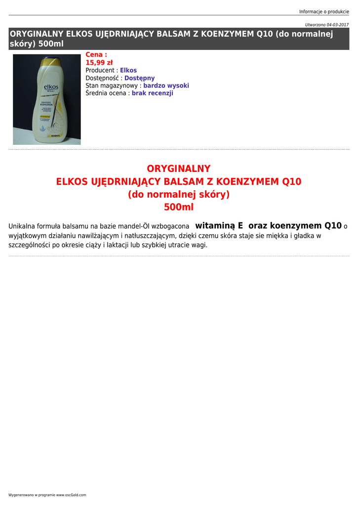 Informacje o produkcie Utworzono 04-03-2017 ORYGINALNY ELKOS UJĘDRNIAJĄCY BALSAM Z KOENZYMEM Q10 (do normalnej skóry) 500ml Cena : 15,99 zł Producent : Elkos Dostępność : Dostępny Stan magazynowy : bardzo wysoki Średnia ocena : brak recenzji ORYGINALNY ELKOS UJĘDRNIAJĄCY BALSAM Z KOENZYMEM Q10 (do normalnej skóry) 500ml Unikalna formuła balsamu na bazie mandel-Öl wzbogacona witaminą E oraz koenzymem wyjątkowym działaniu nawilżającym i natłuszczającym, dzięki czemu skóra staje sie miękka i gładka w szczególności po okresie ciąży i laktacji lub szybkiej utracie wagi. Wygenerowano w programie www.oscGold.com Q10 o