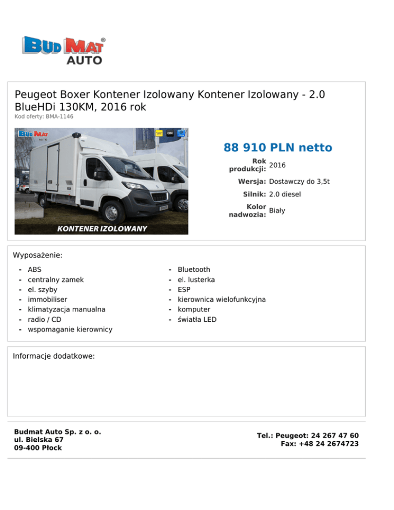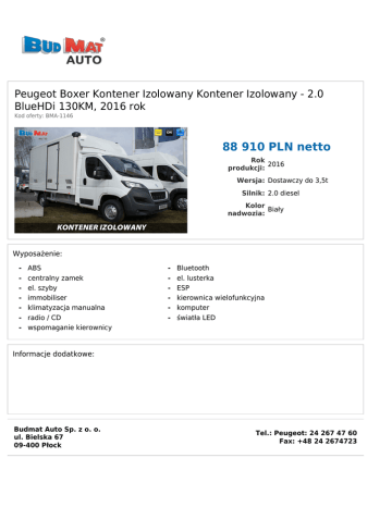 Peugeot Boxer Kontener Izolowany Kontener Izolowany - 2.0 BlueHDi 130KM, 2016 rok Kod oferty: BMA-1146 88 910 PLN netto Rok 2016 produkcji: Wersja: Dostawczy do 3,5t Silnik: 2.0 diesel Kolor Biały nadwozia: Wyposażenie: - ABS centralny zamek el. szyby immobiliser klimatyzacja manualna radio / CD wspomaganie kierownicy - Bluetooth el. lusterka ESP kierownica wielofunkcyjna komputer światła LED Informacje dodatkowe: Budmat Auto Sp. z o. o. ul. Bielska 67 09-400 Płock Tel.: Peugeot: 24 267 47 60 Fax: +48 24 2674723