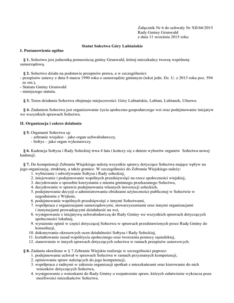 Załącznik Nr 6 do uchwały Nr XII/66/2015 Rady Gminy Grunwald z dnia 11 września 2015 roku Statut Sołectwa Góry Lubiańskie I. Postanowienia ogólne § 1. Sołectwo jest jednostką pomocniczą gminy Grunwald, której mieszkańcy tworzą wspólnotę samorządową. § 2. Sołectwo działa na podstawie przepisów prawa, a w szczególności: - przepisów ustawy z dnia 8 marca 1990 roku o samorządzie gminnym (tekst jedn. Dz. U. z 2013 roku poz. 594 ze zm.), - Statutu Gminy Grunwald - niniejszego statutu. § 3. Teren działania Sołectwa obejmuje miejscowości: Góry Lubiańskie, Lubian, Lubianek, Ulnowo. § 4. Zadaniem Sołectwa jest organizowanie życia społeczno-gospodarczego wsi oraz podejmowanie inicjatyw we wszystkich sprawach Sołectwa. II. Organizacja i zakres działania § 5. Organami Sołectwa są: - zebranie wiejskie – jako organ uchwałodawczy, - Sołtys – jako organ wykonawczy. § 6. Kadencja Sołtysa i Rady Sołeckiej trwa 4 lata i kończy się z dniem wyborów organów Sołectwa nowej kadencji. § 7. Do kompetencji Zebrania Wiejskiego należą wszystkie sprawy dotyczące Sołectwa mające wpływ na jego organizację, strukturę, a także granice. W szczególności do Zebrania Wiejskiego należy: 1. wybieranie i odwoływanie Sołtysa i Rady sołeckiej, 2. inicjowanie i podejmowanie wspólnych przedsięwzięć na rzecz społeczności wiejskiej, 3. decydowanie o sposobie korzystania z mienia gminnego przekazanego Sołectwu, 4. decydowanie w sprawie podejmowania własnych inwestycji sołeckich, 5. podejmowanie decyzji o administrowaniu obiektami użyteczności publicznej w Sołectwie w uzgodnieniu z Wójtem, 6. podejmowanie wspólnych przedsięwzięć z innymi Sołectwami, 7. współpraca z organizacjami samorządowymi, stowarzyszeniami oraz innymi organizacjami i instytucjami prowadzącymi działalność na wsi, 8. występowanie z inicjatywą uchwałodawczą do Rady Gminy we wszystkich sprawach dotyczących społeczności lokalnej, 9. wyrażenie opinii w części dotyczącej Sołectwa w sprawach przedstawionych przez Radę Gminy do konsultacji, 10. dokonywanie okresowych ocen działalności Sołtysa i Rady Sołeckiej, 11. kształtowanie zasad współżycia społecznego oraz tworzenia pomocy sąsiedzkiej, 12. stanowienie w innych sprawach dotyczących sołectwa w ramach przepisów ustawowych. § 8. Zadania określone w § 7 Zebranie Wiejskie realizuje w szczególności poprzez: 1. podejmowanie uchwał w sprawach Sołectwa w ramach przyznanych kompetencji, 2. opiniowanie spraw należących do jego kompetencji, 3. współpraca z radnymi w zakresie organizacji spotkań z mieszkańcami oraz kierowanie do nich wniosków dotyczących Sołectwa, 4. występowanie z wnioskami do Rady Gminy o rozpatrzenie spraw, których załatwienie wykracza poza możliwości mieszkańców Sołectwa. § 9. 1. Uchwały i wnioski Zebrania Wiejskiego zapadają zwykłą większością głosów (liczba głosów „za” musi być większa od liczby głosów „przeciw”). Głosy wstrzymujące się” pomija się. 2. Głosowanie odbywa się w sposób jawny. 3. Obrady Zebrania Wiejskiego są protokołowane. 4. Do protokołu winny być załączone: - lista obecności własnoręcznie podpisana przez uczestników Zebrania Wiejskiego, - podjęte uchwały, wnioski i opinie. 5. Protokół i uchwały podpisuje Sołtys lub przewodniczący zebrania i protokolant. 6. Dokumenty wymienione w ust. 4 stanowią pełną dokumentację Zebrania Wiejskiego i są przechowywane przez Sołtysa. Po upływie kadencji Sołtys ustępujący przekazuje całość dokumentacji w oryginale oraz pieczątkę do Biura Rady Gminy. § 10. 1. Uchwały, wnioski i opinie Zebrania Wiejskiego Sołtys przekazuje Wójtowi. 2. Wójt w zależności od charakteru sprawy załatwia je we własnym zakresie lub przekazuje do rozpatrzenia na sesji Rady Gminy. 3. O sposobie załatwienia spraw, Wójt informuje Zebranie Wiejskie za pośrednictwem sołtysa. III. Zasady zwoływania zebrań wiejskich § 11. 1. Zebranie Wiejskie zwołuje Sołtys z własnej inicjatywy lub na wniosek: - Rady Gminy, - Wójta, - co najmniej 1/5 mieszkańców uprawnionych do głosowania. 2. Liczbę mieszkańców uprawnionych do głosowania ustala się na podstawie danych ewidencji ludności Urzędu Gminy. § 12. 1. Zebranie Wiejskie odbywa się w miarę istniejących potrzeb. 2. Termin i miejsce Zebrania Wiejskiego Sołtys podaje do wiadomości publicznej w sposób zwyczajowo przyjęty w Sołectwie. 3. Zebranie Wiejskie zwoływane na wniosek Rady Gminy lub Wójta winno odbyć się w ciągu 7 dni od dnia złożenia wniosku, chyba, że wnioskodawca proponuje termin późniejszy. § 13. 1. Zebranie Wiejskie jest ważne, gdy mieszkańcy Sołectwa zostali o nim powiadomieni zgodnie z postanowieniami niniejszego statutu i bierze w nim udział co najmniej 1/5 stałych mieszkańców Sołectwa uprawnionych do głosowania. 2. Jeżeli w wyznaczonym terminie w Zebraniu Wiejskim nie uczestniczy 1/5 stałych mieszkańców uprawnionych do głosowania, Sołtys może zarządzić odbycie następnego Zebrania Wiejskiego po upływie 30 minut od pierwszego terminu Zebrania, w tym samym dniu, bez względu na liczbę osób uczestniczących. 3. Zebranie Wiejskie otwiera i przewodniczy jego obradom Sołtys, a gdy zachodzi potrzeba zastąpienia go w obradach, Zebranie Wiejskie ustala inną osobę spośród członków Rady Sołeckiej wybraną w głosowaniu jawnym. 4. Porządek obrad ustala Zebranie Wiejskie na podstawie projektu porządku obrad przedłożonego przez prowadzącego Zebranie. IV. Sołtys i Rada Sołecka § 14. Do zadań Sołtysa należy w szczególności: 1. przygotowywanie i zwoływanie Zebrań Wiejskich, 2. zwoływanie posiedzeń oraz kierowanie pracą Rady Sołeckiej, 3. przygotowywanie na Zebrania Wiejskie projektów rozstrzygnięć i opinii w formie uchwały w sprawach należących do kompetencji Sołectwa, 4. wykonywanie uchwał Zebrania Wiejskiego, 5. gospodarowanie majątkiem Sołectwa 