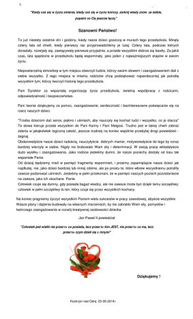 1. -' "Kiedy coś się w życiu zmienia, kiedy coś się w życiu kończy, zerknij wtedy znów za siebie, popatrz co Cię jeszcze łączy” Szanowni Państwo! To już niestety ostatnie dni i godziny, kiedy nasze dzieci goszczą w murach tego przedszkola. Minęły cztery lata od chwili, kiedy pierwszy raz przyprowadziliśmy je tutaj. Cztery lata, podczas których dorastały, rozwijały się, zawiązywały pierwsze przyjaźnie, a przede wszystkim dobrze się bawiły. Za jakiś czas, lata spędzone w przedszkolu będą wspominały, jako jeden z najważniejszych etapów w swoim życiu. Niepowtarzalną atmosferę w tym miejscu stworzyli ludzie, którzy swoim słowem i zaangażowaniem dali z siebie wszystko. Z tego miejsca w imieniu rodziców chcę podziękować najserdeczniej jak potrafię wszystkim tym, którzy tworzyli historię tego przedszkola. Pani Dyrektor za wspaniałą organizację życia przedszkola, świetną współpracę z rodzicami, odpowiedzialność i bezpieczeństwo. Pani Iwonie dziękujemy za pomoc, zaangażowanie, serdeczność i bezinteresowne poświęcanie się na rzecz naszych dzieci. "Trzeba dzieciom dać serce, piękno i uśmiech, aby nauczyły się kochać ludzi i wszystko, co je otacza" Te słowa kieruje przede wszystkim do Pani Kariny i Pani Małgosi. Trudno jest w takiej chwili zebrać zdania w jakąkolwiek logiczną całość, jeszcze trudniej na koniec wspólnie przebytej drogi powiedzieć żegnaj. Obdarowałyście nasze dzieci radością, nauczyłyście dobrych manier, motywowałyście do tego by coraz bardziej wierzyły w siebie. Nigdy nie brakowało Wam sity i determinacji. W swoją pracę wkładałyście dużo wysiłku i zaangażowania. Jako rodzice jesteśmy dumni, że nasze pociechy dostały od losu tak wspaniałe Panie. Od dzisiaj będziemy mieli w pamięci fragmenty wspomnień, i prosimy zapamiętajcie nasze dzieci jak najdłużej, nie, jako dzieci bardziej lub mniej zdolne, ale po prostu te, które wbrew wszystkiemu potrafiły zawsze podarować uśmiech. Jesteśmy w pełni przekonani, że w pamięci naszych pociech pozostaniecie na zawsze, jako ich ukochane Panie. Człowiek czuje się dumny, gdy posiada bagaż wiedzy, ale nie zawsze może być dzięki temu szczęśliwy; człowiek w pełni szczęśliwy to ten, który czuje się przez wszystkich kochany. Na koniec pragniemy życzyć wszystkim Paniom wielu sukcesów w pracy zawodowej, abyście wszystkie Wasze plany i dążenia budowały na własnych marzeniach, by nie zabrakło Wam siły, pomysłów i twórczego zaangażowania w rozwój kreatywnej osobowości dziecka. Jan Paweł II powiedział: "Człowiek jest wielki nie przez to co posiada, lecz przez to kim JEST, nie przez to co ma, lecz przez to czym dzieli się z innymi" Dziękujemy ! Kostrzyn nad Odrą 25-06-2014r. ..