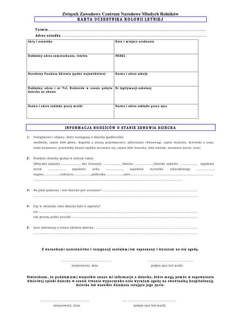 Związek Zawodowy Centrum Narodowe Młodych Rolników KAR TA UCZE STNIKA KOLONII LE TNIE J Te r m in ................................................................................................................................................. Ad r e s o ś ro d k a ..................................................................................................................................... Im ię i n a z wis k o Da t a i m ie js c e u r o d z e n ia Do k ła d n y a d r e s z a m ie s z k a n ia , t e le fo n PESEL Na r o d o wy F u n d u s z Zd r o wia (p o d a ć woje wód z t wo): Na z w a i a d r e s s z k o ły Do k ła d n y a d r e s i n r T e l. R o d z ic ó w w c z a s i e p o b y t u d z ie c k a n a o b o z ie Nr le gi t y m a c ji s z k o ln e j Na z w a i a d r e s z a k ła d u p r a c y m a t k i Na z w a i a d r e s z a k ła d u p r a c y o jc a INF ORMACJ A RODZICÓW O S TANIE ZDROWIA DZIE CKA 1. Dolegliwoś ci i ob ja wy, k t ór e wys t ę p u ją u d ziec k a (p od k r e ś lić): om d len ia , częs t e b óle głowy, d r ga wk i z u t r a t ą p r zyt om n oś ci, za b u r zen ia r ówn owa gi, częs t e wym iot y, k r wot ok i z n os a , a t a k i d u s zn oś ci, p r zewle k ły k a s zel s zyb k ie m eczen ie s ię, częs t e b óle b r zu ch a , b óle s t a wów, m oczen ie n ocn e, in n e; 2. Pr zeb yt e ch or ob y (p od a ć w k t ór ym r ok u ): żółt a czk a za k a źn a ..................., d u r b r zu s zn y .................., b łon ica ...................,ch or ob y za k a źn e ................., n er ek ................., za p a len ie u ch a ................., za p a len ie wyr os t k a r ob a czk owego za p a len ie ................., a n gin a ................,cu k r zyca ..................,p a d a czk a ..................,in n e............................................ .......................................... .......................................................................................................................................................... 3. Na ja k ie p ok a r m y i lek i d ziec k o jes t u czu lon e? .................................................................................................. .......................................................................................................................................................................... 4. Czy w os t a t n im r ok u d ziec k o b yło w s zp it a lu ? n ie .................................................................................................................................................................... t a k (p ros z ę p od a ć p ow ód ) .................................................................................................................................. 5. In n e in for m a cje o s t a n ie zd r owia d ziec k a : ................................................................................... ....................... .......................................................................................................................................................................... Z wa r u n k a m i u c ze s t n ic t wa i r e zy gn a c ji zo s t a ła m / e m z a p o z n a n y i wy r a ż a m n a n ie z go d ę . ……............................................. m iejs c owoś ć, d a t a …….......................................... p od p is ojc a lu b m a t k i S t wie r d z a m , ż e p o d a ła m (e m ) ws zy s t k ie zn a n e m i in fo r m a c je o d zie c k u , k t ó r e m o gą p o m ó c w z a p e wn ie n iu wła ś c iwe j o p ie k i d zie c k u w c z a s ie t r wa n ia wy p o c zy n k u o r a z wy r a ż a m z go d ę n a e we n t u a ln ą h o s p it a liz a c ję d z ie c k a lu b ws z e lk ie d zia ła n ia r a t u ją c e je go ży c ie . ……............................................. m iejs c owoś ć, d a t a …………............................................ p od p is ojca lu b m a t k i INF ORMACJ A P IELĘ GNIARKI S ZKOLNE J Wzr os t : .................................................................................................................................................................... Wa ga : ...................................................................................................................................................................... S t a n czys t oś ci s k ór y: .......................................... włos ów ........................................................................................ S zczep ien ia och r on n e (p od a ć, w k t ór ym r ok u ): os p a ...................., BCG ..................., b łon ica ..................., du r ..................., t ężec ...................., p olio .................. ...................................................... m iejs c owoś ć, d a t a ....................................................... p od p is p ielęgn ia r k i s zk oln ej OPINIA LEKARZA Po zb a d a n iu d zie ck a s t wier d za m (roz p oz n a n ie ): ........................................................................................................ ................................................................................................................................................…………………………. ................................................................................................................................................................................. ................................................................................................................................................................................. ................................................................................................................................................................................. 1. d ziec k o m oże b yć u cze s t n ik ie m ob ozu ws k a za n ia i p r zeciwws k a za n ia : ...............................
