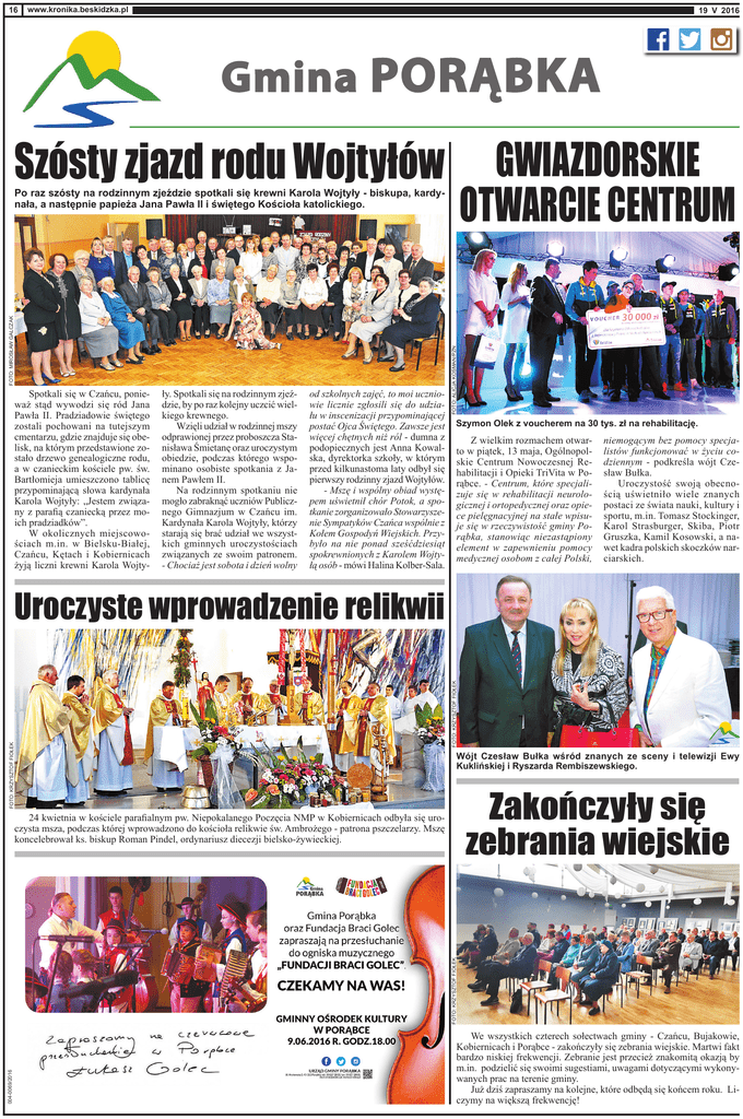 16 www.kronika.beskidzka.pl I 19 V 2016 Gmina PORĄBKA GWIAZDORSKIE OTWARCIE CENTRUM Szósty zjazd rodu Wojtyłów Spotkali się w Czańcu, ponieważ stąd wywodzi się ród Jana Pawła II. Pradziadowie świętego zostali pochowani na tutejszym cmentarzu, gdzie znajduje się obelisk, na którym przedstawione zostało drzewo genealogiczne rodu, a w czanieckim kościele pw. św. Bartłomieja umieszczono tablicę przypominającą słowa kardynała Karola Wojtyły: „Jestem związany z parafią czaniecką przez moich pradziadków”. W okolicznych miejscowościach m.in. w Bielsku-Białej, Czańcu, Kętach i Kobiernicach żyją liczni krewni Karola Wojty- ły. Spotkali się na rodzinnym zjeździe, by po raz kolejny uczcić wielkiego krewnego. Wzięli udział w rodzinnej mszy odprawionej przez proboszcza Stanisława Śmietanę oraz uroczystym obiedzie, podczas którego wspominano osobiste spotkania z Janem Pawłem II. Na rodzinnym spotkaniu nie mogło zabraknąć uczniów Publicznego Gimnazjum w Czańcu im. Kardynała Karola Wojtyły, którzy starają się brać udział we wszystkich gminnych uroczystościach związanych ze swoim patronem. - Chociaż jest sobota i dzień wolny od szkolnych zajęć, to moi uczniowie licznie zgłosili się do udziału w inscenizacji przypominającej postać Ojca Świętego. Zawsze jest więcej chętnych niż ról - dumna z podopiecznych jest Anna Kowalska, dyrektorka szkoły, w którym przed kilkunastoma laty odbył się pierwszy rodzinny zjazd Wojtyłów. - Mszę i wspólny obiad występem uświetnił chór Potok, a spotkanie zorganizowało Stowarzyszenie Sympatyków Czańca wspólnie z Kołem Gospodyń Wiejskich. Przybyło na nie ponad sześćdziesiąt spokrewnionych z Karolem Wojtyłą osób - mówi Halina Kolber-Sala. FOTO: ALICJA KOSMAN/PZN FOTO: MIROSŁAW GALCZAK Po raz szósty na rodzinnym zjeździe spotkali się krewni Karola Wojtyły - biskupa, kardynała, a następnie papieża Jana Pawła II i świętego Kościoła katolickiego. Szymon Olek z voucherem na 30 tys. zł na rehabilitację. Z wielkim rozmachem otwarto w piątek, 13 maja, Ogólnopolskie Centrum Nowoczesnej Rehabilitacji i Opieki TriVita w Porąbce. - Centrum, które specjalizuje się w rehabilitacji neurologicznej i ortopedycznej oraz opiece pielęgnacyjnej na stałe wpisuje się w rzeczywistość gminy Porąbka, stanowiąc niezastąpiony element w zapewnieniu pomocy medycznej osobom z całej Polski, niemogącym bez pomocy specjalistów funkcjonować w życiu codziennym - podkreśla wójt Czesław Bułka. Uroczystość swoją obecnością uświetniło wiele znanych postaci ze świata nauki, kultury i sportu, m.in. Tomasz Stockinger, Karol Strasburger, Skiba, Piotr Gruszka, Kamil Kosowski, a nawet kadra polskich skoczków narciarskich. FOTO: KRZYSZTOF FIOŁEK FOTO: KRZYSZTOF FIOŁEK Uroczyste wprowadzenie relikwii Wójt Czesław Bułka wśród znanych ze sceny i telewizji Ewy Kuklińskiej i Ryszarda Rembiszewskiego. Zakończyły się zebrania wiejskie 004-0069/2016 FOTO: KRZYSZTOF FIOŁEK 24 kwietnia w kościele parafialnym pw. Niepokalanego Poczęcia NMP w Kobiernicach odbyła się uroczysta msza, podczas której wprowadzono do kościoła relikwie św. Ambrożego - patrona pszczelarzy. Mszę koncelebrował ks. biskup Roman Pindel, ordynariusz diecezji bielsko-żywieckiej. We wszystkich czterech sołectwach gminy - Czańcu, Bujakowie, Kobiernicach i Porąbce - zakończyły się zebrania wiejskie. Martwi fakt bardzo niskiej frekwencji. Zebranie jest przecież znakomitą okazją by m.in. podzielić się swoimi sugestiami, uwagami dotyczącymi wykonywanych prac na terenie gminy. Już dziś zapraszamy na kolejne, które odbędą się końcem roku. Liczymy na większą frekwencję!