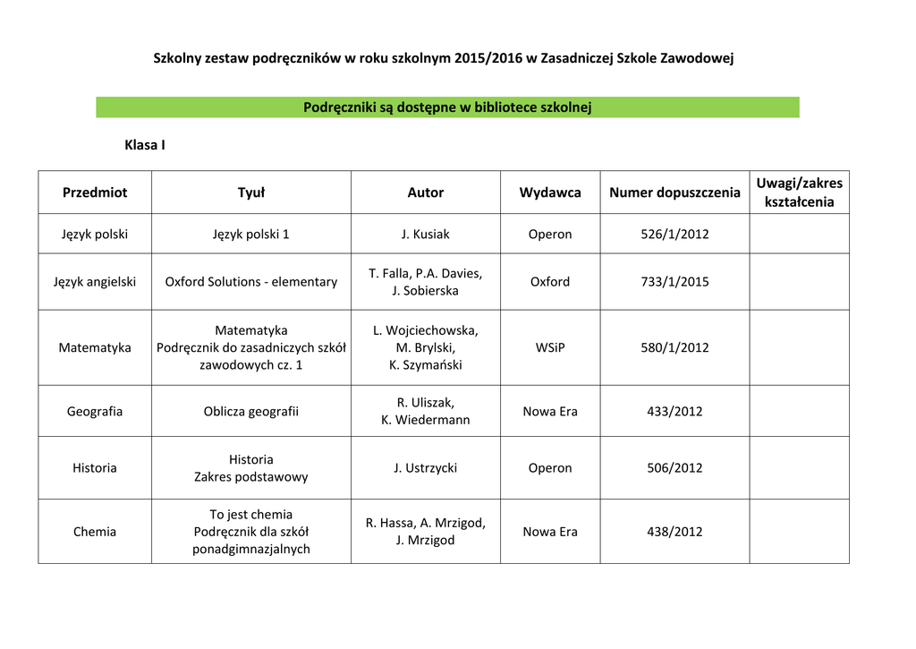 Szkolny zestaw podręczników w roku szkolnym 2015/2016 w Zasadniczej Szkole Zawodowej Podręczniki są dostępne w bibliotece szkolnej Klasa I Przedmiot Tyuł Autor Wydawca Numer dopuszczenia Język polski Język polski 1 J. Kusiak Operon 526/1/2012 Język angielski Oxford Solutions - elementary T. Falla, P.A. Davies, J. Sobierska Oxford 733/1/2015 Matematyka Matematyka Podręcznik do zasadniczych szkół zawodowych cz. 1 L. Wojciechowska, M. Brylski, K. Szymański WSiP 580/1/2012 Geografia Oblicza geografii R. Uliszak, K. Wiedermann Nowa Era 433/2012 Historia Historia Zakres podstawowy J. Ustrzycki Operon 506/2012 Chemia To jest chemia Podręcznik dla szkół ponadgimnazjalnych R. Hassa, A. Mrzigod, J. Mrzigod Nowa Era 438/2012 Uwagi/zakres kształcenia Religia Świadczę o Jezusie w Kościele pod red. ks. R. Strusa i ks. W. Galanta "GAUDIUM" wyd. Archidiecezji Lubelskiej Biologia Biologia na czasie Zakres podstawowy E. Bonar Nowa Era 450/2012 Fizyka Odkryć fizykę M. Braun, W. Śliwa Nowa Era 447/2012 Informatyka Informatyka dla szkół ponadgimnazjalnych. G. Koba Migra Sp. z o.o. 536/2012 M. Zienkiewicz WSiP Wyposażenie Sporządzanie ekspedycja potraw zakładów i napojów cz.3 gastronomicznych Zajęcia rewalidacyjne Edukacja dla bezpieczeństwa Ortograffiti (ortografia, ćwiczenia grafomotoryczne) J. Studnicka Ortograffiti (ćwiczenia ze zrozumieniem) R. Jędrzejewska-Wróbel Ćwiczę koncentrację A. Jagrzarz Wir Kraków Edukacja dla bezpieczeństwa. Podręcznik dla szkół ponadgimnazjalnych M. Goniewicz, A. W. Nowak-Kowal, Z. Smutek Operon AZ-41-01/10-LU-1/12 Operon 411/2012 Zasady bezpieczeństwa i higieny pracy w gastronomii Bezpieczeństwo i higiena pracy W. Bukała, K. Szczęch WSiP Podstawy technologii gastronomicznej Sporządzanie potraw i napojów. Towaroznawstwo i przechowywanie żywności A. Kmiołek WSiP Funkcjonowanie przedsiębiorstwa gastronomicznego Gospodarka i rachunkowość w gastronomii Z. Mielczarczyk, B. Urbańska WSiP 16/2012 Klasa II Przedmiot Tyuł Autor Wydawca Numer dopuszczenia Język polski Język polski 2 B. Chuderska Operon 526/2/2013 Język angielski New Matura Solutions elementary New Matura Solutions - pre-intermediate T. Falla, P.A. Davies, Oxford 361/1/2012 361/2/2011 Matematyka Matematyka Podręcznik do zasadniczych szkół zawodowych cz. 2 L. Wojciechowska, M. Brylski, K. Szymański WSiP 580/2/2013 Historia Historia Zakres podstawowy J. Ustrzycki Operon 506/2012 pod red. ks. R. Strusa i ks. W. Galanta "GAUDIUM" wyd. Archidiecezji Lubelskiej AZ-41-01/10-LU-4/13 M. Zienkiewicz WSiP J. Studnicka Operon Religia Świadczę o Jezusie w świecie Wyposażenie Sporządzanie ekspedycja potraw zakładów i napojów cz.3 gastronomicznych Zajęcia rewalidacyjne Ortograffiti (ortografia, ćwiczenia grafomotoryczne) Uwagi/zakres kształcenia Ortograffiti (ćwiczenia ze zrozumieniem) R. Jędrzejewska-Wróbel Ćwiczę koncentrację A. Jagrzarz Wir Kraków Zasady bezpieczeństwa i higieny pracy w gastronomii Bezpieczeństwo i higiena pracy W. Bukała, K. Szczęch WSiP Funkcjonowanie przedsiębiorstwa gastronomicznego Gospodarka i rachunkowość w gastronomii Z. Mielczarczyk, B. Urbańska WSiP Język obcy w gastronomii (j. angielski) Cooking V. Evans, J. Dooley, R. Hayley Express Publishing Technologia gastronomiczna z towaroznawstwem Sporządzanie i ekspedycja towarów i napojów cz. 1 i 2 A. Kmiołek WSiP Podstawy przedsiębiorczości Podstawy przedsiębiorczości. Seria odkrywamy na nowo. J. Korba, Z. Smutek Operon Podejmowanie działalności gospodarczej w gastronomii Prowadzenie działaności gospodarczej T. Gorzelany 16/2012 483/2012 Klasa III Przedmiot Tyuł Autor Wydawca Numer dopuszczenia Język polski Język polski 2 B. Chuderska Operon 526/2/2013 Język angielski New Matura Solutions - preintermediate T. Falla, P.A. Davies, Oxford 361/2/2011 Matematyka Matematyka Podręcznik do zasadniczych szkół zawodowych cz. 2 L. Wojciechowska, M. Brylski, K. Szymański WSiP 580/2/2013 Wiedza o społeczeństwie Wiedza o społeczeństwie Zakres podstawowy Z. Smutek, J. Maleska Operon 407/2011 Świadczę o Jezusie w rodzinie pod red. ks. R. Strusa i ks. W. Galanta "GAUDIUM" wyd. Archidiecezji Lubelskiej Ortograffiti (ortografia, ćwiczenia grafomotoryczne) J. Studnicka Ortograffiti (ćwiczenia ze zrozumieniem) R. Jędrzejewska-Wróbel Religia Zajęcia rewalidacyjne Operon Uwagi/zakres kształcenia Ćwiczę koncentrację A. Jagrzarz Wir Kraków Język obcy w gastronomii (j. angielski) Cooking V. Evans, J. Dooley, R. Hayley Express Publishing Technologia gastronomiczna z towaroznawstwem Sporządzanie i ekspedycja towarów i napojów cz. 1 i 2 A. Kmiołek WSiP Podstawy przedsiębiorczości Podstawy przedsiębiorczości. Seria odkrywamy na nowo. J. Korba, Z. Smutek Operon 483/2012 Edukacja dla bezpieczeństwa Edukacja dla bezpieczeństwa cz. 1i2 M. Goniewicz, A. W. Nowak-Kowal, Z. Smutek WSiP 177/1/2009 177/2/2009