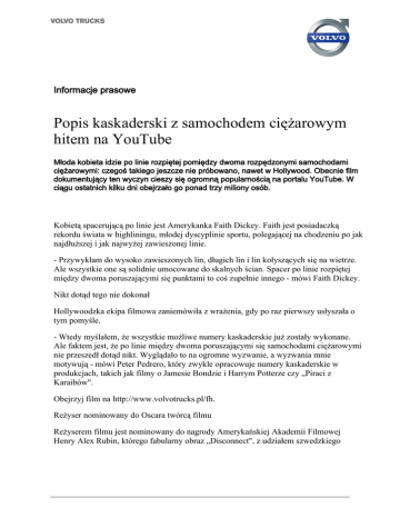 Informacje prasowe Popis kaskaderski z samochodem ciężarowym hitem na YouTube Młoda kobieta idzie po linie rozpiętej pomiędzy dwoma rozpędzonymi samochodami ciężarowymi: czegoś takiego jeszcze nie próbowano, nawet w Hollywood. Obecnie film dokumentujący ten wyczyn cieszy się ogromną popularnością na portalu YouTube. W ciągu ostatnich kilku dni obejrzało go ponad trzy miliony osób. Kobietą spacerującą po linie jest Amerykanka Faith Dickey. Faith jest posiadaczką rekordu świata w highliningu, młodej dyscyplinie sportu, polegającej na chodzeniu po jak najdłuższej i jak najwyżej zawieszonej linie. - Przywykłam do wysoko zawieszonych lin, długich lin i lin kołyszących się na wietrze. Ale wszystkie one są solidnie umocowane do skalnych ścian. Spacer po linie rozpiętej między dwoma poruszającymi się punktami to coś zupełnie innego - mówi Faith Dickey. Nikt dotąd tego nie dokonał Hollywoodzka ekipa filmowa zaniemówiła z wrażenia, gdy po raz pierwszy usłyszała o tym pomyśle. - Wtedy myślałem, że wszystkie możliwe numery kaskaderskie już zostały wykonane. Ale faktem jest, że po linie między dwoma poruszającymi się samochodami ciężarowymi nie przeszedł dotąd nikt. Wyglądało to na ogromne wyzwanie, a wyzwania mnie motywują - mówi Peter Pedrero, który zwykle opracowuje numery kaskaderskie w produkcjach, takich jak filmy o Jamesie Bondzie i Harrym Potterze czy „Piraci z Karaibów". Obejrzyj film na http://www.volvotrucks.pl/fh. Reżyser nominowany do Oscara twórcą filmu Reżyserem filmu jest nominowany do nagrody Amerykańskiej Akademii Filmowej Henry Alex Rubin, którego fabularny obraz „Disconnect", z udziałem szwedzkiego aktora Alexandera Skarsgårda, znajduje się obecnie na ekranach kin. - Najbardziej lubię takie filmy, o których inni mówią, że są niemożliwe do zrealizowania. Gdy słyszę coś takiego, mam podwójną motywację do działania. - Tak samo jest z Faith Dickey. Powiedz jej „nie", a ona tym bardziej tego pragnie. I chociaż czuje respekt, swoją odwagą zdumiała mnie i całą ekipę. Popis kaskaderski miał być testem precyzji prowadzenia samochodów ciężarowych Volvo. Ostatecznie jednak w równym stopniu stał się świadectwem niesamowitej odwagi i instynktu - mówi Henry Alex Rubin. Nie dla ryzykantów Film nakręcono na nie oddanym jeszcze do ruchu odcinku autostrady w Chorwacji, a zatem z przeciwka nie nadjeżdżały żadne pojazdy. Popis wygląda niezwykle dramatycznie, ale zarówno dla Volvo Trucks, jak i szefa ekipy kaskaderów Petera Pedrero, najważniejsze było bezpieczeństwo. - Kaskaderstwo nie jest dla ryzykantów. Zawsze najważniejsze jest bezpieczeństwo. Za każdym razem trzeba być przygotowanym na najgorszy możliwy scenariusz i mieć odpowiedni plan. Skrupulatne przygotowania i planowanie to podstawa - mówi Peter Pedrero. Umożliwiły to znakomite właściwości jezdne Inspiratorem filmu jest Volvo Trucks. Celem jest pokazanie właściwości jezdnych i znakomitej precyzji kontroli najnowszego modelu samochodu ciężarowego firmy: nowego Volvo FH. Wyczyn udał się tylko dlatego, że nowe Volvo FH odznacza się doskonałą statecznością jazdy i precyzją prowadzenia. Dzięki temu obydwa samochody ciężarowe były w stanie w czasie całego popisu utrzymać stałą wzajemną odległość. Obejrzyj rozmowę z jednym z kierowców na: http://www.youtube.com/watch?v=l7SUJyWaqmM Światowa premiera i oficjalna prezentacja nowej serii Volvo FH odbędzie się 5 września 2012 r., o godzinie 21:00 czasu środkowoeuropejskiego (CET). Wydarzenie to będzie transmitowane na żywo w internecie, na stronie http://www.volvotrucks.pl/fh. 24 sierpnia 2012 r. W celu uzyskania dodatkowych informacji, prosimy o kontakt z: Lennart Pilskog, Media Relations. Tel.: +46 70 3183422 e-mail: [email protected] Per Nilsson, Media Relations. Tel.: +46 31 323 3349, e-mail: [email protected] Renata Stefańska, PR Region CEE, tel. +48 22 383 45 59, e-mail : [email protected] Aby obejrzeć film wideo, odwiedź stronę http: //www.thenewsmarket.com/volvogroup. Możesz obejrzeć lub zamówić materiały wideo w formacie MPEG2 lub na kasecie Beta SP. Rejestracja i materiały wideo są bezpłatne dla przedstawicieli mediów. Zdjęcia są dostępne w banku zdjęć Volvo Trucks pod adresem: http://imagegallery.vtc.volvo.se Koncern Volvo Trucks oferuje kompletne rozwiązania transportowe dla profesjonalistów. Oferta obejmuje kompletną gamę samochodów ciężarowych o dużej ładowności, a także profesjonalną sieć 3000 punktów serwisowych w ponad 140 krajach. Koncern Volvo Trucks jest częścią Grupy Volvo, jednego z czołowych światowych producentów samochodów ciężarowych, autobusów, maszyn budowlanych, morskich i stacjonarnych układów napędowych, oraz podzespołów i usług dla branży lotniczej. Grupa Volvo dostarcza również kompletne rozwiązania finansowe i serwisowe.