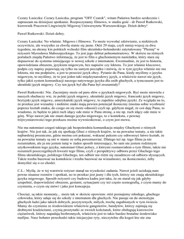 Cezary Łasiczka: Cezary Łasiczka, program "OFF Czarek", witam Państwa bardzo serdecznie i zapraszam na dzisiejsze spotkanie. Rozpoczynamy filmowo, w studiu gość - dr Paweł Rutkowski, kierownik Pracowni Lingwistyki Migowej Uniwersytetu Warszawskiego. Dzień dobry! Paweł Rutkowski: Dzień dobry. Cezary Łasiczka: No właśnie. Migowo i filmowo. To może wywołać zdziwienie, u niektórych oczywiście, ale wszystko za chwilę stanie się jasne. Otóż 29 maja, czyli mniej-więcej za dwa tygodnie, na ekrany kin polskich wchodzi film ukraińsko-holenderski zatytułowany "Plemię" w reżyserii Myrosława Słaboszpyckiego. To jest jego debiut pełnometrażowy. W skrócie na różnych portalach znajdą Państwo informację, że jest to film o głuchoniemym nastolatku, który stara się dopasować do systemu istniejącego w nowej szkole z internatem. Ewentualnie, że jest to historia, opowiedziana obrazem, językiem migowym, bez napisów czy lektora. To jest właśnie kluczowe, podpis czy napisy pojawiają się tylko na samym początku i mówią, że w tym języku właśnie nie ma lektora, nie ma podpisów, a jest to przecież język obcy. Pytanie do Pana, kiedy myślimy o języku migowym, to myślimy, że to jest jeden taki międzynarodowy język, a właściwie nawet nie język, tylko jakiś system komunikacji naszego natywnego języka dla osób głuchych, a tymczasem jest to ukraiński język migowy. Czy ten język był dla Pana był zrozumiały? Paweł Rutkowski: Nie. Zacznijmy może od paru słów o językach migowych. Być może niewielu z naszych słuchaczy wie, że polski język migowy, ukraiński język migowy, francuski język migowy, brytyjski język migowy, amerykański język migowy, to zupełnie odrębne języki. Ze względu na to, że przekaz jest wizualny i niektóre znaki mają pewien potencjał ikoniczny (można sobie wyobrazić poprzez kształt znaku, do czego on się może odnosić) czyli np. gdybym migał, że coś daję Panu, to wiadomo, że będzie to jakiś ruch idący ode mnie w Pana stronę, a nie np. ruch idący ode mnie w górę. Więc nawet jak nie znam danego języka migowego, to z kontekstu, z pewnej trójwymiarowości tego przekazu można wywnioskować, o czym jest mowa. Nie ma natomiast czegoś takiego jak bezpośrednia komunikacja między Głuchymi z różnych krajów. Nie jest tak, że jak się spotkają Głusi z różnych krajów, to na poważne tematy, a nie takie najbardziej prozaiczne, gdzie można coś pokazać, wskazać palcem czy odtworzyć łatwo kształt, że na poważne tematy są oni w stanie ze sobą porozmawiać. Dlatego też np. tego filmu ja nie rozumiałem, ale ja nie jestem tutaj w żaden sposób interesujący, bo sam nie jestem rodzimym użytkownikiem tego języka, natomiast Głusi polscy, z którymi rozmawiałem o tym filmie, także nie rozumieli poszczególnych kwestii tego filmu, czyli z perspektywy odbioru przez Głuchego tego filmu ukraińskiego, polskiego Głuchego, ten odbiór nie różni się zasadniczo od odbioru słyszących. Także trzeba bazować na kontekście i trzeba bazować na wizualności, na ikoniczności, żeby domyśleć się o co chodzi. C.Ł.: Myślę, że w tej warstwie reżyser stanął na wysokości zadania. Nawet jeżeli uciekają nam pewne niuanse rozmów i spotkań, no to przekaz jest jasny i dla tych, którzy nie znają ukraińskiego języka migowego. Sposób reżyserii czy budowa kadru jest taka, że on starał się jak gdyby uzupełnić, dopowiedzieć obrazem, gestami, sytuacjami czy też często scenografią, z czym mamy do czynienia, o czym się mówi i jaka jest koncepcja. Chociaż, są takie momenty... może tak w skrócie opowiem: otóż poznajemy młodego, głuchego człowieka, który udaje się do szkoły z internatem dla głuchych. Nie pasuje on do stereotypu głuchych ludzi jako takich dobrych, pozytywnych, miłych, trochę zagubionych w tym świecie. Mamy do czynienia ze środowiskiem właściwie gangsterów, bandytów, którzy zajmują się drobnymi kradzieżami, czynią prostytutki ze swoich koleżanek, które obsługują kierowców ciężarówek, którzy napadają bezbronnych, właściwie jest to takie bardzo brutalne środowisko mafijne. Nasz bohater przechodzi takie inicjacyjne ryty, nieczytelne dla kogoś kto nie zna ukraińskiego języka migowego. Na początku on przychodzi i musi się rozebrać, żeby pokazać, że właśnie niczego nie ma czy że niczego nie ukrywa, czy że nie ma tatuaży. Ta kwestia jest niejasna, ale to być może jest ciekawe z punktu widzenia materii filmowej. W każdym razie, jedna z dziewczyn, która zajmuje się prostytucją, czy jest zmuszana do prostytucji, zakochuje się z wzajemnością w naszym bohaterze. Jest to takie trochę niepożądane zachowanie w tym świecie, gdzie zupełnie inne rzeczy są ważne. Więcej Państwu nie będę zdradzał, natomiast właśnie ciekawe chyba na początek jest to, że Głusi przedstawieni są trochę w zupełnie, w znacznie innym świetle niż stanowi stereotyp. P.R.: Tak, to jest cenne, że chyba po raz pierwszy w kinie, które ma szansę dotrzeć do masowego słyszącego odbiorcy, Głuchy nie jest przedstawiony jako osoba sympatyczna, milutka, tylko najczęściej jest przedstawiany jako osoba kompletnie nieporadna, jako osoba, którą trzeba się zaopiekować, którą trzeba przeprowadzić, być może, przez ulicę, bo a nuż będzie jechać samochód i Głuchy tego nie usłyszy. Takie stereotypy, kompletnie błędne, rzutują potem na to, jaki jest stosunek nas słyszących do Głuchych. Co więcej, czasami rzutują na to, jakie są np. akty prawne, które regulują dostęp, chociażby do prawa jazdy przez Głuchych. Bardzo wielu z nas wydaje się, że Głuchy z jakiegoś powodu nie może prowadzić samochodu, w szczególności dlatego, że czegoś nie usłyszy i będzie rozkojarzony - ten film pokazuje, że Głuchy może nie tylko prowadzić samochód, ale tak jak Pan powiedział, być gangsterem. Co prawda, nawet w tym