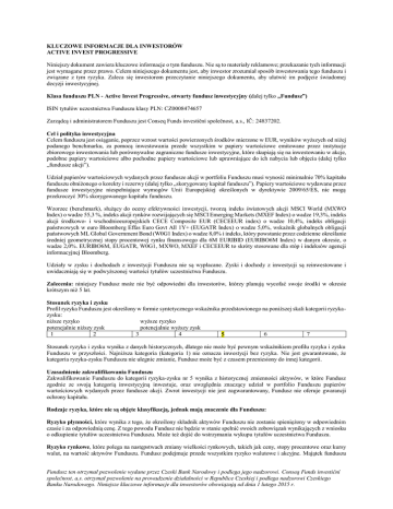 KLUCZOWE INFORMACJE DLA INWESTORÓW ACTIVE INVEST PROGRESSIVE Niniejszy dokument zawiera kluczowe informacje o tym funduszu. Nie są to materiały reklamowe; przekazanie tych informacji jest wymagane przez prawo. Celem niniejszego dokumentu jest, aby inwestor zrozumiał sposób inwestowania tego funduszu i związane z tym ryzyka. Zaleca się inwestorom przeczytanie niniejszego dokumentu, aby ułatwić im podjęcie świadomej decyzji inwestycyjnej. Klasa funduszu PLN - Active Invest Progressive, otwarty fundusz inwestycyjny (dalej tylko „Fundusz”) ISIN tytułów uczestnictwa Funduszu klasy PLN: CZ0008474657 Zarządcą i administratorem Funduszu jest Conseq Funds investiční společnost, a.s., IČ: 24837202. Cel i polityka inwestycyjna Celem funduszu jest osiąganie, poprzez wzrost wartości powierzonych środków mierzone w EUR, wyników wyższych od niżej podanego benchmarku, za pomocą inwestowania przede wszystkim w papiery wartościowe emitowane przez instytucje zbiorowego inwestowania lub porównywalne zagraniczne fundusze inwestycyjne, które skupiają się na inwestowaniu w akcje, podobne papiery wartościowe albo pochodne papiery wartościowe lub uprawniające do ich nabycia lub objęcia (dalej tylko „fundusze akcji”). Udział papierów wartościowych wydanych przez fundusze akcji w portfoliu Funduszu musi wynosić minimalnie 70% kapitału funduszu obniżonego o korekty i rezerwy (dalej tylko „skorygowany kapitał funduszu”). Papiery wartościowe wydawane przez fundusze inwestycyjne niespełniające wymogów Unii Europejskiej określonych w dyrektywie 2009/65/ES, nie mogą przekroczyć 30% skorygowanego kapitału funduszu. Wzorzec (benchmark), służący do oceny efektywności inwestycji, tworzą indeks światowych akcji MSCI World (MXWO Index) o wadze 55,3 %, indeks akcji rynków rozwijających się MSCI Emerging Markets (MXEF Index) o wadze 19,3%, indeks akcji środkowo- i wschodnioeuropejskich CECE Composite EUR (CECEEUR index) o wadze 10,4%, indeks obligacji państwowych w euro Bloomberg Effas Euro Govt All 1Y+ (EUGATR Index) o wadze 5,0%, wskaźnik globalnych obligacji państwowych ML Global Government Bond (W0G1 Index) o wadze 8,0% i indeks, który powstanie przez codzienne określanie średniej geometrycznej stopy procentowej rynku finansowego dla 6M EURIBID (EURIBO6M Index) w danym okresie, o wadze 2,0%. EURIBO6M, EUGATR, W0G1, MXWO, MXEF i CECEEUR to skróty stosowane dla stóp i indeksów agencji informacyjnej Bloomberg. Udziały w zysku i dochodach z inwestycji Funduszu nie są wypłacane. Zyski i dochody z inwestycji są reinwestowane i uwidaczniają się w podwyższonej wartości tytułów uczestnictwa Funduszu. Zalecenia: niniejszy Fundusz może nie być odpowiedni dla inwestorów, którzy planują wycofać swoje środki w okresie krótszym niż 5 lat. Stosunek ryzyka i zysku Profil ryzyka Funduszu jest określony w formie syntetycznego wskaźnika przedstawionego na poniższej skali kategorii ryzykazysku: niższe ryzyko wyższe ryzyko potencjalnie niższy zysk potencjalnie wyższy zysk 1 2 3 4 6 7 5 Stosunek ryzyka i zysku wynika z danych historycznych, dlatego nie może być pewnym wskaźnikiem profilu ryzyka i zysku Funduszu w przyszłości. Najniższa kategoria (kategoria 1) nie oznacza inwestycji bez ryzyka. Nie jest gwarantowane, że kategoria ryzyka-zysku Funduszu nie ulegnie zmianie, Fundusz może być z czasem przeniesiony do innej kategorii. Uzasadnienie zakwalifikowania Funduszu Zakwalifikowanie Funduszu do kategorii ryzyka-zysku nr 5 wynika z historycznej zmienności aktywów, w które Fundusz zgodnie ze swoją kategorią inwestycyjną inwestuje, oraz uwzględnia znaczący udział w portfolio Funduszu papierów wartościowych wydanych przez fundusze akcji. Zwrot inwestycji nie jest zagwarantowany, Fundusz nie oferuje gwarancji ochrony kapitału. Rodzaje ryzyka, które nie są objęte klasyfikacją, jednak mają znaczenie dla Funduszu: Ryzyko płynności, które wynika z tego, że określony składnik aktywów Funduszu nie zostanie spieniężony w odpowiednim czasie i za odpowiednią cenę. Z tego powodu Fundusz nie będzie w stanie spełnić swoich zobowiązań wynikających z wniosku o odkupienie tytułów uczestnictwa Funduszu. Może też dojść do wstrzymania wykupu tytułów uczestnictwa Funduszu. Ryzyko rynkowe, które polega na następstwach zmiany wielkości rynkowych, takich jak ceny, stopy procentowe oraz kursy walut, na wartość aktywów Funduszu. Fundusz podejmuje przede wszystkim ryzyko walutowe i akcyjne. Majątek funduszu Fundusz ten otrzymał pozwolenie wydane przez Czeski Bank Narodowy i podlega jego nadzorowi. Conseq Funds investiční společnost, a.s. otrzymał pozwolenie na prowadzenie działalności w Republice Czeskiej i podlega nadzorowi Czeskiego Banku Narodowego. Niniejsze kluczowe informacje dla inwestorów obowiązują od dnia 1 lutego 2015 r. przypadający na tytuły uczestnictwa klasy PLN może być zabezpieczony przed zmianami kursu złotych polskich (PLN) wobec EUR jako podstawowej waluty funduszu. Opłaty Opłaty jednorazowe pobierane przed lub po zakończeniu inwestycji Opłata za nabycie 5% wartości wydanych tytułów uczestnictwa Opłata za umorzenie nie ma Maksymalna kwota, która może być naliczona przed zrealizowaniem inwestycji lub przed wypłaceniem dochodów z inwestycji. Opłaty pobierane z Funduszu w trakcie roku Łączne opłaty (opłata za zarządzanie) 2,83% ze średniej wartości netto aktywów Funduszu (szacunek) Opłaty pobierane z Funduszu w określonych warunkach szczególnych Opłata za wyniki 12% wyniku powyżej benchmarku Opłaty za nabycie i umorzenie stanowią maksymalne naliczane opłaty, w określonych przypadkach wysokość opłat może być niższa Aktualną wysokość opłat można sprawdzić u swojego doradcy finansowego lub dystrybutora. Podana wysokość rocznych kosztów odpowiada kosztom w poprzednim roku kalendarzowym. Fundusz powstał w październiku 2014 roku, w 2014 ro