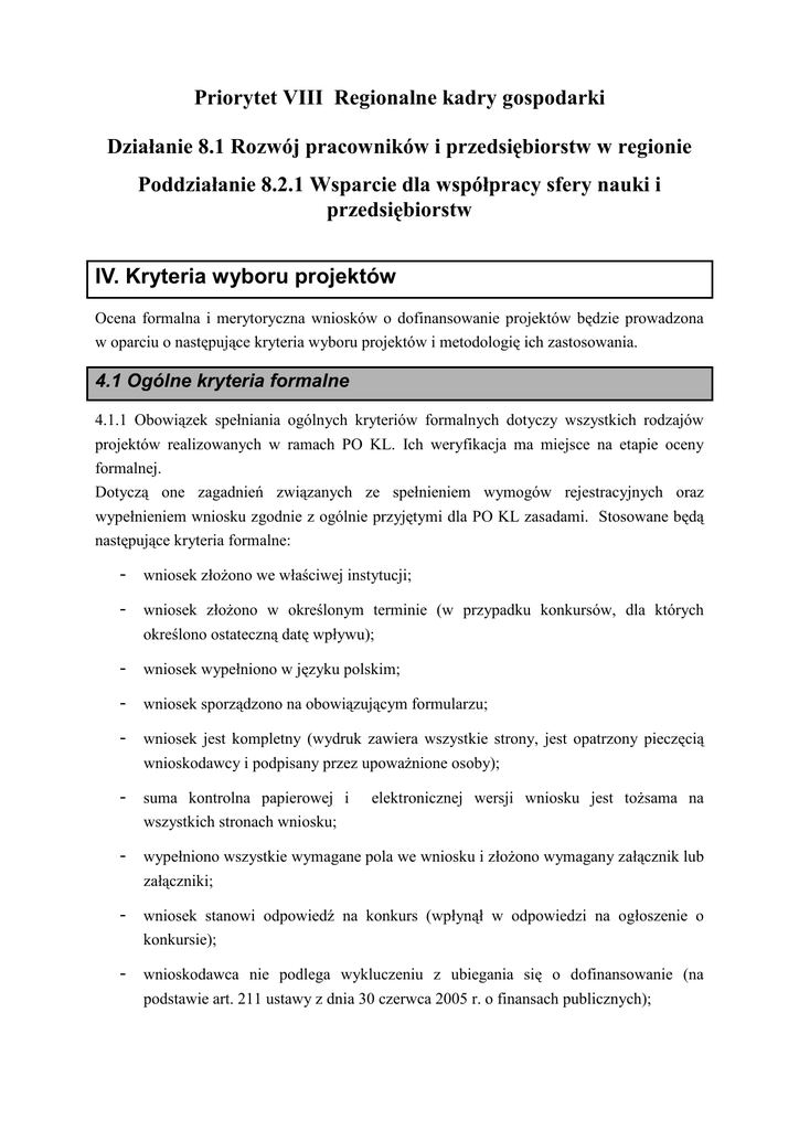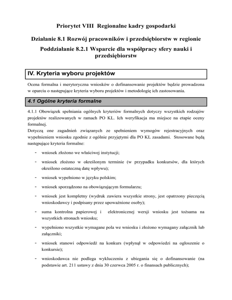 Priorytet VIII Regionalne kadry gospodarki Działanie 8.1 Rozwój pracowników i przedsiębiorstw w regionie Poddziałanie 8.2.1 Wsparcie dla współpracy sfery nauki i przedsiębiorstw IV. Kryteria wyboru projektów Ocena formalna i merytoryczna wniosków o dofinansowanie projektów będzie prowadzona w oparciu o następujące kryteria wyboru projektów i metodologię ich zastosowania. 4.1 Ogólne kryteria formalne 4.1.1 Obowiązek spełniania ogólnych kryteriów formalnych dotyczy wszystkich rodzajów projektów realizowanych w ramach PO KL. Ich weryfikacja ma miejsce na etapie oceny formalnej. Dotyczą one zagadnień związanych ze spełnieniem wymogów rejestracyjnych oraz wypełnieniem wniosku zgodnie z ogólnie przyjętymi dla PO KL zasadami. Stosowane będą następujące kryteria formalne: - wniosek złoŜono we właściwej instytucji; - wniosek złoŜono w określonym terminie (w przypadku konkursów, dla których określono ostateczną datę wpływu); - wniosek wypełniono w języku polskim; - wniosek sporządzono na obowiązującym formularzu; - wniosek jest kompletny (wydruk zawiera wszystkie strony, jest opatrzony pieczęcią wnioskodawcy i podpisany przez upowaŜnione osoby); - suma kontrolna papierowej i wszystkich stronach wniosku; - wypełniono wszystkie wymagane pola we wniosku i złoŜono wymagany załącznik lub załączniki; - wniosek stanowi odpowiedź na konkurs (wpłynął w odpowiedzi na ogłoszenie o konkursie); - wnioskodawca nie podlega wykluczeniu z ubiegania się o dofinansowanie (na elektronicznej wersji wniosku jest toŜsama na podstawie art. 211 ustawy z dnia 30 czerwca 2005 r. o finansach publicznych); - konkursowy nabór wniosków odnoszących się do danego typu projektu przewidziano w odpowiednim Planie Działania. 4.1.2 Ocena wniosku na podstawie kryteriów formalnych ma postać „0-1”, tzn. „spełnia – nie spełnia”. Wnioski niespełniające jednego lub więcej kryteriów są odrzucane na etapie oceny formalnej, bez moŜliwości ich uzupełnienia. 4.2 Szczegółowe kryteria dostępu 4.2.1 Szczegółowe kryteria dostępu są obowiązkowe dla wszystkich wnioskodawców i podlegają weryfikacji podczas oceny formalnej wniosku. Projekty, które nie spełniają kryteriów dostępu, są odrzucane. Kryteria dostępu mogą dotyczyć, np.: wnioskodawcy, grup docelowych, obszaru realizacji projektu, poziomu wymaganego wkładu własnego itp. W ramach konkursu stosowane będą następujące szczegółowe kryteria dostępu: typ projektu: − staŜe i szkolenia praktyczne dla: • pracowników przedsiębiorstw w jednostkach naukowych; • pracowników naukowych (uczelni oraz innych jednostek naukowych) w przedsiębiorstwach. Kryterium realizacji projektu: projekt realizowany w porozumieniu przedsiębiorstwo – sektor naukowo – badawczy; Kryterium grupy docelowej: przynajmniej jedna ze stron (przedsiębiorstwo lub jednostka naukowa / uczelnia) zatrudnia pracowników na terenie województwa zachodniopomorskiego Kryterium okresu realizacji projektu: w terminie nie przekraczającym dnia 31 grudnia 2010 r. typ projektu: − promocja idei przedsiębiorczości akademickiej, w celu komercjalizacji wiedzy i umiejętności zespołu działającego na uczelni lub w przemyśle (firmy typu spin off lub spin out); − szkolenia i doradztwo dla pracowników uczelni i jednostek naukowych, doktorantów, studentów i absolwentów uczelni zamierzających rozpocząć własną działalność gospodarczą typu spin off lub spin out. Kryterium grupy docelowej: wsparcie kierowane do osób mających miejsce zamieszkania na terenie województwa zachodniopomorskiego w rozumieniu przepisów Kodeksu Cywilnego oraz przedsiębiorstw i jednostek sektora B+R zatrudniających pracowników na jego terenie; Kryterium okresu realizacji projektu: w terminie nie przekraczającym dnia 31 grudnia 2010 r. 4.2.2 Ocena wniosku na podstawie szczegółowych kryteriów dostępu ma postać „0-1”, tzn. „spełnia – nie spełnia”. Wnioski niespełniające jednego lub więcej kryteriów są odrzucane na etapie oceny formalnej, bez moŜliwości ich uzupełnienia. 4.3 Ogólne kryteria horyzontalne 4.3.1 Ocena wniosków złoŜonych w ramach konkursu prowadzona będzie w oparciu o następujące kryteria horyzontalne: − zgodność z właściwymi politykami i zasadami wspólnotowymi (w tym: polityką równych szans i koncepcją zrównowaŜonego rozwoju) oraz prawodawstwem wspólnotowym − zgodność z prawodawstwem krajowym; − zgodność ze Szczegółowym Opisem Priorytetów PO KL. 4.3.2 Ocena wniosku na podstawie ogólnych kryteriów horyzontalnych ma postać „0-1”, tzn. „spełnia – nie spełnia”. Wnioski niespełniające jednego lub więcej kryteriów są odrzucane na pierwszym etapie oceny merytorycznej. 4.4 Ogólne kryteria merytoryczne 4.4.1 Ogólne kryteria merytoryczne dotyczą treści wniosku, wiarygodności i zdolności projektodawcy do podjęcia realizacji projektu oraz zasad finansowania projektów w ramach PO KL. Ogólne kryteria merytoryczne mają charakter uniwersalny, tj. odnoszą się do wszystkich projektów realizowanych w ramach Programu. Stosowane będą następujące ogólne kryteria merytoryczne: − jakości projektu: uzasadnienie potrzeby realizacji projektu w kontekście celów szczegółowych określonych dla danego Priorytetu PO KL; sposób wyboru i zapewnienia udziału w projekcie określonych grup docelowych; − wartość dodana projektu; adekwatność doboru instrumentów słuŜących realizacji projektu do sytuacji i potrzeb grupy docelowej; rezultaty projektu; racjonalność harmonogramu działań; beneficjenta: wiarygodność - doświadczenie w zarządzaniu projektami, potencjał instytucjonalny (w tym potencjał kadrowy i finansowy); − sposób zarządzania projektem (czytelność zasad realizacji); finansowania projektu: niezbędność wydatku do realizacji projektu i osiągania jego celów; efektywność wydatków projektu (relacja nakład/rezulta