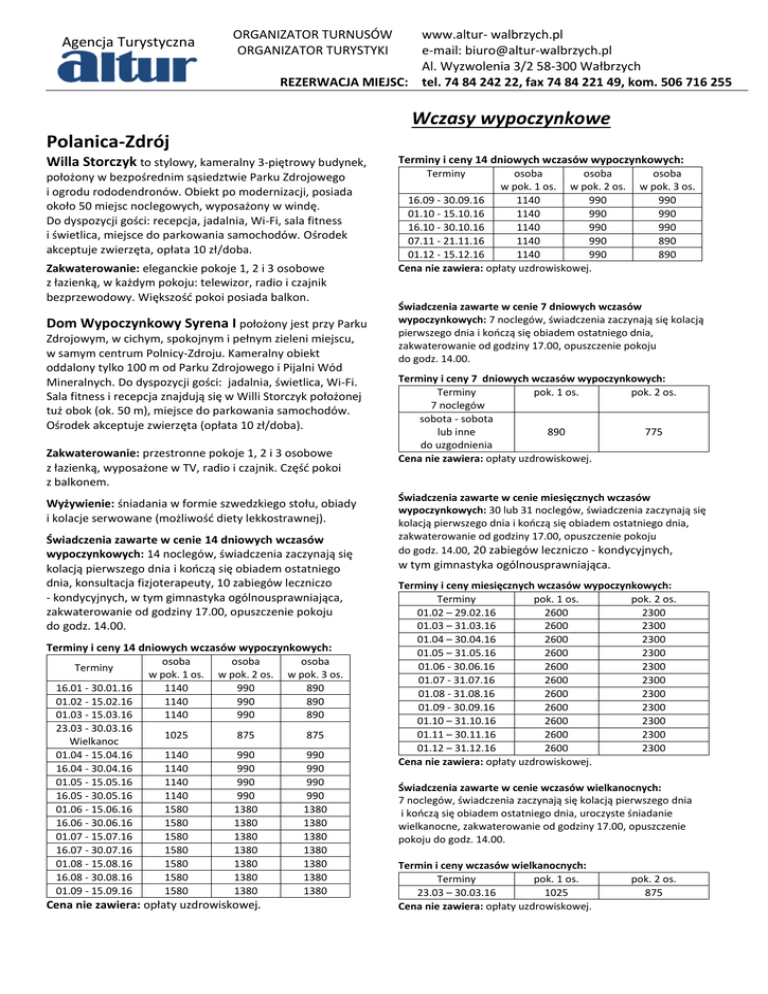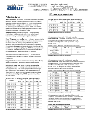 Agencja Turystyczna ORGANIZATOR TURNUSÓW ORGANIZATOR TURYSTYKI www.altur- walbrzych.pl e-mail: [email protected] Al. Wyzwolenia 3/2 58-300 Wałbrzych REZERWACJA MIEJSC: tel. 74 84 242 22, fax 74 84 221 49, kom. 506 716 255 Wczasy wypoczynkowe Polanica-Zdrój Willa Storczyk to stylowy, kameralny 3-piętrowy budynek, położony w bezpośrednim sąsiedztwie Parku Zdrojowego i ogrodu rododendronów. Obiekt po modernizacji, posiada około 50 miejsc noclegowych, wyposażony w windę. Do dyspozycji gości: recepcja, jadalnia, Wi-Fi, sala fitness i świetlica, miejsce do parkowania samochodów. Ośrodek akceptuje zwierzęta, opłata 10 zł/doba. Zakwaterowanie: eleganckie pokoje 1, 2 i 3 osobowe z łazienką, w każdym pokoju: telewizor, radio i czajnik bezprzewodowy. Większość pokoi posiada balkon. Dom Wypoczynkowy Syrena I położony jest przy Parku Zdrojowym, w cichym, spokojnym i pełnym zieleni miejscu, w samym centrum Polnicy-Zdroju. Kameralny obiekt oddalony tylko 100 m od Parku Zdrojowego i Pijalni Wód Mineralnych. Do dyspozycji gości: jadalnia, świetlica, Wi-Fi. Sala fitness i recepcja znajdują się w Willi Storczyk położonej tuż obok (ok. 50 m), miejsce do parkowania samochodów. Ośrodek akceptuje zwierzęta (opłata 10 zł/doba). Zakwaterowanie: przestronne pokoje 1, 2 i 3 osobowe z łazienką, wyposażone w TV, radio i czajnik. Część pokoi z balkonem. Wyżywienie: śniadania w formie szwedzkiego stołu, obiady i kolacje serwowane (możliwość diety lekkostrawnej). Świadczenia zawarte w cenie 14 dniowych wczasów wypoczynkowych: 14 noclegów, świadczenia zaczynają się kolacją pierwszego dnia i kończą się obiadem ostatniego dnia, konsultacja fizjoterapeuty, 10 zabiegów leczniczo - kondycyjnych, w tym gimnastyka ogólnousprawniająca, zakwaterowanie od godziny 17.00, opuszczenie pokoju do godz. 14.00. Terminy i ceny 14 dniowych wczasów wypoczynkowych: Terminy 16.01 - 30.01.16 01.02 - 15.02.16 01.03 - 15.03.16 23.03 - 30.03.16 Wielkanoc 01.04 - 15.04.16 16.04 - 30.04.16 01.05 - 15.05.16 16.05 - 30.05.16 01.06 - 15.06.16 16.06 - 30.06.16 01.07 - 15.07.16 16.07 - 30.07.16 01.08 - 15.08.16 16.08 - 30.08.16 01.09 - 15.09.16 osoba w pok. 1 os. 1140 1140 1140 osoba w pok. 2 os. 990 990 990 osoba w pok. 3 os. 890 890 890 1025 875 875 1140 1140 1140 1140 1580 1580 1580 1580 1580 1580 1580 990 990 990 990 1380 1380 1380 1380 1380 1380 1380 990 990 990 990 1380 1380 1380 1380 1380 1380 1380 Cena nie zawiera: opłaty uzdrowiskowej. Terminy i ceny 14 dniowych wczasów wypoczynkowych: Terminy osoba osoba w pok. 1 os. w pok. 2 os. 16.09 - 30.09.16 1140 990 01.10 - 15.10.16 1140 990 16.10 - 30.10.16 1140 990 07.11 - 21.11.16 1140 990 01.12 - 15.12.16 1140 990 Cena nie zawiera: opłaty uzdrowiskowej. osoba w pok. 3 os. 990 990 990 890 890 Świadczenia zawarte w cenie 7 dniowych wczasów wypoczynkowych: 7 noclegów, świadczenia zaczynają się kolacją pierwszego dnia i kończą się obiadem ostatniego dnia, zakwaterowanie od godziny 17.00, opuszczenie pokoju do godz. 14.00. Terminy i ceny 7 dniowych wczasów wypoczynkowych: Terminy pok. 1 os. pok. 2 os. 7 noclegów sobota - sobota lub inne 890 775 do uzgodnienia Cena nie zawiera: opłaty uzdrowiskowej. Świadczenia zawarte w cenie miesięcznych wczasów wypoczynkowych: 30 lub 31 noclegów, świadczenia zaczynają się kolacją pierwszego dnia i kończą się obiadem ostatniego dnia, zakwaterowanie od godziny 17.00, opuszczenie pokoju do godz. 14.00, 20 zabiegów leczniczo - kondycyjnych, w tym gimnastyka ogólnousprawniająca. Terminy i ceny miesięcznych wczasów wypoczynkowych: Terminy pok. 1 os. pok. 2 os. 01.02 – 29.02.16 2600 2300 01.03 – 31.03.16 2600 2300 01.04 – 30.04.16 2600 2300 01.05 – 31.05.16 2600 2300 01.06 - 30.06.16 2600 2300 01.07 - 31.07.16 2600 2300 01.08 - 31.08.16 2600 2300 01.09 - 30.09.16 2600 2300 01.10 – 31.10.16 2600 2300 01.11 – 30.11.16 2600 2300 01.12 – 31.12.16 2600 2300 Cena nie zawiera: opłaty uzdrowiskowej. Świadczenia zawarte w cenie wczasów wielkanocnych: 7 noclegów, świadczenia zaczynają się kolacją pierwszego dnia i kończą się obiadem ostatniego dnia, uroczyste śniadanie wielkanocne, zakwaterowanie od godziny 17.00, opuszczenie pokoju do godz. 14.00. Termin i ceny wczasów wielkanocnych: Terminy pok. 1 os. 23.03 – 30.03.16 1025 Cena nie zawiera: opłaty uzdrowiskowej. pok. 2 os. 875