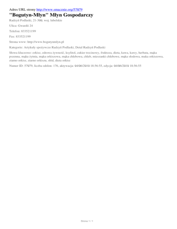 Adres URL strony http://www.smacznie.org/57079 "Bogutyn-Młyn" Młyn Gospodarczy Radzyń Podlaski, 21-300, woj. lubelskie Ulica: Gwardii 24 Telefon: 833521199 Fax: 833521199 Strona www: http://www.bogutynmlyn.pl Kategorie: Artykuły spożywcze Radzyń Podlaski, Detal Radzyń Podlaski Słowa kluczowe: orkisz, zdrowa żywność, ksylitol, cukier trzcinowy, fruktoza, dieta, kawa, kawy, herbata, mąka pszenna, mąka żytnia, mąka orkiszowa, mąka chlebowa, chleb, mieszanki chlebowe, mąka słodowa, maka orkiszowa, ziarno orkisz, ziarno orkiszu, słód, dieta orkisz Numer ID: 57079, liczba odsłon: 176, aktywacja: 04/06/2010 18:56:55, edycja: 04/06/2010 18:56:55 Strona 1 / 1