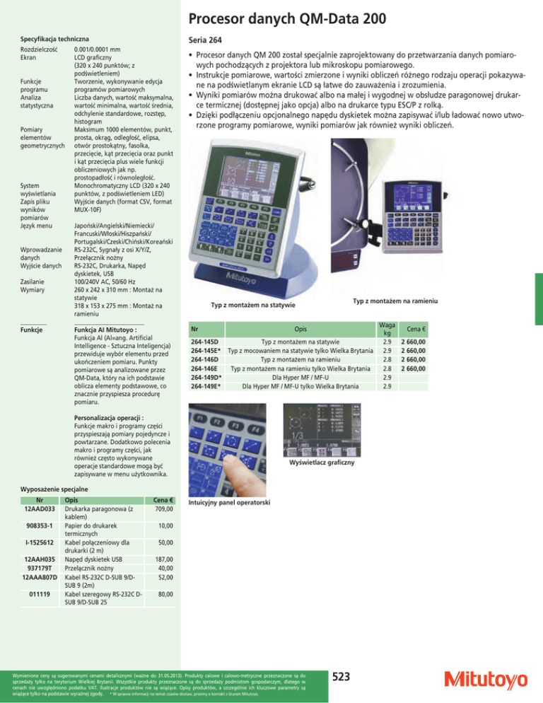 Procesor danych QM-Data 200 Specyfikacja techniczna Rozdzielczość Ekran Funkcje programu Analiza statystyczna Pomiary elementów geometrycznych System wyświetlania Zapis pliku wyników pomiarów Język menu Wprowadzanie danych Wyjście danych Zasilanie Wymiary _________ Funkcje Seria 264 0.001/0.0001 mm LCD graficzny (320 x 240 punktów; z podświetleniem) Tworzenie, wykonywanie edycja programów pomiarowych Liczba danych, wartość maksymalna, wartość minimalna, wartość średnia, odchylenie standardowe, rozstęp, histogram Maksimum 1000 elementów, punkt, prosta, okrąg, odległość, elipsa, otwór prostokątny, fasolka, przecięcie, kąt przecięcia oraz punkt i kąt przecięcia plus wiele funkcji obliczeniowych jak np. prostopadłość i równoległość. Monochromatyczny LCD (320 x 240 punktów, z podświetleniem LED) Wyjście danych (format CSV, format MUX-10F) Japoński/Angielski/Niemiecki/ Francuski/Włoski/Hiszpański/ Portugalski/Czeski/Chiński/Koreański RS-232C, Sygnały z osi X/Y/Z, Przełącznik nożny RS-232C, Drukarka, Napęd dyskietek, USB 100/240V AC, 50/60 Hz 260 x 242 x 310 mm : Montaż na statywie 318 x 153 x 275 mm : Montaż na ramieniu ________________________ Funkcja AI Mitutoyo : Funkcja Al (Al=ang. Artificial Intelligence - Sztuczna Inteligencja) przewiduje wybór elementu przed ukończeniem pomiaru. Punkty pomiarowe są analizowane przez QM-Data, który na ich podstawie oblicza elementy podstawowe, co znacznie przyspiesza procedurę pomiaru. • Procesor danych QM 200 został specjalnie zaprojektowany do przetwarzania danych pomiarowych pochodzących z projektora lub mikroskopu pomiarowego. • Instrukcje pomiarowe, wartości zmierzone i wyniki obliczeń różnego rodzaju operacji pokazywane na podświetlanym ekranie LCD są łatwe do zauważenia i zrozumienia. • Wyniki pomiarów można drukować albo na małej i wygodnej w obsłudze paragonowej drukarce termicznej (dostępnej jako opcja) albo na drukarce typu ESC/P z rolką. • Dzięki podłączeniu opcjonalnego napędu dyskietek można zapisywać i/lub ładować nowo utworzone programy pomiarowe, wyniki pomiarów jak również wyniki obliczeń. Typ z montażem na ramieniu Typ z montażem na statywie Waga kg 264-145D Typ z montażem na statywie 2.9 264-145E* Typ z mocowaniem na statywie tylko Wielka Brytania 2.9 264-146D Typ z montażem na ramieniu 2.8 264-146E Typ z montażem na ramieniu tylko Wielka Brytania 2.8 264-149D* Dla Hyper MF / MF-U 2.9 264-149E* Dla Hyper MF / MF-U tylko Wielka Brytania 2.9 Nr Personalizacja operacji : Funkcje makro i programy części przyspieszają pomiary pojedyncze i powtarzane. Dodatkowo polecenia makro i programy części, jak również często wykonywane operacje standardowe mogą być zapisywane w menu użytkownika. Opis Wyświetlacz graficzny Wyposażenie specjalne Nr 12AAD033 908353-1 I-1525612 12AAH035 937179T 12AAA807D 011119 Opis Drukarka paragonowa (z kablem) Papier do drukarek termicznych Kabel połączeniowy dla drukarki (2 m) Napęd dyskietek USB Przełącznik nożny Kabel RS-232C D-SUB 9/DSUB 9 (2m) Kabel szeregowy RS-232C DSUB 9/D-SUB 25 Cena € 709,00 Intuicyjny panel operatorski 10,00 50,00 187,00 40,00 52,00 80,00 Wymienione ceny są sugerowanymi cenami detalicznymi (ważne do 31.05.2013). Produkty calowe i calowo-metryczne przeznaczone są do sprzedaży tylko na terytorium Wielkiej Brytanii. Wszystkie produkty przeznaczone są do sprzedaży podmiotom gospodarczym, dlatego w cenach nie uwzględniono podatku VAT. Ilustracje produktów nie są wiążące. Opisy produktów, a szczególnie ich kluczowe parametry są wiążące tylko na podstawie wyraźnej zgody. * W sprawie informacji na temat czasów dostaw, prosimy o kontakt z biurem Mitutoyo. 523 Cena € 2 660,00 2 660,00 2 660,00 2 660,00