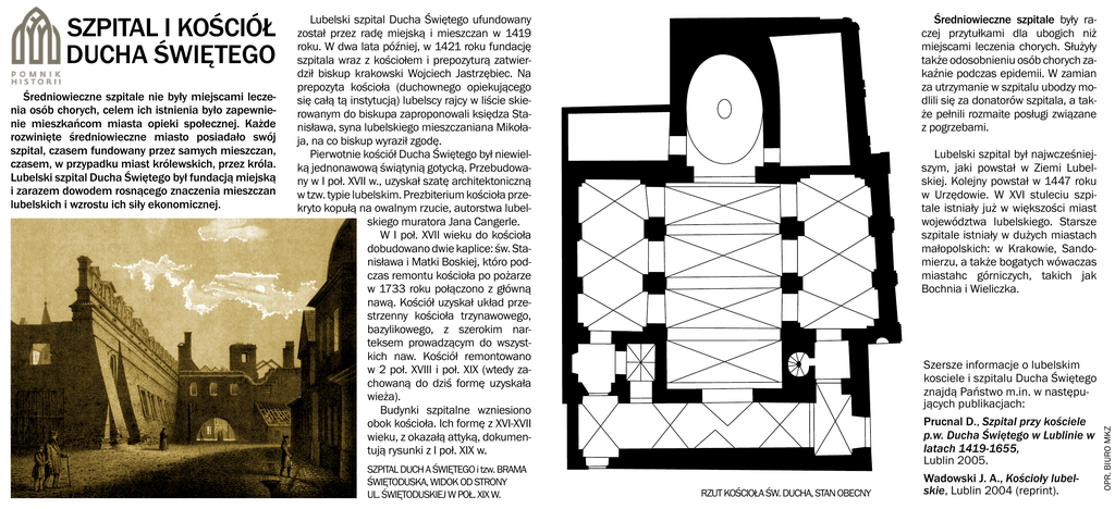Średniowieczne szpitale nie były miejscami leczenia osób chorych, celem ich istnienia było zapewnienie mieszkańcom miasta opieki społecznej. Każde rozwinięte średniowieczne miasto posiadało swój szpital, czasem fundowany przez samych mieszczan, czasem, w przypadku miast królewskich, przez króla. Lubelski szpital Ducha Świętego był fundacją miejską i zarazem dowodem rosnącego znaczenia mieszczan lubelskich i wzrostu ich siły ekonomicznej. Szpital Duch a świętego i tzw. brama świętoduska, widok od strony ul. świętoduskiej w poł. XIX w. Średniowieczne szpitale były raczej przytułkami dla ubogich niż miejscami leczenia chorych. Służyły także odosobnieniu osób chorych zakaźnie podczas epidemii. W zamian za utrzymanie w szpitalu ubodzy modlili się za donatorów szpitala, a także pełnili rozmaite posługi związane z pogrzebami. Lubelski szpital był najwcześniejszym, jaki powstał w Ziemi Lubelskiej. Kolejny powstał w 1447 roku w Urzędowie. W XVI stuleciu szpitale istniały już w większości miast województwa lubelskiego. Starsze szpitale istniały w dużych miastach małopolskich: w Krakowie, Sandomierzu, a także bogatych wówaczas miastahc górniczych, takich jak Bochnia i Wieliczka. rzut kościoła św. Ducha, stan obecny Szersze informacje o lubelskim kosciele i szpitalu Ducha Świętego znajdą Państwo m.in. w następujących publikacjach: Prucnal D., Szpital przy kościele p.w. Ducha Świętego w Lublinie w latach 1419-1655, Lublin 2005. Wadowski J. A., Kościoły lubelskie, Lublin 2004 (reprint). Opr. Biuro MKZ szpital i kościół Ducha świętego Lubelski szpital Ducha Świętego ufundowany został przez radę miejską i mieszczan w 1419 roku. W dwa lata później, w 1421 roku fundację szpitala wraz z kościołem i prepozyturą zatwierdził biskup krakowski Wojciech Jastrzębiec. Na prepozyta kościoła (duchownego opiekującego się całą tą instytucją) lubelscy rajcy w liście skierowanym do biskupa zaproponowali księdza Stanisława, syna lubelskiego mieszczaniana Mikołaja, na co biskup wyraził zgodę. Pierwotnie kościół Ducha Świętego był niewielką jednonawową świątynią gotycką. Przebudowany w I poł. XVII w., uzyskał szatę architektoniczną w tzw. typie lubelskim. Prezbiterium kościoła przekryto kopułą na owalnym rzucie, autorstwa lubelskiego muratora Jana Cangerle. W I poł. XVII wieku do kościoła dobudowano dwie kaplice: św. Stanisława i Matki Boskiej, któro podczas remontu kościoła po pożarze w 1733 roku połączono z główną nawą. Kościół uzyskał układ przestrzenny kościoła trzynawowego, bazylikowego, z szerokim narteksem prowadzącym do wszystkich naw. Kościół remontowano w 2 poł. XVIII i poł. XIX (wtedy zachowaną do dziś formę uzyskała wieża). Budynki szpitalne wzniesiono obok kościoła. Ich formę z XVI-XVII wieku, z okazałą attyką, dokumentują rysunki z I poł. XIX w.