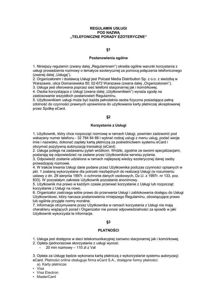 REGULAMIN USŁUGI POD NAZWĄ „TELEFONICZNE PORADY EZOTERYCZNE“ §1 Postanowienia ogólne 1. Niniejszy regulamin (zwany dalej „Regulaminem”) określa ogólne warunki korzystania z usługi prowadzenia rozmowy o tematyce ezoterycznej za pomocą połączenia telefonicznego (zwanej dalej „Usługą”). 2. Organizatorem i dostawcą Usługi jest Polcast Media Distribution Sp. z o.o. z siedzibą w Warszawie, ulica Domaniewska 50; 02-672 Warszawa (zwana dalej „Organizatorem”). 3. Usługa jest oferowana poprzez sieć telefonii stacjonarnej jak i komórkowej. 4. Osoba korzystająca z Usługi (zwana dalej „Użytkownikiem”) wyraża zgodę na zastosowanie wszystkich postanowień Regulaminu. 5. Użytkownikiem usługi może być każda pełnoletnia osoba fizyczna posiadająca pełną zdolność do czynności prawnych uprawniona do użytkowania karty płatniczej akceptowanej przez Spółkę eCard. §2 Korzystanie z Usługi 1. Użytkownik, który chce rozpocząć rozmowę w ramach Usługi, powinien zadzwonić pod wskazany numer telefonu - 32 784 84 88 i wybrać rodzaj uslugi z menu uslug, podać swoje imie i nazwisko, dokonać zapłaty kartą płatniczą za pośrednictwem systemu eCard i otrzymać pozytywną autoryzację transakcji (eCard) 2. Usługa polega na zadawaniu pytań wróżkom. Wróżki, zgodnie ze swoimi specjalizacjami, postarają się odpowiedzieć na zadane przez Użytkowników serwisu pytania. 3. Odpowiedź zostanie udzielona w ramach najlepszej wiedzy ezoterycznej danej osoby prowadzącej rozmowe. 4. W trakcie trwania Usługi dane podane przez Użytkownika podczas czynności opisanych w pkt. 1 zostaną wykorzystane dla potrzeb niezbędnych do realizacji Usługi (w rozumieniu ustawy z dn. 29 sierpnia 1997r. o ochronie danych osobowych, Dz.U. z 1997r. nr 133, poz. 833). W pozostałym zakresie Użytkownik pozostanie anonimowy. 5. Użytkownik ma prawo w każdym czasie przerwać korzystanie z Usługi lub rozpocząć korzystanie z Usługi na nowo. 6. Organizator zastrzega sobie prawo do przerwania Usługi i zablokowania dostępu do Usługi Użytkownikowi, który narusza postanowienia niniejszego Regulaminu, obowiązujące prawo lub ogólnie przyjęte normy moralne. 7. Informacje otrzymywane przez Użytkownika w ramach korzystania z Usługi nie mają charakteru wiążących porad i Organizator nie ponosi odpowiedzialności za sposób w jaki Użytkownik wykorzysta te informacje. §3 PŁATNOŚCI 1. Usługa jest dostępna w sieci telekomunikacyjnej zarowno stacjonarnej jak i komórkowej. 2. Opłata zjednorazowe skorzystanie z usługi wynosi: - 20 min rozmowy – 110 zł z Vat 3. Opłata za Usługę będzie wykonana kartą płatniczą z wykorzystanie systemu autoryzacji eCard. Płatności online obsługuje firma eCard S.A., dostępne formy płatności: a). Karty płatnicze: • Visa • Visa Electron • MasterCard • MasterCard Elektronic • Maestro 4. Organizator dołoży wszelkich starań w celu zapewnienia prawidłowego działania Usługi. 5. Organizator nie ponosi odpowiedzialności za: a) treść rozmów prowadzonych przez użytkownika z wrózką w ramach Uslugi., b) korzystanie z Usługi przez osoby nieuprawnione do użytkowania karty płatniczej, c) szkody spowodowane nieprawidłowym korzystaniem przez Użytkownika z Usługi, d) szkody spowodowane wykorzystaniem przez Użytkownika informacji otrzymanych w wyniku korzystania z Usługi, e) problemy w funkcjonowaniu Usługi, jeżeli nastąpiły one wskutek zdarzeń, których Organizator przy zachowaniu należytej staranności nie był w stanie przewidzieć, lub którym nie mógł zapobiec, w szczególności w przypadku problemów związanych ze zdarzeniami losowymi o charakterze siły wyższej, f) korzystanie z Usługi przez Użytkowników niezgodnie z postanowieniami niniejszego Regulaminu lub bez zapoznania się z Regulaminem, w tym zwłaszcza wynikające z niewłaściwego zrozumienia przez Użytkownika charakteru Usługi, g) przerwy w świadczeniu Usługi zaistniałe z przyczyn technicznych (np. konserwacja, przegląd, wymiana sprzętu) lub niezależnych od Organizatora. §4 POLITYKA PRYWATNOSCI 1. Użytkownik dokonując zakupu Usługi wyraża zgodę na przetwarzanie podanych przez niego danych osobowych w celu realizacji Usługi. 2. Podanie danych osobowych przez Użytkownika jest dobrowolne, jednak brak jednorazowej zgody na przetwarzanie danych osobowych w celu realizacji Usługi uniemożliwia jej zrealizowanie. 3. Organizator przetwarza dane osobowe Użytkownika jedynie w zakresie niezbędnym do zawarcia, realizacji, dokonania zmian lub rozwiązania umowy sprzedaży Uslugi. 4. Organizator zobowiązuje się do ochrony przechowywanych danych Użytkownika w sposób uniemożliwiający dostęp do nich osób trzecich zgodnie z Ustawą z dnia 29 sierpnia 1997 r. o ochronie danych osobowych (tekst jednolity Dz. U. z 2002 r. Nr 101 poz. 926 z późn. zmianami). 5. W przypadkach i na zasadach określonych w ustawie z dnia 29 sierpnia 1997 r. o ochronie danych osobowych (tekst jednolity Dz.U. 2002 r. Nr 101, poz. 926 z późn. zmianami), Użytkownik ma prawo żądania uzupełnienia, uaktualnienia, sprostowania danych osobowych, czasowego lub stałego wstrzymania ich przetwarzania lub ich usunięcia, jeżeli są one niekompletne, nieaktualne, nieprawdziwe lub zostały zebrane z naruszeniem prawa albo są już zbędne do realizacji celu, dla którego zostały zebrane, a także ma prawo wniesienia pisemnego żądania zaprzestania przetwarzania jego danych osobowych. 6. Organizator nie ponosi odpowiedzialności za skutki podania nieprawdziwych danych przez Użytkownika. §5 REKLAMACJE I ZWROTY 1. Organizator nie ponosi odpowiedzialności za: a) treść rozmów prowadzonych przez użytkownika z wrózką w ramach Uslugi., b) korzystanie z Usługi przez osoby nieuprawnione do użytkowania karty płatniczej, c) szkody spowodowane nieprawidłowym korzystaniem przez Użytkownika z Usługi, d) szkody spowodowane wykorzystaniem przez Użytko