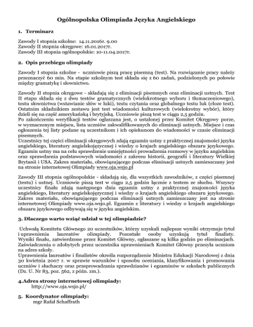 Ogólnopolska Olimpiada Języka Angielskiego 1. Terminarz Zawody I stopnia szkolne: 14.11.2016r. 9.00 Zawody II stopnia okręgowe: 16.01.2017r. Zawody III stopnia ogólnopolskie: 10-11.04.2017r. 2. Opis przebiegu olimpiady Zawody I stopnia szkolne - uczniowie piszą pracę pisemną (test). Na rozwiązanie pracy należy przeznaczyć 60 min. Na etapie szkolnym test składa się z 60 zadań, podzielonych po połowie między gramatykę i słownictwo. Zawody II stopnia okręgowe - składają się z eliminacji pisemnych oraz eliminacji ustnych. Test II etapu składa się z dwu testów gramatycznych (wielokrotnego wyboru i tłumaczeniowego), testu słownictwa (wstawianie słów w luki), testu czytania oraz globalnego testu luk (cloze test). Ostatnim składnikiem zestawu jest test wiadomości kulturowych (wielokrotny wybór), który dzieli się na część amerykańską i brytyjską. Uczniowie piszą test w ciągu 2,5 godzin. Po zakończeniu weryfikacji testów ogłaszana jest, o ustalonej przez Komitet Okręgowy porze, w wyznaczonym miejscu, lista uczniów zakwalifikowanych do eliminacji ustnych. Miejsce i czas ogłoszenia tej listy podane są uczestnikom i ich opiekunom do wiadomości w czasie eliminacji pisemnych. Uczestnicy tej części eliminacji okręgowych zdają egzamin ustny z praktycznej znajomości języka angielskiego, literatury angielskojęzycznej i wiedzy o krajach angielskiego obszaru językowego. Egzamin ustny ma na celu sprawdzenie umiejętności prowadzenia rozmowy w języku angielskim oraz sprawdzenia podstawowych wiadomości z zakresu historii, geografii i literatury Wielkiej Brytanii i USA. Zakres materiału, obowiązującego podczas eliminacji ustnych zamieszczany jest na stronie internetowej Olimpiady www.oja.wsjo.pl Zawody III stopnia ogólnopolskie - składają się, dla wszystkich zawodników, z części pisemnej (testu) i ustnej. Uczniowie piszą test w ciągu 2,5 godzin łącznie z testem ze słuchu. Wszyscy uczestnicy finału zdają następnego dnia egzamin ustny z praktycznej znajomości języka angielskiego, literatury angielskojęzycznej i wiedzy o krajach angielskiego obszaru językowego. Zakres materiału, obowiązującego podczas eliminacji ustnych zamieszczany jest na stronie internetowej Olimpiady www.oja.wsjo.pl. Egzamin z literatury i wiedzy o krajach angielskiego obszaru językowego odbywają się w języku angielskim. 3. Dlaczego warto wziąć udział w tej olimpiadzie? Uchwałą Komitetu Głównego 20 uczestników, którzy uzyskali najlepsze wyniki otrzymuje tytuł i uprawnienia laureatów olimpiady. Pozostałe osoby uzyskują tytuł finalisty. Wyniki finału, zatwierdzone przez Komitet Główny, ogłaszane są kilka godzin po eliminacjach. Zaświadczenia o zdobytych przez uczestnika uprawnieniach Komitet Główny przesyła uczniom na adres szkoły. Uprawnienia laureatów i finalistów określa rozporządzenie Ministra Edukacji Narodowej z dnia 30 kwietnia 2007 r. w sprawie warunków i sposobu oceniania, klasyfikowania i promowania uczniów i słuchaczy oraz przeprowadzania sprawdzianów i egzaminów w szkołach publicznych (Dz. U. Nr 83, poz. 562, z późn. zm.). 4.Adres strony internetowej olimpiady: http://www.oja.wsjo.pl/ 5. Koordynator olimpiady: mgr Rafał Schaffrath