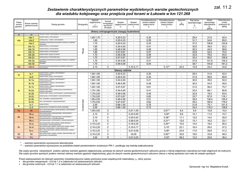 zał. 11.2 Zestawienie charakterystycznych parametrów wydzielonych warstw geotechnicznych dla wiaduktu kolejowego oraz przejścia pod torami w Łukowie w km 121.268 nla nlb nllc nl nla-1 nIa-2 nla-3 nIb-1a nIb-1b nIb-1c nlb-2b nlb-2c nlb-3a nlb-3b nIIc-b la-1 la-2 Ib-1a la Ib-1b Ib-1c lb-2a Ib-2b Ib-2c lb-3b lb-3c Ic-1 lc-2 lla lb lc lla IIb-a llb IIb-b IIb-c IIc-a llc IIc-b llc-c lld IVc IId lVc Rodzaj gruntów Stratygrafia tłuczeń i żużel z domieszkami i przewarstwieniami piasek drobny z domieszkami piasek gruby i średni z domieszkami pospółka przewarstwiona piaskiem drobnym z piaskiem gliniastym piasek drobny z domieszkami piasek drobny z domieszkami piasek drobny z domieszkami piasek średni i gruby ze żwirem Nasyp nl Numer warstwy geotechnicznej piasek gruby z domieszką żwiru pospółka przewarstwiona piaskiem drobnym z piaskiem gliniastym pospółka piasek gliniasty przewarstwiony piaskiem drobnym z domieszkami piasek drobny i pylasty z domieszkami i przewarstwieniami piasek średni i gruby z domieszkami piasek drobny i pylasty z domieszkami i przewarstwieniami piasek drobny i pylasty z domieszkami i przewarstwieniami piasek drobny i pylasty z domieszkami i przewarstwieniami piasek średni i gruby, piasek gruby przewarstwiony piaskiem gliniastym piasek średni i gruby z domieszkami i przewarstwieniami piasek gruby z domieszkami i przewarstwieniami żwir i pospółka z przewarstwieniami żwir z domieszkami i przewarstwieniami piasek drobny piasek gruby na pograniczu piasku pylastego glina, glina piaszczysta, piasek gliniasty z domieszkami i przewarstwieniami glina piaszczysta i piasek gliniasty z domieszkami i przewarstwieniami glina piaszczysta i piasek gliniasty z domieszkami i przewarstwieniami, pospółka gliniasta glina piaszczysta z domieszkami i przewarstwieniami glina piaszczysta, glina pylasta, piasek gliniasty z domieszkami i przewarstwieniami glina piaszczysta, pylasta, piaszczysta zwięzła, piasek gliniasty z domieszkami i przewarstwieniami glina, glina piaszczysta, pylasta, piaszczysta zwięzła z domieszkami glina piaszczysta i pylasta, zwięzła, piasek gliniasty, pył piaszczysty z domieszkami ił Czwartorzęd Pakiet warstw geotech. Gęstość objętościowa ρ [T/m3] Charakterystyczny (średni) stopień zagęszczenia ID Charakterystyczny (średni) stopień plastyczności IL Spójność cu [kPa] Kąt tarcia wewnętrznego Moduł pierwotnego odkształcenia Eo [MPa] Edometryczny moduł ściśliwości Mo [MPa] Utwory antropogeniczne (nasypy budowlane) 1,60-1,70 0,20-0,33 1,65 0,20-0,33 1,70 0,20-0,33 1,65 0,34-0,45 1,65 0,46-0,56 1,65 0,57-0,67 1,70 0,46-0,56 1,70 0,57-0,67 1,75 0,34-0,45 1,75 0,46-0,56 2,15 C 0,10-0,17 Utwory rodzime 0,30 0,29 0,33 0,41 0,48 0,57 0,49 0,57 0,41 0,54 - 0,13** 20,3 29,4 31,7 37,2 30,0 30,3 30,8 32,9 33,4 37,8 38,7 15,9 31,6 54,6 108,8 39,0 44,5 52,5 78,5 90,0 121,9 144,8 24,2 42,4 65,0 120,6 52,2 59,6 70,4 93,0 106,8 135,3 161,2 34,6 1,60-1,85 1,65-1,95 1,65-1,90 - 0,20-0,33 0,20-0,33 0,34-0,45 - 0,30 0,33 0,41 - - 29,4 31,9 30,0 31,6 58,9 39,0 42,4 69,9 52,2 1,65-1,90 - 0,46-0,56 - 0,48 - - 30,3 44,5 59,5 1,65-1,90 - 0,57-0,67 - 0,61 - - 31,0 56,4 75,7 1,70-1,85 1,70-2,00 1,70-2,00 1,90-2,05 1,75-2,05 2,00 2,05 1,95-2,05 C 0,34-0,45 0,46-0,56 0,57-0,67 0,46-0,56 0,57-0,67 0,68-1,00 0,68-1,00 - 0,51-1,00 0,41 0,49 0,62 0,51 0,62 0,78 0,73 - 0,51** 8,4 32,4 32,9 33,7 38,5 39,3 31,8 34,4 9,9 68,1 78,5 97,8 139,4 160,0 75,1 116,3 10,8 80,8 93,0 116,1 155,0 178,2 101,4 138,6 15,4 2,10 C - 0,43-0,50 - 0,50* 8,6 10,1 11,0 15,7 2,10 2,10 2,10-2,20 C C C - 0,35-0,42 0,26-0,34 0,18-0,25 - 0,38** 0,31** 0,25** 11,1 13,0 15,0 12,0 13,1 14,0 14,0 16,2 18,4 20,0 23,1 26,3 2,10-2,20 C - 0,10-0,17 - 0,10* 22,1 16,4 26,0 37,2 2,10-2,20 C - 0,01-0,09 - 0,06* 24,9 17,0 28,8 41,2 2,10-2,25 2,00 C D - ≤0,00 0,01-0,25 - 0,00** 0,03* 30,0 58,3 18,0 12,5 33,8 20,6 48,3 36,4 Symbol konsolidacji wg PN-81/ B-03020 Stopień Stopień zagęszczenia plastyczności ID IL φu [°] * - wartości parametrów wyznaczone laboratoryjnie ** - wartości parametrów wyznaczone na podstawie badań penetrometrem wciskowym PW-1, posiłkując się metodą wałeczkowania Dla części gruntów niespoistych podano zakresy wartości gęstości objętościowej, ponieważ do danych warstw geotechnicznych zaliczono grunty o różnej wilgotności naturalnej (od mało wilgotnych do mokrych). Dla części gruntów spoistych podano również zakresy wartości gęstości objętościowej, gdyż do danych warstw geotechnicznych zaliczono utwory o różnej spoistości (od mało do zwięzło spoistych. Przed zastosowaniem do obliczeń parametry charakterystyczne należy pomnożyć przez współczynnik materiałowy γm, który wynosi: § dla gruntów nasypowych - 0,8 lub 1,2 w zależności od zastosowanych obliczeń, § dla gruntów rodzimych - 0,9 lub 1,1 w zależności od zastosowanych obliczeń. Opracował: mgr inż. Magdalena Kudyk