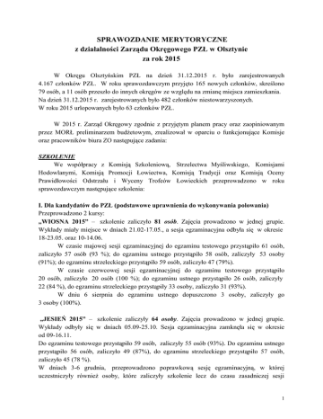SPRAWOZDANIE MERYTORYCZNE z działalności Zarządu Okręgowego PZŁ w Olsztynie za rok 2015 W Okręgu Olsztyńskim PZŁ na dzień 31.12.2015 r. było zarejestrowanych 4.167 członków PZŁ. W roku sprawozdawczym przyjęto 165 nowych członków, skreślono 79 osób, a 11 osób przeszło do innych okręgów ze względu na zmianę miejsca zamieszkania. Na dzień 31.12.2015 r. zarejestrowanych było 482 członków niestowarzyszonych. W roku 2015 urlopowanych było 63 członków PZŁ. W 2015 r. Zarząd Okręgowy zgodnie z przyjętym planem pracy oraz zaopiniowanym przez MORŁ preliminarzem budżetowym, zrealizował w oparciu o funkcjonujące Komisje oraz pracowników biura ZO następujące zadania: SZKOLENIE We współpracy z Komisją Szkoleniową, Strzelectwa Myśliwskiego, Komisjami Hodowlanymi, Komisją Promocji Łowiectwa, Komisją Tradycji oraz Komisją Oceny Prawidłowości Odstrzału i Wyceny Trofeów Łowieckich przeprowadzono w roku sprawozdawczym następujące szkolenia: I. Dla kandydatów do PZŁ (podstawowe uprawnienia do wykonywania polowania) Przeprowadzono 2 kursy: „WIOSNA 2015” – szkolenie zaliczyło 81 osób. Zajęcia prowadzono w jednej grupie. Wykłady miały miejsce w dniach 21.02-17.05., a sesja egzaminacyjna odbyła się w okresie 18-23.05. oraz 10-14.06. W czasie majowej sesji egzaminacyjnej do egzaminu testowego przystąpiło 61 osób, zaliczyło 57 osób (93 %); do egzaminu ustnego przystąpiło 58 osób, zaliczyły 53 osoby (91%); do egzaminu strzeleckiego przystąpiło 59 osób, zaliczyło 47 (79%). W czasie czerwcowej sesji egzaminacyjnej do egzaminu testowego przystąpiło 20 osób, zaliczyło 20 osób (100 %); do egzaminu ustnego przystąpiło 26 osób, zaliczyły 22 (84 %), do egzaminu strzeleckiego przystąpiły 33 osoby, zaliczyło 31 (93%). W dniu 6 sierpnia do egzaminu ustnego dopuszczono 3 osoby, zaliczyły go 3 osoby (100%). „JESIEŃ 2015” – szkolenie zaliczyły 64 osoby. Zajęcia prowadzono w jednej grupie. Wykłady odbyły się w dniach 05.09-25.10. Sesja egzaminacyjna zamknęła się w okresie od 09-16.11. Do egzaminu testowego przystąpiło 59 osób, zaliczyły 55 osób (93%). Do egzaminu ustnego przystąpiło 56 osób, zaliczyło 49 (87%), do egzaminu strzeleckiego przystąpiło 57 osób, zaliczyło 45 (78 %). W dniach 3-6 grudnia, przeprowadzono poprawkową sesję egzaminacyjną, w której uczestniczyły również osoby, które zaliczyły szkolenie lecz do czasu zasadniczej sesji 1 egzaminacyjnej nie uzyskały zaliczenia rocznego stażu łowieckiego. Po dopełnieniu tego warunku uczestniczyły w grudniowej sesji egzaminacyjnej. Do części testowej przystąpiło 8 osób, wszystkie zaliczyły egzamin pozytywnie (100%). Do części ustnej przystąpiło 14 osób, zaliczyło egzamin 13 (92%). Do części strzeleckiej przystąpiło 19 osób, zaliczyło 13 (68%). II. Dla kandydatów na selekcjonerów (selekcjonerskie uprawnienia do wykonywania polowania) Przeprowadzono 3 kursy: „ZIMA 2015” szkolenie zaliczyło 68 osób. Zajęcia odbywały się w dniach 01- 08.02. Sesja egzaminacyjna odbyła się w dniach 16-20.02. Do egzaminu testowego przystąpiło 68 osób, pozytywnie zaliczyło go 66 osób (97 %). Do egzaminu ustnego przystąpiło 65 osób, pozytywnie zaliczyło egzamin 63 (96%). W toku dodatkowych sesji egzaminacyjnych do testu przystąpiła 1 osoba i zaliczyła egzamin, do części ustnej przystąpiły 4 osoby i wszystkie zaliczyły egzamin. „LATO 2015” szkolenie zaliczyły 43 osoby. Zajęcia odbywały się w dniach 25.07-02.08. Sesja egzaminacyjna odbyła się w dniach 03-06.08. Do egzaminu testowego przystąpiły 32 osoby, pozytywnie zaliczyły go 32 osoby (100%). Do egzaminu ustnego przystąpiły 32 osoby, pozytywnie zaliczyły egzamin 32 (100 %). W toku dodatkowej sesji egzaminacyjnej do testu przystąpiło 5 osób – wszystkie zaliczyły egzamin (100%). Do części ustnej przystąpiło 5 osób, z czego 5 pozytywnie zaliczyło egzamin (100%). „JESIEŃ 2015” szkolenie zaliczyło 29 osób. Zajęcia odbywały się w dniach 28.11.-05.12. Sesja egzaminacyjna odbyła się w dniach 07-09.12. Do egzaminu testowego przystąpiły 27 osób, pozytywnie zaliczyło go 27 osób (100%). Do egzaminu ustnego przystąpiło 27 osób, pozytywnie zaliczyły egzamin 24 (88%). III. Dla Łowczych kół łowieckich dzierżawiących obwody na terenie ZO PZŁ w Olsztynie (14-15.02.) Na spotkaniu m.in. szczegółowo omówiono zagadnienia związane z wytycznymi do sporządzania RPŁ na sezon 2015/2016, zasady opiniowania i uzgadniania RPŁ oraz harmonogram oceny prawidłowości odstrzału byków jeleni i danieli. W szkoleniu uczestniczyło 76 osób. IV. Dla Prezesów i Sekretarzy kół łowieckich Okręgu Olsztyńskiego PZŁ (21-22.03.) Szkolenie dotyczyło w szczególności procedur obowiązujących w czasie Walnych Zgromadzeń, związanych z przeprowadzaniem wyborów władz koła oraz delegatów na OZD. Szkolenie prowadził prawnik – sędzia Kol. Remigiusz Chmielewski. W szkoleniu uczestniczyły 102 osoby. V. Szkolenie z zakresu szacowania szkód łowieckich – cykl trzydniowy - 20 godz. wykładów oraz zajęcia terenowe (17-19.05.) 2 Szkolenie obejmowało część teoretyczną w formie wykładów oraz część praktyczną. Zajęcia prowadzili prof. dr hab. Kazimierz Zalewski i prof. dr hab. Kazimierz Grabowski, pracownicy naukowi UWM, oraz znawcy tematu szkód łowieckich. W szkoleniu uczestniczyły 22 osoby. VI. Szkolenie z zakresu metod redukcji populacji bobrów. Szkolenie zorganizowano wspólnie z RDOŚ w Olsztynie. Wykładowcami byli : Paweł Janczyk z RDOŚ i Jan Goździewski z PZŁ. Uczestnicy otrzymali z RDOŚ w Olsztynie zaświadczenia o uczestnictwie w szkoleniu. W szkoleniu uczestniczyło 87 osób. VII. Warsztaty " o bioróżnorodności dla przyszłości - czyli jak uczyć, że sarna nie jest żoną jelenia" - (21-22.11.) – przeprowadzono dla edukatorów łowieckich (myśliwych i nauczycieli) W warsztatach wzięło udział 117 osób