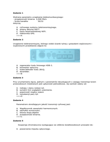 Zadanie 1 Wybrane parametry urządzania telekomunikacyjnego: - przepływność binarna 2,048 Mb/s - liczba kanałów 30/32 dotyczą: A. cyfrowego systemu teletransmisyjnego. B. anteny aktynej DECT. C. Karty bezprzewodowej WIFi. D. Odbiornika GPS. >>>A Zadanie 2 Urządzenie teletransmisyjne, którego widok ścianki tylnej z gniazdami wejściowymi i wyjściowymi przedstawia zdjęcie to: A. regenerator kodu liniowego HDB-3. B. konwerter optyczny. C. koder/dekoder kodu 2B1Q. D. skrambler. >>>B Zadanie 3 Przy uruchamianiu łącza, jednym z parametrów decydujących o zasięgu transmisji torem przewodowym miedzianym jest upływność jednostkowa. Jej wartość zależy od: A. rodzaju i stanu izolacji żył. B. symetrii linii względem uziemienia. C. pojemność między żyłami D. rezystancji pary żył. >>>D Zadanie 4 Parametrem określającym jakość transmisji cyfrowej jest: A. Współczynnik zawartości harmonicznych. B. odchyłka wzmocności. C. bitowa stopa błędów D. przepływność binarna. >>>C Zadanie 5 Dyspersja chromatyczna występujące we włóknie światłowodowym prowadzi do: A. poszerzenia impulsu optycznego. B. ograniczenia impulsu optycznego. C. skupienia impulsu optycznego. D. wzmocnienia impulsu optycznego. >>>A Zadanie 6 Światłowód, w którym wartość współczynnika załamania rdzenia zmniejsza się stopniowo w kierunku granicy z płaszczem, nazywamy: A. skokowym. B. gradientowym. C. spolaryzowanym. D. niespolaryzowanym. >>>B Zadanie 7 W pokazanej strukturze pakietu informacji funkcja nagłówka jest: A. przesyłanie adresu docelowego pakietu. B. wskazanie początku pakietu. C. Wskazanie końca pakietu. D. przesłanie informacji użytkowej do nadawcy. >>>B Zadanie 8 Moduł urządzenia telekomunikacyjnego, którego charakterystykę pokazano na rysunku to filtr: A. aktywny dolno przepustowy. B. bierny górno przepustowy. C. aktywny pasmowo przepustowy. D. bierny pasmowo zaporowy. >>>C Zadanie 9 W sieci central telefonicznych miejskich występuje nieosiągalność połączeń realizowanych z centrali A do B, przy prawidłowych połączeń pozostałych wskaż, który podzespół sieci jest uszkodzony: A. komputer systemu rozliczeniowego sieci. B. abonenckie zespoły liniowe centrali B. C. abonenckie zespoły liniowe centrali A. D. Kabel między centralnego lub zespoły przyłączeniowe w kierunku A=>B. >>>D Zadanie 10 Jedną z podstawowych faz przetwarzania podczas modulacji PCM jest próbkowanie. Dla sygnału analogowego o widmie 300-3400 Hz, przyjmuje się częstotliwość próbkowania fp = 8 kHz. Dla powyższych danych okres próbkowania wynosi: A. 75 µs B. 100 µs C. 125 µs D. 150 µs >>>C Zadanie 11 Rysunek przedstawia schemat blokowy łącza cyfrowego ISDN BRA. Wskaż zespół, który realizuje funkcje komutacyjne wewnątrz instalacji użytkownika oraz steruje dostępem do sieci publicznej: A. TE 1 B. TA C. NT 1 D. NT 2 >>>D Zadanie 12 Ile urządzeń końcowych może jednocześni mieć dostęp do sieci publicznej PSTN z przyłącza ISDN BRA, którego schemat blokowy przedstawiono na rysunku? A. jedno B. dwa C. trzy D. cztery >>>B Zadanie 13 Wskaż zespół, który w urządzeniu PCM 30/32, przedstawionym na rysunku, przekształca sygnał binarny do postaci kodu liniowego w celu wysłania do urządzeń traktu liniowego. A. (1) B. (2) C. (3) D. (4) >>>C Modulator PAM. Koder PCM. Transkoder NRZZ/HDB-3. Zegar liniowy. Zadanie 14 Sposób instalacji czterech telefonów cyfrowych ISDN u abonenta, przestawiony na rysunku, nosi nazwę: A. długiej magistrali pasywnej. B. krótkiej magistrali pasywnej C. krótkiej magistrali aktywnej. D. długiej magistrali aktywnej. >>>C Zadanie 15 Jaki przebieg napięcia generatorów taktu (zegara głównego i kanałowego), gwarantuje prawidłowe działanie urządzeń PCM? A. Sinusoidalny B. Piłokształtny C. Prostokątny D. Szpilkowy >>>C Zadanie 16 Limitowanie jednostek taryfikacyjnych polega na zablokowaniu wszystkich połączeń wychodzących: A. po osiągnięciu w danym miesiącu przez abonenta określonej liczby jednostek. B. za wyjątkiem połączeń bezpłatnych, po osiągnięciu w danym miesiącu przez abonenta określonej liczby jednostek. C. po osiągnięciu w danym miesiącu przez abonenta określonej liczby jednostek. D. za wyjątkiem połączeń bezpłatnych, po osiągnięciu w danym miesiącu przez abonenta określonej liczby połączeń. >>>B Zadanie 17 Połączenie bloków GMSC z PSTN/ISDN/Sieci danych w systemie GSM umożliwia abonentom sieci komórkowej: A. rejestrację terminali ruchomych. B. kontrolę stacji bazowych. C. połączenie do sieci stacjonarnej. D. rejestrację abonentów obcych. >>>C Zadanie 18 Do napraw urządzeń pod napięciem 230V/50Hz użyjesz: A. wkrętaka płaskiego z izolowana rączką. B. wkrętaka płaskiego z izolowana rączka i izolowaną częścią metalową o niewiadomym napięciu probierczym. C. wkrętaka płaskiego z izolowana rączka i izolowaną częścią metalową o napięciu probierczym 500V D. dowolnego wkrętaka płaskiego. >>>C Zadanie 19 Środkiem ochrony indywidualnej zabezpieczającym wzrok przed promieniowaniem lasera klasy III AB : A. jest osłona czoła ferruli. B. jest osłona pleksi patchpanelu. C. są dowolne okulary ochronne. D. są dowolne okulary korekcyjne. >>>A Zadanie 20 Krotnica abonencka PCM zasilana jest z sieci niskiego napięcia 230V. Wewnętrzny zasilacz wytwarza napięcie stałe: 5V, 12V i 48V do zasilania obwodów cyfrowych i abonenckich oraz napięcie przemienne o wartości 95V wykorzystywane jako napięcie dzwonienia. Wskaż pierwszą czynności jaką należy wykonać podczas podłączenia linii abonenckich do urządzenia: A. Wyłączyć zasilanie napięciem 48V. B. Wyłączyć zasilanie napięciem 95V. C. Wyjąć pakiety abonenckie krotnicy. D. Wyłączyć zasilanie krotnicy z sieci 230V. >>>D Zadanie 21 Przed użyciem opalarki elektrycznej w studzience kablowej, w pierwszej kolejności należy: A. sprawdzić stan techniczny opalarki. B. sprawdzić napi