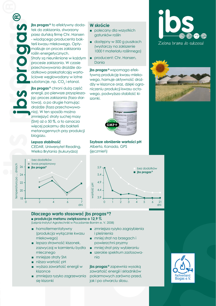 ® jbs progas jbs progas ® jbs progas ® to efektywny dodatek do zakiszania, stworzony przez duńską firmę Chr. Hansen - wiodącego producenta bakterii kwasu mlekowego. Optymalizuje on proces zakiszania roślin energetycznych. Straty są nieuniknione w każdym procesie zakiszania. W czasie przechowywania drożdże dodatkowo przekształcają wartościowe węglowodany w lotne substancje, np. CO2 i etanol. jbs progas ® chroni dużą część energii, po pierwsze przyspieszając proces zakiszania (faza startowa), a po drugie hamując drożdże (faza przechowywania). W ten sposób można zmniejszyć straty suchej masy (SM) aż o 50 %, a to oznacza więcej pokarmu dla bakterii metanogennych przy produkcji biogazu. ■ ■ ■ 26 ■ polecany dla wszystkich gatunków roślin ■ dostępny w 500 g puszkach (wystarczy na zakiszenie 1000 t materiału roślinnego) ■ producent: Chr. Hansen, Dania jbs progas ® wspomaga efektywną produkcję kwasu mlekowego, hamuje aktywność drożdży w kiszonce oraz, dzięki ograniczeniu produkcji kwasu octowego, podwyższa stabilość kiszonki. Szybsze obniżenie wartości pH Alberta, Kanada, GPS (jęczmień) bez dodatków kwas propionowy jbs progas® 5,9 24 5,4 22 4,9 wartość pH temperatura po ... dniach Lepsza stabilność CEDAR, Uniwersytet Reading, Wielka Brytania (kukurydza) W skrócie 20 18 0 2 4 6 ■ ■ bez dodatków jbs progas ® 4,4 3,9 7 dni 0 1 2 3 4 5 Dlaczego warto stosować jbs progas ®? ■ produkcja metanu zwiększona o 12,9 % (Leipniz-Instytut Agrotechniki w Poczdamie-Bornim e. V. 2008) ■ homofermentatywny (produkcja wyłącznie kwasu mlekowego) ■ lepsza strawność kiszonek, zazwyczaj w karmieniu bydła mlecznego ■ mniejsze straty SM ■ niższa wartość pH ■ wyższa zawartość energii w kiszonce ■ zmniejsza ryzyko zagrzewania się kiszonki ■ zmniejsza ryzyko zagrzybienia i pleśnienia ■ mniej strat na brzegach i powierzchni pryzmy ■ mniej strat przy wybieraniu ■ szerokie spektrum zastosowania jbs progas ® zapewnia wysoką zawartość energii i składników pokarmowych zarówno przed, jak i po otwarciu silosu. 6 21 dni Leipniz - Instytut Agrotechniki w Poczdamie - Bornim e.V. 2008 Objektem doświadczenia była kiszonka z kukurydzy (37,7 % SM), zakiszana 49 dni według wytycznych DLG. Produkcja metanu w dm3 na kg kiszonki Produkcja metanu w dm3 na kg suchej masy kg kg 120 98,3 100 + ,4 % 14 350 112,5 300 80 250 60 200 40 100 20 50 0 0 jbs progas ® bez dodatku 276,8 % 3,6 +1 bez dodatku 311,8 jbs progas ® Homo- czy heterofermentatywne bakterie kwasu mlekowego (BKM)? Aby dobrze zakisić materiał roślinny konieczne jest szybkie przekształcenie cukru roslinnego w silnie zakwaszający kwas mlekowy. Niskie pH ogranicza rozwój szkodliwych mikroorganizmów. Nie wszystkie rodzaje bakterii tworzą kwas mlekowy tak samo efektywnie. Uwaga: Przy powstaniu (lotnych) alkoholi oraz CO2 zużyta zostaje energia. jbs progas ® składa się wyłącznie z homofermentatywnych bakterii kwasu mlekowego, które utrzymują ważne składniki pokarmowe w kiszonce. Przekształcenie cukrów przez homofermentatywne BKM w jbs progas ® Cukier/skrobia → 100 % kwas mlekowy Przekształcenie cukrów przez mało efektywne heterofermentatywne BKM (np. Lactobacillus buchneri) Cukier/skrobia → kwas mlekowy + kwas octowy + alkohol + CO2 Kiszonka z kukurydzy, 33 % SM 48,7 (średnie wartości z udostępnionych wyników doświadczenia) bez dodatków bakterie produkujące kw. octowy jbs progas ® 39,9 50 40 0 kw. mlekowy 6,0 10,9 6,1 19,5 8,6 10 18,5 20 21,5 30 kg/t kiszonki jbs progas jbs progas ® Biogas - Doświadczenia z jbs progas ® kw. octowy straty SM Homo- czy heterofermentatywne bakterie kwasu mlekowego (producenci kwasu octowego)? Zakiszanie heterofermentatywne: cukier ——►kw. mlekowy + alkohol + kw. octowy + CO2 alkohol biogazownia kw. octowy silos Producenci kwasu octowego, czyli heterofermentatywne BKM, przeprowadzają fermentację, której produktami są gł. kwas octowy, alkohol i dwutlenek węgla. Powodują one zmniejszenie zawartości cukru w kiszonce. CO2 kw. mlekowy W praktyce bakterie produkujące kwas octowy stosuje się do polepszenia stabilności kiszonki, ich minusem jest jednak wysokie zużycie energii. Oznacza to, że stabilność jest wprawdzie wyższa, ale straty suchej masy są większe niż w kiszonkach bez dodatków. Zakiszanie homofermentatywne: cukier ——►100 % kwas mlekowy kw. octowy silos Producenci kwasu mlekowego, a więc homofermentatywne BKM, przekształcają cukier do kwasu mlekowego w stosunku 1:1. Szybki przebieg procesu zakiszania chroni składniki po- kw. mlekowy węglowodany karmowe, w tym dużą część węglowodanów, które zostałyby stracone bez dodatków lub przy zastosowaniu heterofermentatywnych BKM. Czy kwas octowy nie jest lepszy do zbiornika fermentacyjnego? Rentowność (energia elektryczna): na kg węglowodanów* (cukier, skrobia) na kg kw. mlekowego* na kg kw. octowego* = 1,4 kWh Z 1 kg kwasu octowego zostaje wyprodukowana podobna *źródło: Instytut Fraunhofer ilość energii elektrycznej co z 1 kg kwasu mlekowego lub cukru, co jest wbrew popularnemu twierdzeniu, że duża ilość kwasu octowego w kiszonce jest korzystna. Wręcz przeciwnie. Ponieważ produkcji kwasu octowego zawsze towarzyszy powstawanie dwutlenku węgla, stracone zostaje więcej energii, niż przy produkcji kwasu mlekowego. biogazownia jbs progas jbs progas ® ® Jesteśmy blisko, dosłownie na odległość telefonu! Doświadczenia z praktyki Temat: straty świeżej masy Wielu producentów biogazu jest przekonanych, że zakiszacze stosuje się tylko w kiszonkach przeznaczonych do skarmiania zwierząt. Obecnie opłaca się jednak stosowanie odpowiednich dodatków także w kiszonkach przeznaczonych na produkcję biogazu. Oto przykład z praktycznego zastosowania jbs progas ®: Przy dobrej organizacji i prawidłowym przebiegu zakiszania straty świeżej masy na poziomie do 3 - 4 % są normalne. Kiszonka wygląda 