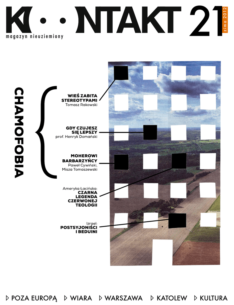 z i m a 2 012 21 ISSN: 1898-9195 magazyn nieuziemiony Poza Europą WIARA warszawa katolew KULTURA “Kontakt” to też tygodnik internetowy Co poniedziałek nowe teksty, wywiady, grafiki i recenzje PROJEKT GRAFICZNY, SKŁAD I ŁAMANIE: Jan Libera, Urszula Woźniak PROJEKT GRAFICZNY PIERWSZEJ STRONY OKŁADKI: Kuba Mazurkiewicz FOTOEDYCJA: Tomek Kaczor KOREKTA: Zespół redakcyjny NAKŁAD: 1000 egzemplarzy Wydawca: KIK Warszawa EDYCJA: Jan Bajtlik, Rafał Bakalarczyk, Agata Bluj, Ala Budzyńska, Maciej Bulanda, Staś Chankowski, Bohdan Cywiński, Jędrzej Dudkiewicz, ks. Andrzej Gałka, Arek Gruszczyński, Wawrzyniec Haman, Adam Hornung, Wanda Kaczor, Ewa Kiedio, Karol Kleczka, Rafał Kucharczuk, Łukasz Kuśmierz, Anna Libera, Piotr Maciejewski, Filip Mazurczak, Kuba Mazurkiewicz, Anna Micińska, Olga Micińska, Hanka Owsińska, ks. Wacław Oszajca SJ, o. Marek Pieńkowski OP, Antek Sieczkowski, Ewa Smyk, Jan Suffczyński, ks. Sławomir Szczepaniak, Krzysztof Śliwiński, Joanna Święcicka, Ewa Teleżyńska, Kamil Trombik, Jan Wiśniewski, Krzysztof Wołodźko, Jagoda Woźniak, Bartosz Wróblewski, Stanisław Zakroczymski, Jarosław Ziółkowski WSPÓŁPRACA: WIARA: Ignacy Dudkiewicz ([email protected]) KULTURA: Katarzyna Kucharska ([email protected]) POZA EUROPĄ: Paweł Cywiński ([email protected]) WARSZAWA: Cyryl Skibiński ([email protected]) KATOLEW: Maciek Onyszkiewicz FOTOREPORTAŻ: Tomek Kaczor ([email protected]) DZIAŁY: www.magazynkontakt.pl [email protected] KONTAKT: REDAKTOR NACZELNY: Misza Tomaszewski ZASTĘPCA: Maciek Onyszkiewicz SEKRETARZ REDAKCJI: Tomek Kaczor REDAKTOR PROWADZĄCY: Jan Mencwel ZESPÓŁ REDAKCYJNY: Paweł Cywiński, Ignacy Dudkiewicz, Jan Libera, Mateusz Luft, Katarzyna Kucharska, Jan Mencwel, Joanna Sawicka, Cyryl Skibiński, Kosta Święcicka, Ignacy Święcicki, Paweł Zerka REDAKCJA: Ch am nu of ob ia rze me N lit a ła a p r m śm rob nym ach ży y lem „ w łob o t em spo Kon w p o y y m n łe c t a n ls się , k ż ie ze t a ni Dl sze kim ws e w tyl ńst u” a śr za p j k s zy s ko w wi gu ed cji” iew ult poł stk poł po em elo są st nie , k có ur ec im ec lsk . K kr je dl u. I j o tór w ze zeń . A zeń ieg ry otn ja dn a n nt kre y n ne i h st le st o, tyk ie z ki p i cz iej elig śle ie p olib isto wie nie wie ale ow daw ty igł rz uj rel en nie oz er rii d ró lu ta al al m y w yj ą s ig cja „ w aln . ec wn dz kż iśm iś m yd o i e lu id ęł y ię ijn k wi ala eg de ł uj ści o z wi y n y w le y a e o ą i e m y, a pol ps mi toli śni nam m b t ta o p liż lu eró yra o , s m sk i o „d ck ak k ż rz o n z a w z to o ie d zi a ” do de e e c y c h no n a i n że e d ku cz to g lu po ie m o ś sz am to lit ru sa uje sy on ro y g i z d z ż n st a d n c i e y m na wł , po ich mi” wy non ć Z wo ia ie tu ich ko tę a a . ż . ł y t y si s n s dr śn gł M Ż sz im ch ju od ie ęb o yje oś c od po s y l k e e p o om k n m o e ko łec ic oto ze „c ia t del m ć w zło u. lsk bo ko no ze zn m do ha e p za y w o wi W a w b lic no m ńs e, za bu mo od ś r kr ec eka jęz ie zn m icz tw kt e do fob zia oz aju „m za yk ś je e, ia. ny . P óre ga w ia ł y wo , w oh co u w st za O m is s y ”, , z ju k e fa i „b ko ro le al ą le cz a r e n a t o i ps y m ję ór w eg lko la rz zła pi il s i y ze i s a zy m yc o m te en m ej i go tr st k h i io ie m e p n j a b ne o js , e c e op a m ga h e za is wi ere zba kie od lit lit cie u r elu tów w j k er ar p ra ze p ” io la ne rz ć. cz o , k ne sy go ed M yw zio tór go sp sz oże is ma zy o ł e r o r o to c h e c k b śc z e o i m i, Re ńs poj y da t w ę kc a? ja w spis treści: zima 2012 4 Temat numeru: Chamofobia Rozmowa z dr. Tomaszem Rakowskim: Umysły skolonizowane Tomek Kaczor: Myślałem, że już tu nie wrócę Paweł Cywiński i Misza Tomaszewski: Barbarzyńca w moherze Rozmowa z prof. Henrykiem Domańskim: Gdy czujesz się lepszy Joanna Sawicka: Wiocha, tylko większa Ignacy Święcicki i Paweł Zerka: Sens w wielkim mieście Agata Młodawska: Stosowane uprzedzenia społeczne 40 Wiara Wacław Oszajca sj: Wiele twarzy Jezusa Rozmowa z Siostrą prof. Barbarą Chyrowicz: Bez kropki nad „i” Ignacy Dudkiewicz: Droga przez mękę 48 Kultura Paweł Zerka: Prasa: ucieczka do przodu Julia Olesińska: Rewolucja w krainie paprotek Książki, które nas szukają: Wisława Szymborska, „Poczta literacka, czyli jak zostać (lub nie zostać) pisarzem” Wtomigraj: KROKE, „Feelharmony” 56 Poza Europą Rozmowa z dr. Piotrem Weiserem: Postsyjoniści w Izraelu Jarosław Ziółkowski: Ziemia różnych ojców 64 Katolew Misza Tomaszewski: Błogosławieni ubodzy Rozmowa z ks. Andrzejem Pietrzakiem: Czarna legenda czerwonej teologii Ignacy Dudkiewicz: Graham Greene 78 Warszawa Rozmowa z Filipem Springerem: Szaleńcy z zasadami Alicja Szulczyk: Osiedle prototypów Wars/Sawa: Pracownia kobiety dojrzałej Wielcy Warszawscy: Ksiądz Bronisław Bozowski 92 Człowiek Numeru Rozmowa z Ewą Kiedio i Ewą Karabin: Dywiz katolaicki 96 Fotoreportaż Joanna Kinowska: Dać dziecku aparat! s.4 Ilustracja: Hanka Owsińska CHAMOFOBIA Wielkie miasta przyciągają jak magnes, a „wieś” to w potocznym języku ich mieszkańców synonim zacofania i braku perspektyw. Decyzja o wyjeździe do miasta to z pozoru bilet w jedną stronę. Jak odnajdują się w metropoliach coraz liczniejsi przyjezdni z „prowinicji”? Czy i jak widzą swoją przyszłość ci, którzy zdecydowali się wrócić na wieś? O pierwszych pisze Joanna Sawicka, z drugimi rozmawia Tomek Kaczor. Fot.: Filip Springer Ilustracja: Patricija Bliuj–Stodulska Ilustracja. Ania Micińska s.41 Nie z każdej sytuacji, w której się znajdujemy, istnieje dobre wyjście. O tym, czy można się z tym pogodzić, co robić, gdy brakuje odpowiedzi, gdzie ich szukać i czy zawsze warto bronić swoich przekonań, rozmawiamy z siostrą Barbarą Chyrowicz. katolew s.64 Warszawa s.78 Teologia wyzwolenia dla jednych jest pustym hasłem, dla 