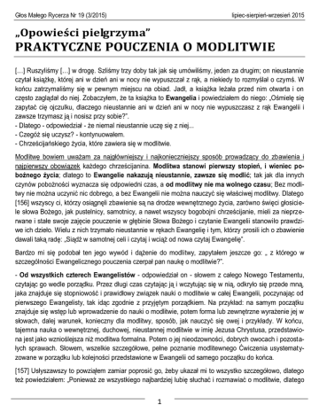 Głos Małego Rycerza Nr 19 (3/2015) lipiec-sierpień-wrzesień 2015 „Opowieści pielgrzyma” PRAKTYCZNE POUCZENIA O MODLITWIE […] Ruszyliśmy […] w drogę. Szliśmy trzy doby tak jak się umówiliśmy, jeden za drugim; on nieustannie czytał książkę, której ani w dzień ani w nocy nie wypuszczał z rąk, a niekiedy to rozmyślał o czymś. W końcu zatrzymaliśmy się w pewnym miejscu na obiad. Jadł, a książka leżała przed nim otwarta i on często zaglądał do niej. Zobaczyłem, że ta książka to Ewangelia i powiedziałem do niego: „Ośmielę się zapytać cię ojczulku, dlaczego nieustannie ani w dzień ani w nocy nie wypuszczasz z rąk Ewangelii i zawsze trzymasz ją i nosisz przy sobie?”. - Dlatego - odpowiedział - że niemal nieustannie uczę się z niej... - Czegóż się uczysz? - kontynuowałem. - Chrześcijańskiego życia, które zawiera się w modlitwie. Modlitwę bowiem uważam za najgłówniejszy i najkonieczniejszy sposób prowadzący do zbawienia i najpierwszy obowiązek każdego chrześcijanina. Modlitwa stanowi pierwszy stopień, i wieniec pobożnego życia; dlatego to Ewangelie nakazują nieustannie, zawsze się modlić; tak jak dla innych czynów pobożności wyznacza się odpowiedni czas, a od modlitwy nie ma wolnego czasu; Bez modlitwy nie można uczynić nic dobrego, a bez Ewangelii nie można nauczyć się właściwej modlitwy. Dlatego [156] wszyscy ci, którzy osiągnęli zbawienie są na drodze wewnętrznego życia, zarówno święci głosiciele słowa Bożego, jak pustelnicy, samotnicy, a nawet wszyscy bogobojni chrześcijanie, mieli za nieprzerwane i stałe swoje zajęcie pouczenie w głębinie Słowa Bożego i czytanie Ewangelii stanowiło prawdziwe ich dzieło. Wielu z nich trzymało nieustannie w rękach Ewangelię i tym, którzy prosili ich o zbawienie dawali taką radę: „Siądź w samotnej celi i czytaj i wciąż od nowa czytaj Ewangelię”. Bardzo mi się podobał ten jego wywód i dążenie do modlitwy, zapytałem jeszcze go: „ z którego w szczególności Ewangelicznego pouczenia czerpał pan naukę o modlitwie?”. - Od wszystkich czterech Ewangelistów - odpowiedział on - słowem z całego Nowego Testamentu, czytając go wedle porządku. Przez długi czas czytając ją i wczytując się w nią, odkryło się przede mną, jaka znajduje się stopniowość i prawidłowy związek nauki o modlitwie w całej Ewangelii, poczynając od pierwszego Ewangelisty, tak idąc zgodnie z przyjętym porządkiem. Na przykład: na samym początku znajduje się wstęp lub wprowadzenie do nauki o modlitwie, potem forma lub zewnętrzne wyrażenie jej w słowach, dalej warunek, konieczny dla modlitwy, sposób, jak nauczyć się owej i przykłady. W końcu, tajemna nauka o wewnętrznej, duchowej, nieustannej modlitwie w imię Jezusa Chrystusa, przedstawiona jest jako wznioślejsza niż modlitwa formalna. Potem o jej nieodzowności, dobrych owocach i pozostałych sprawach. Słowem, wszelkie szczegółowe, pełne poznanie modlitewnego Ćwiczenia usystematyzowane w porządku lub kolejności przedstawione w Ewangelii od samego początku do końca. [157] Usłyszawszy to powziąłem zamiar poprosić go, żeby ukazał mi to wszystko szczegółowo, dlatego też powiedziałem: „Ponieważ ze wszystkiego najbardziej lubię słuchać i rozmawiać o modlitwie, dlatego 1 Głos Małego Rycerza Nr 19 (3/2015) lipiec-sierpień-wrzesień 2015 tak chciałbym zobaczyć tę tajemną więź nauki o modlitwie jak najdokładniej. Pokaż mi, na Pana, wszystko to W samej Ewangelii”. Przystał na to z ochota i powiedział mi: „Otwórz swoją Ewangelię, patrz w nią i notuj to, co ci powiem” (i dał mi ołówek). - Pozwól popatrzeć w twoje notatki. - Odszukaj - zaczął mówić - najpierw u Ewangelisty Mateusza rozdział szósty i przeczytaj w nim od wiersza piątego do dziewiątego (M1 6,5-9) - widzisz to jest przygotowanie do modlitwy, albo wprowadzenie, pouczające, żeby nie na próżno i nie w hałasie, ale w samotnym miejscu, i spokoju, rozpoczynać modlitwę, i modlić się tylko o wybaczenie grzechów, i o zjednoczenie z Bogiem, a nie wymyślać liczne i zbyteczne prośby o różne życiowe potrzeby, podobnie jak to czynią poganie. Potem czytaj dalej ten rozdział od wiersza dziewiątego do czternastego (Mt 6,9-14). Tu przedstawiono formę modlitwy, tj. w jakich słowach należy ją wymawiać. W niej niezwykle mądrze zebrano wszystko to, co konieczne i potrzebne dla naszego życia. Podążając dalej, czytając czternasty i piętnasty wiersz tegoż rozdziału zobaczysz warunek, który należy spełnić, aby modlitwa była prawdziwa, bowiem bez błagania przez nas tych, którzy znieważają nas, Pan nie odpuści nam naszych grzechów. Przeszedłszy do siódmego rozdziału, znajdziesz w wierszach od siódmego do dwunastego środki prowadzące do powodzenia w modlitwie i poparcie w nadziei: „ proście, szukajcie, kołaczcie ”; to usilne wyrażenie wyobraża częstotliwość [158] modlitwy i główne ćwiczenie w owej tak, żeby modlitwa nie tylko towarzyszyła podczas wszystkich zajęć, ale nawet by przewyższała je w każdym czasie. To stanowi główną cechę modlitwy… Przykład tego zobaczysz w czternastym rozdziale u Ewangelisty Marka od trzydziestego drugiego do czterdziestego wiersza, gdzie sam Jezus Chrystus wielokrotnie powtarza jedne i tę gamę Słowa modlitwy. Podobny przykład natręctwa modlitwy przedstawia i Ewangelista Łukasz (Łk 11,5-14) w przypowieści o natrętnym błaganiu przyjaciela, także i w wielokrotnym, dokuczliwym błaganiu wdowy u sędziego (Łk 18,1-15) wyobrażające nakazy Jezusa Chrystusa, że należy zawsze o każdej porze i w każdym miejscu modlić się i nie ustawać, tj. nie lenić się. Po tym szczegółowym pouczeniu jeszcze zostaje odkryta w Ewangelii według Świętego Jana prawdziwa nauka tajemnej wewnętrznej modlitwy serca. Po pierwsze przedstawia ono mądrą historie rozmowy Jezusa Chrystusa z Samaryt